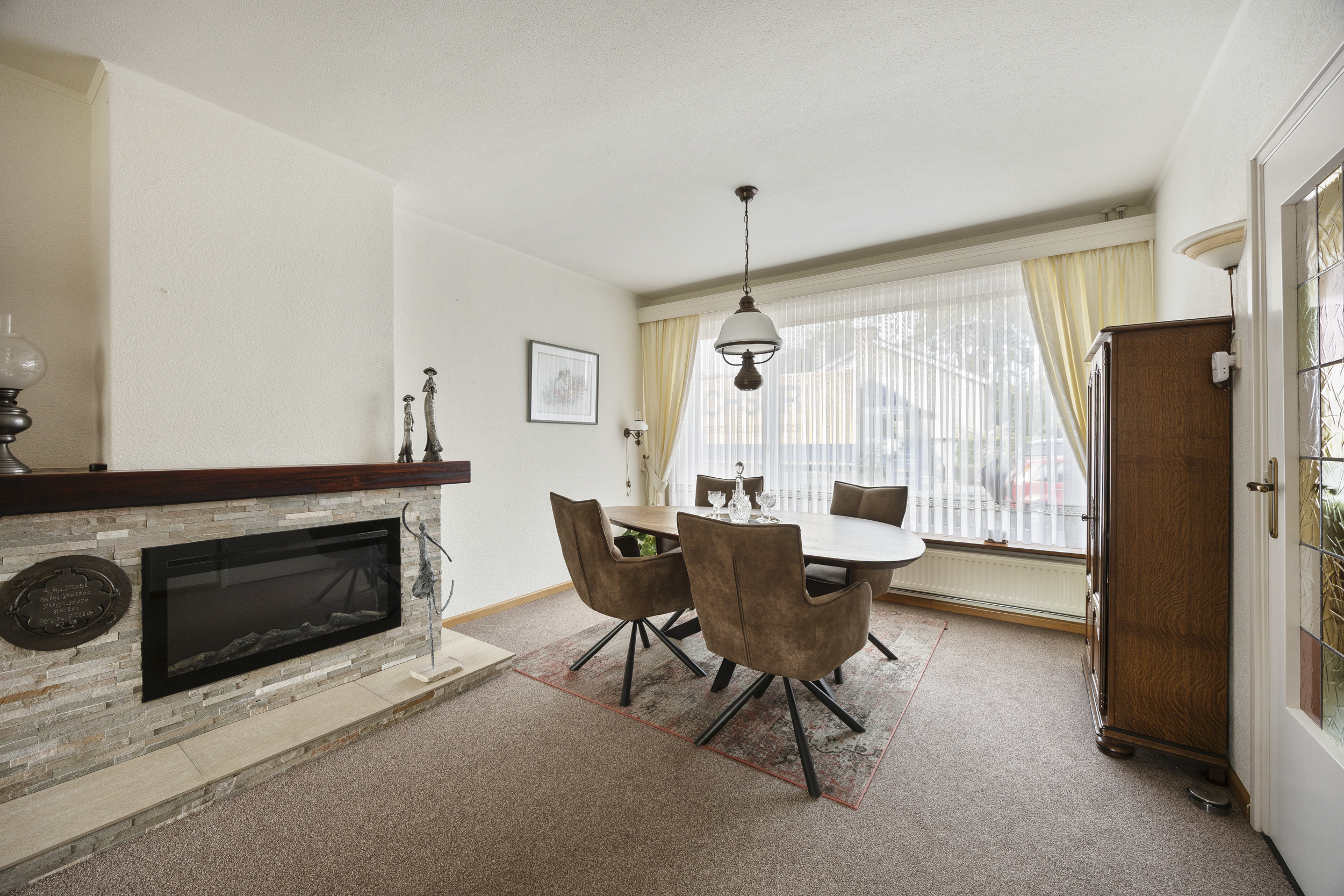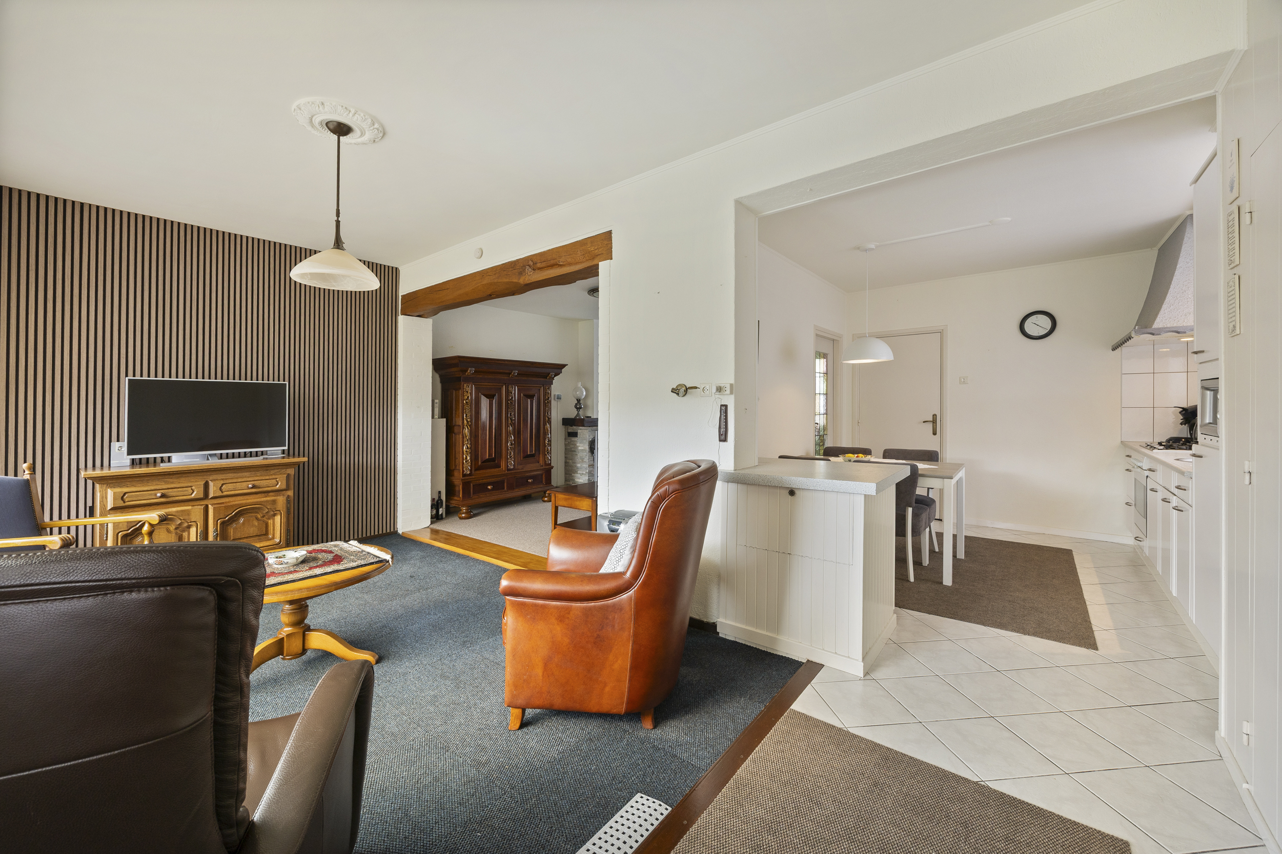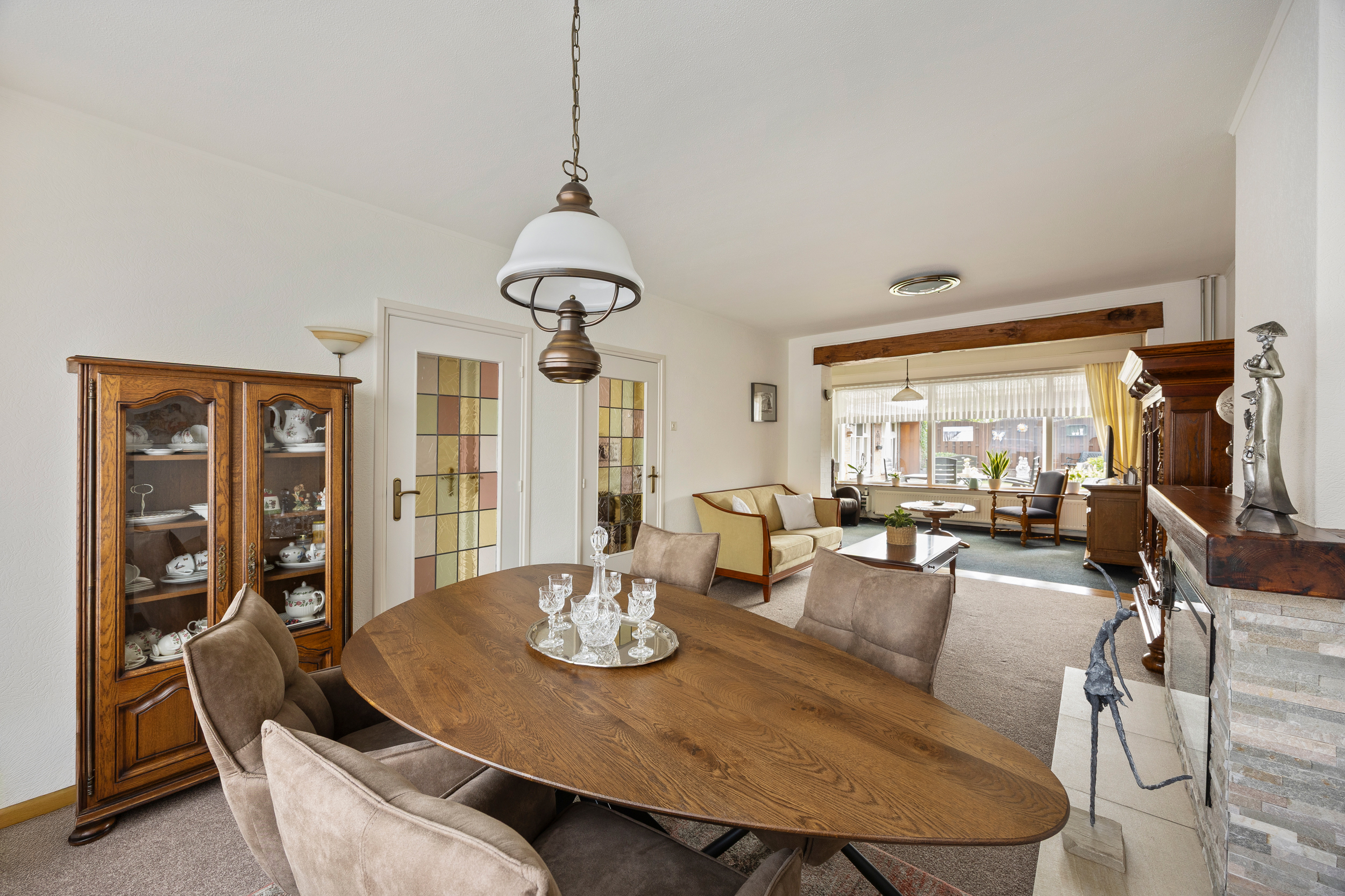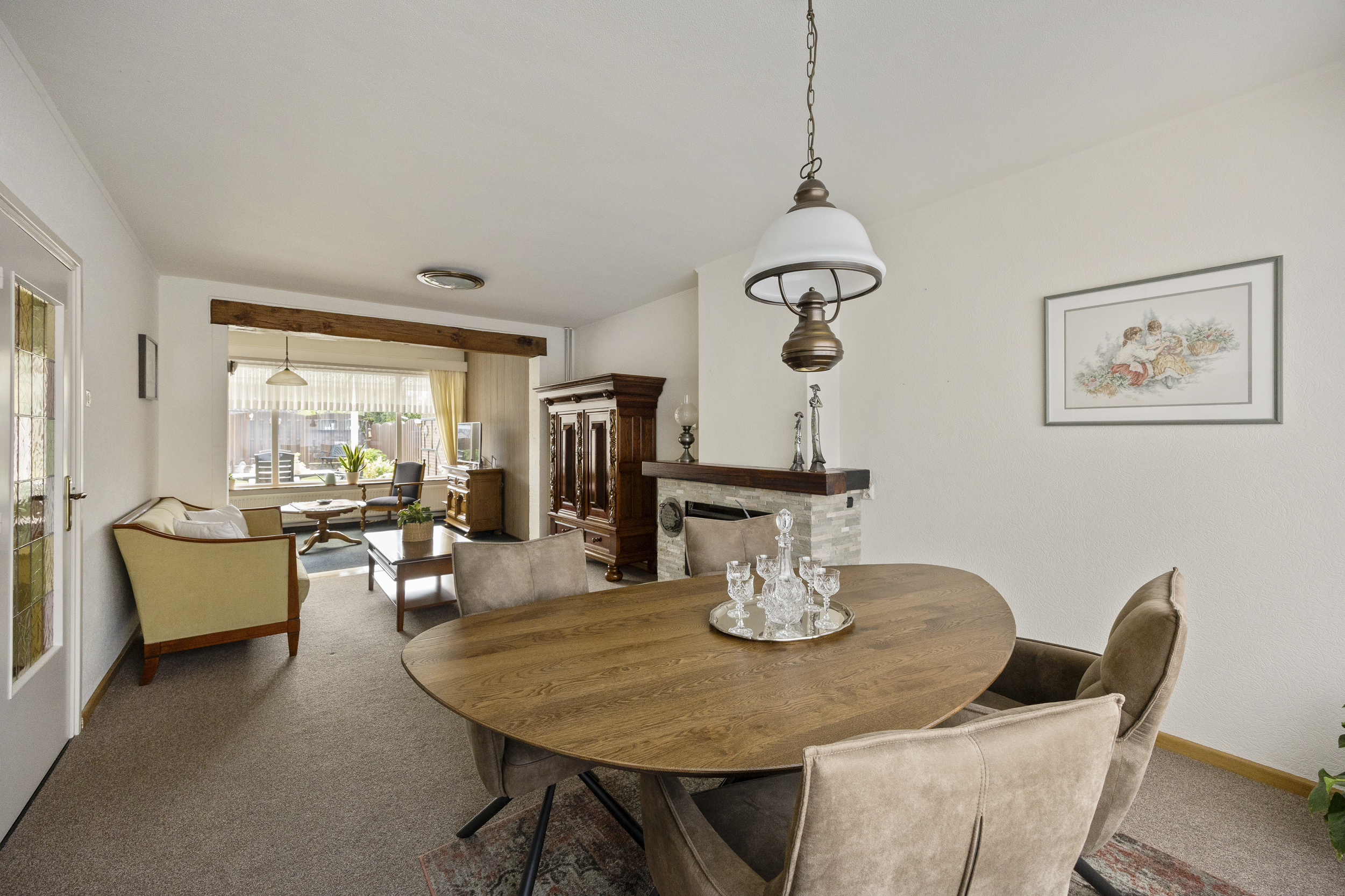 schouw met sierhaard. De massief eikenhouten balk in het plafond zorgt voor een extra mooie uitstraling. De grote