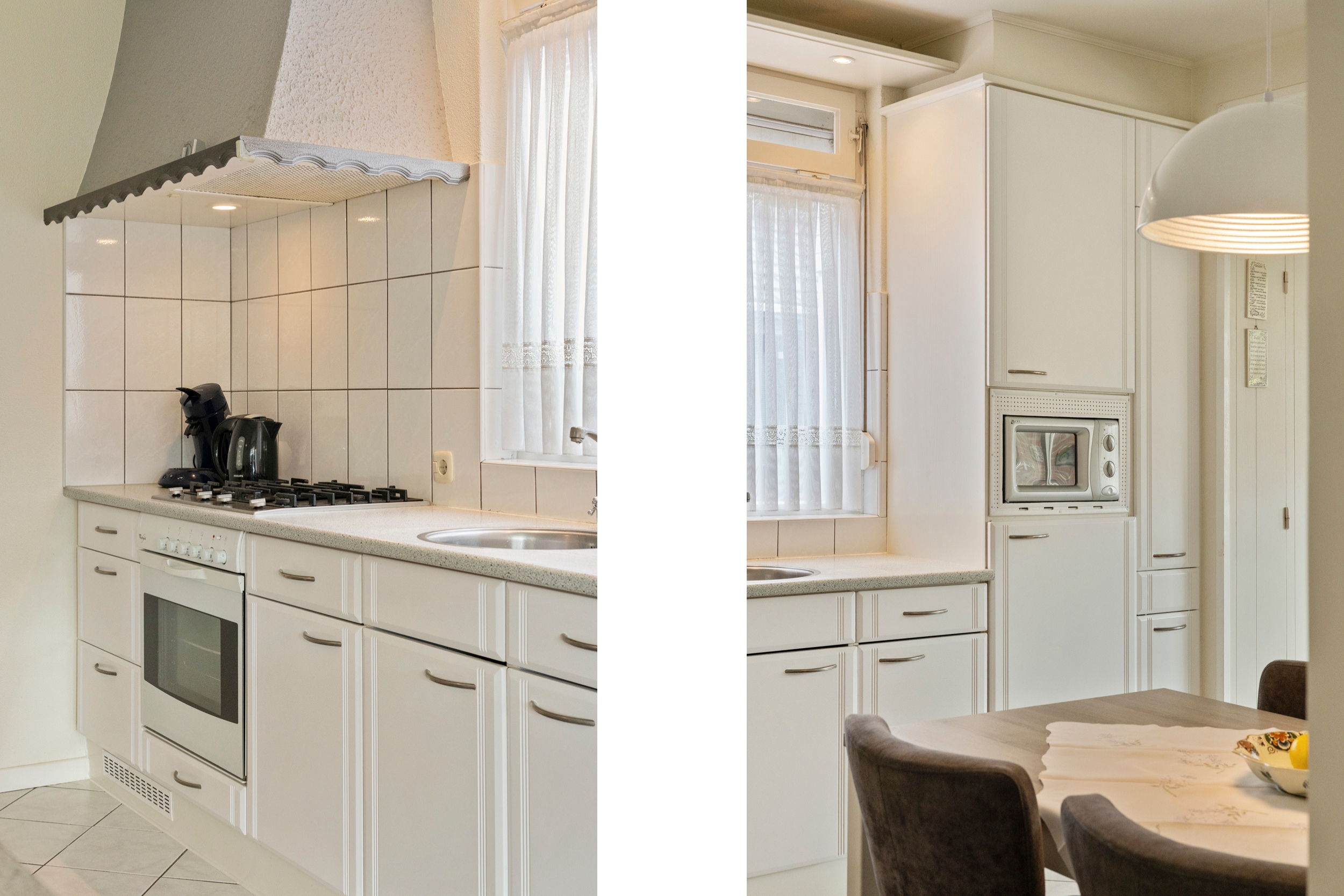 gaskookplaat, afzuigkap, oven, magnetron en koelkast.