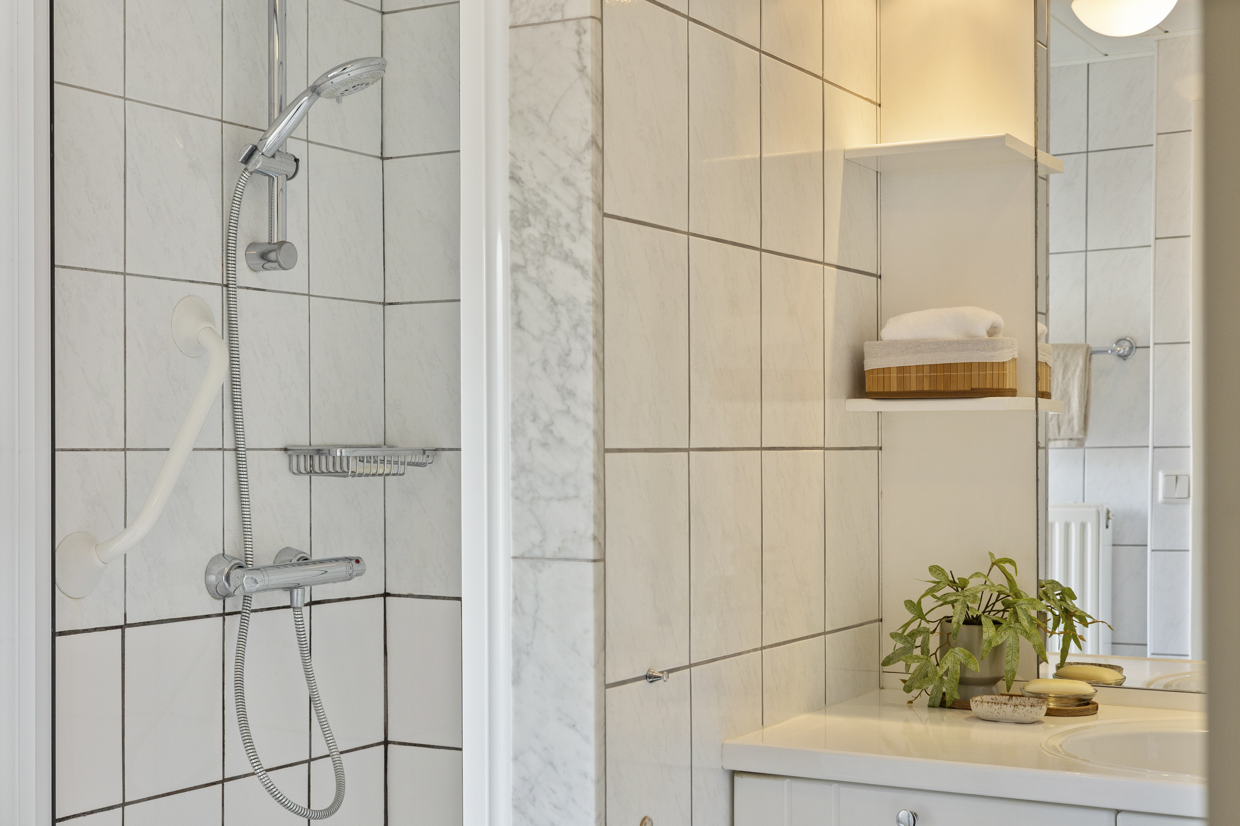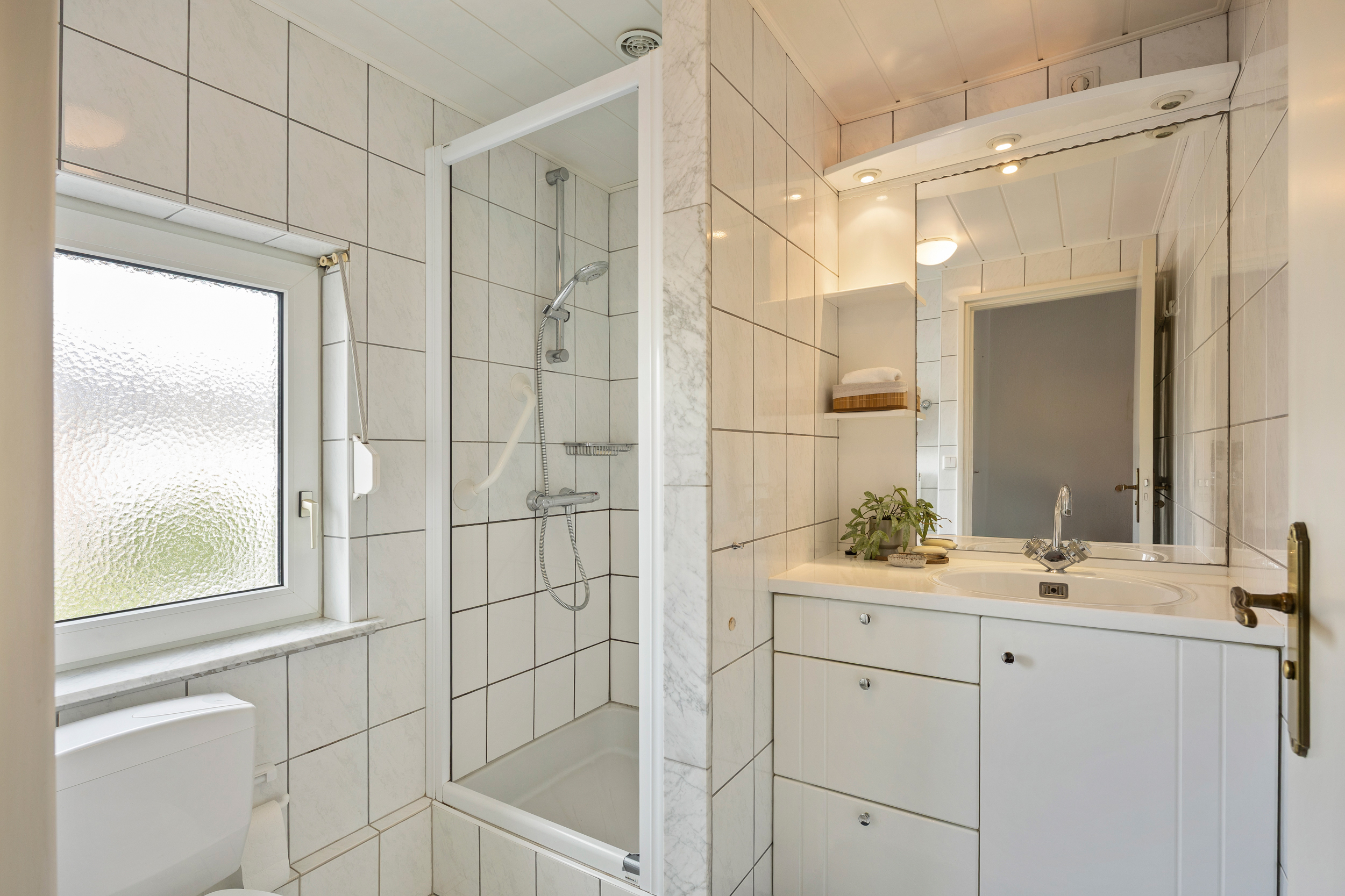 • Badkamer: De keurig verzorgde en neutraal afgewerkte badkamer is voorzien van een fijne douche, een toilet en