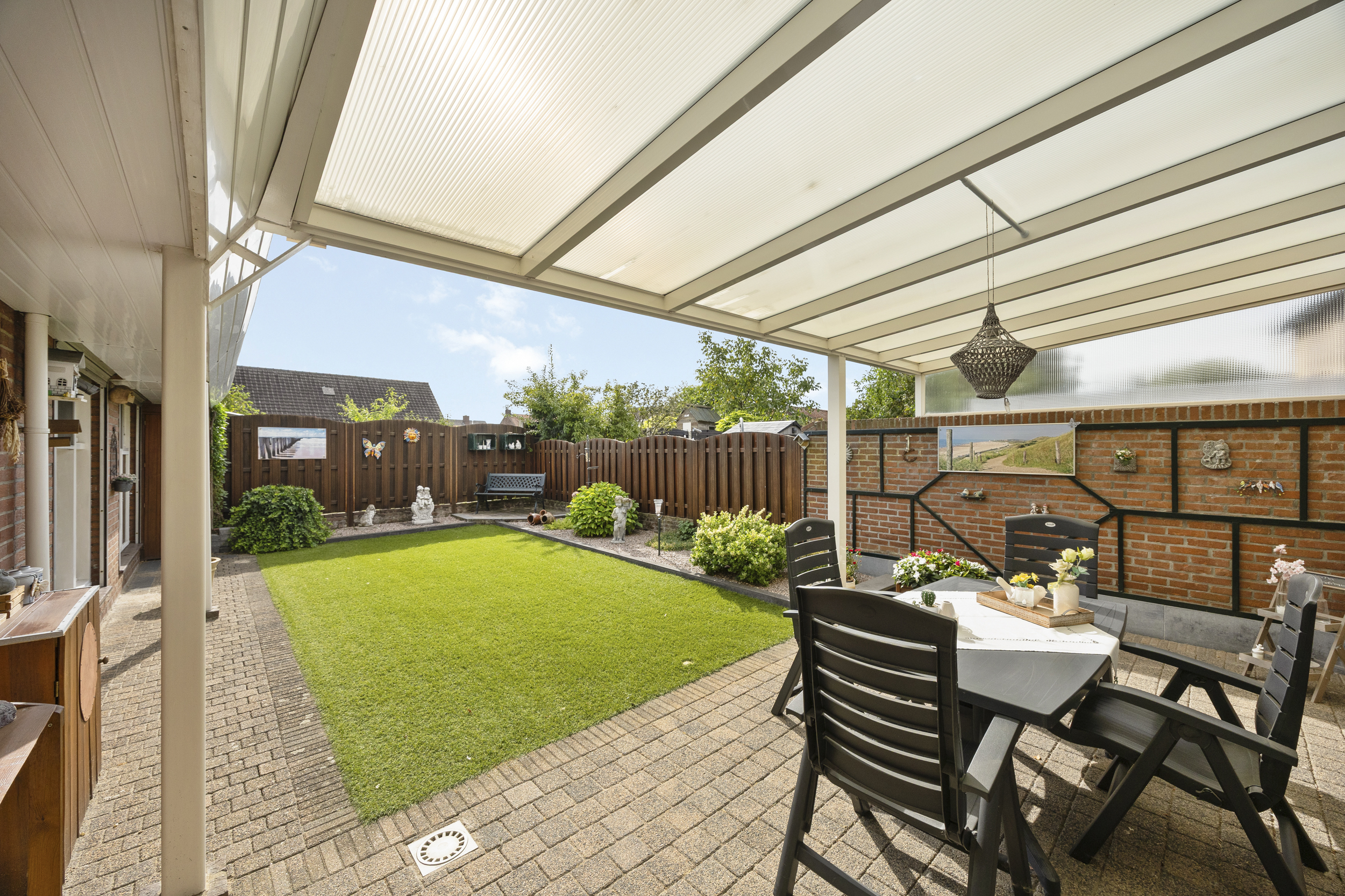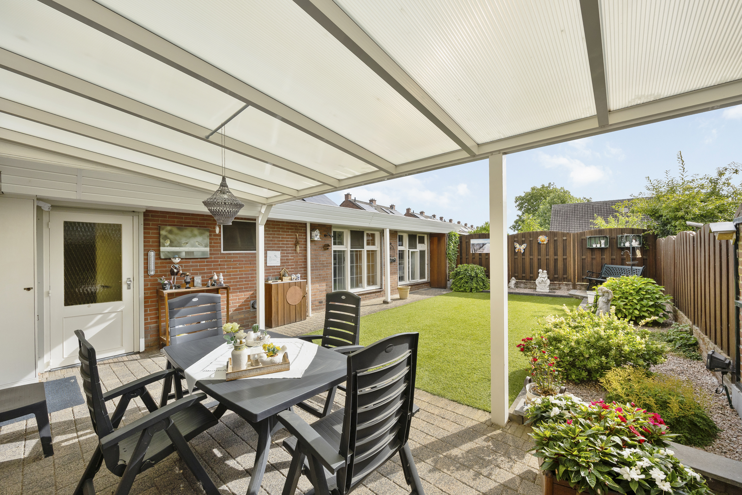 De achtertuin maakt het plaatje helemaal compleet. Met 250m² aan oppervlakte voelt het perceel ruim en praktisch aan. De achtertuin is ca.12meter diep en 6meter breed en beschikt over een fijne stuk gazon (kunstgras) en mooie borders. De fraaie aluminium overkapping (611 x 305cm.) is zeer zeker de ideale plek om van deze mooie te kunnen gaan genieten. Door de gunstige ligging en situering op het zuidoosten heeft de tuin een goede bezonning en optimale privacy te bieden.