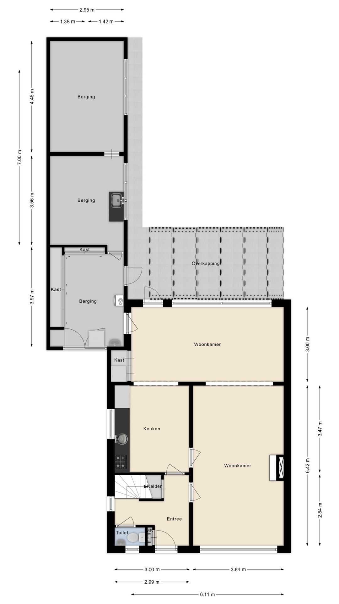 • Entree/hal: Ruime hal met toilet, meterkast en toegang tot de kelderkast.