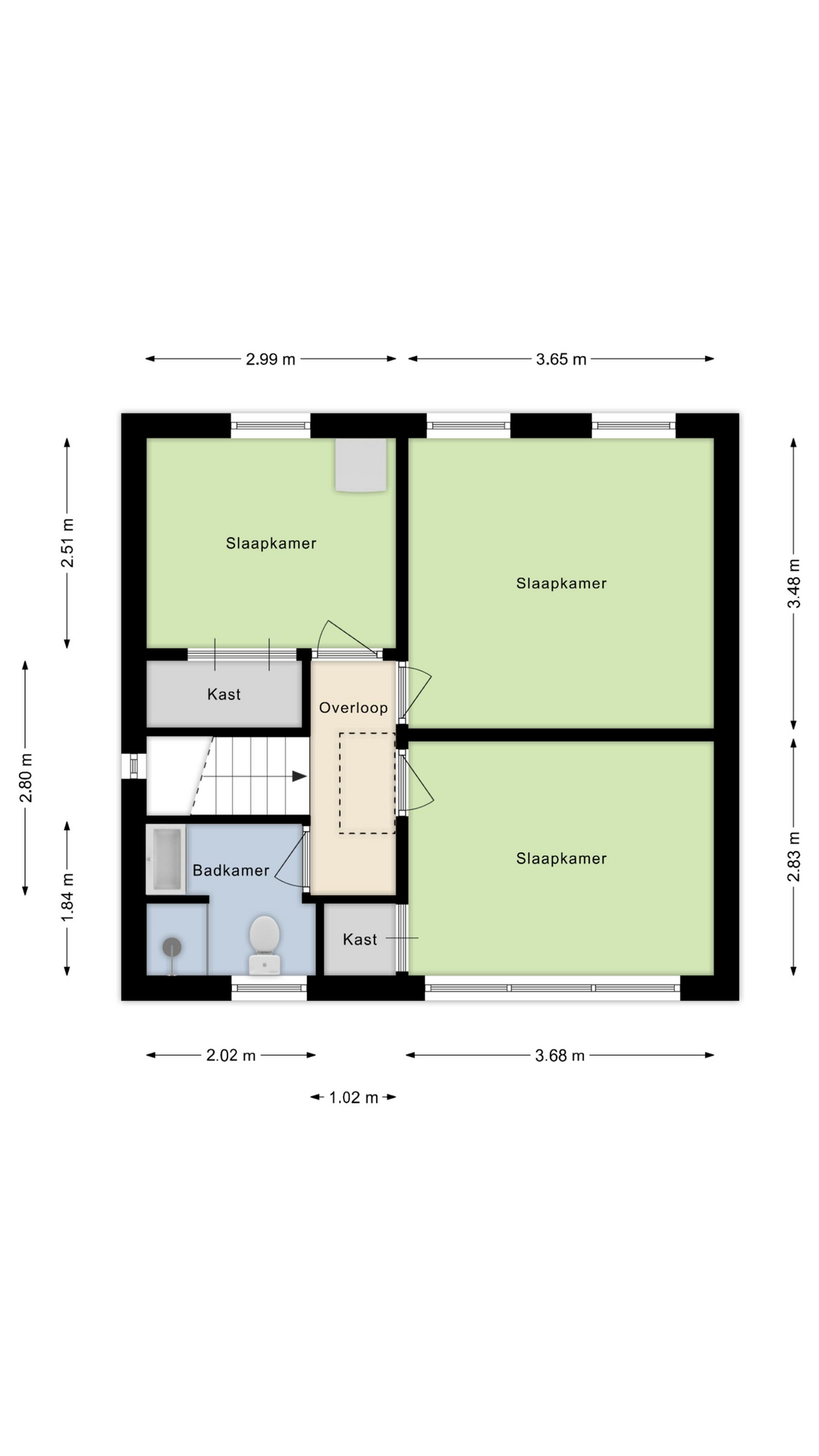 • Overloop: Overloop met toegang tot drie slaapkamers en comfortabele badkamer.