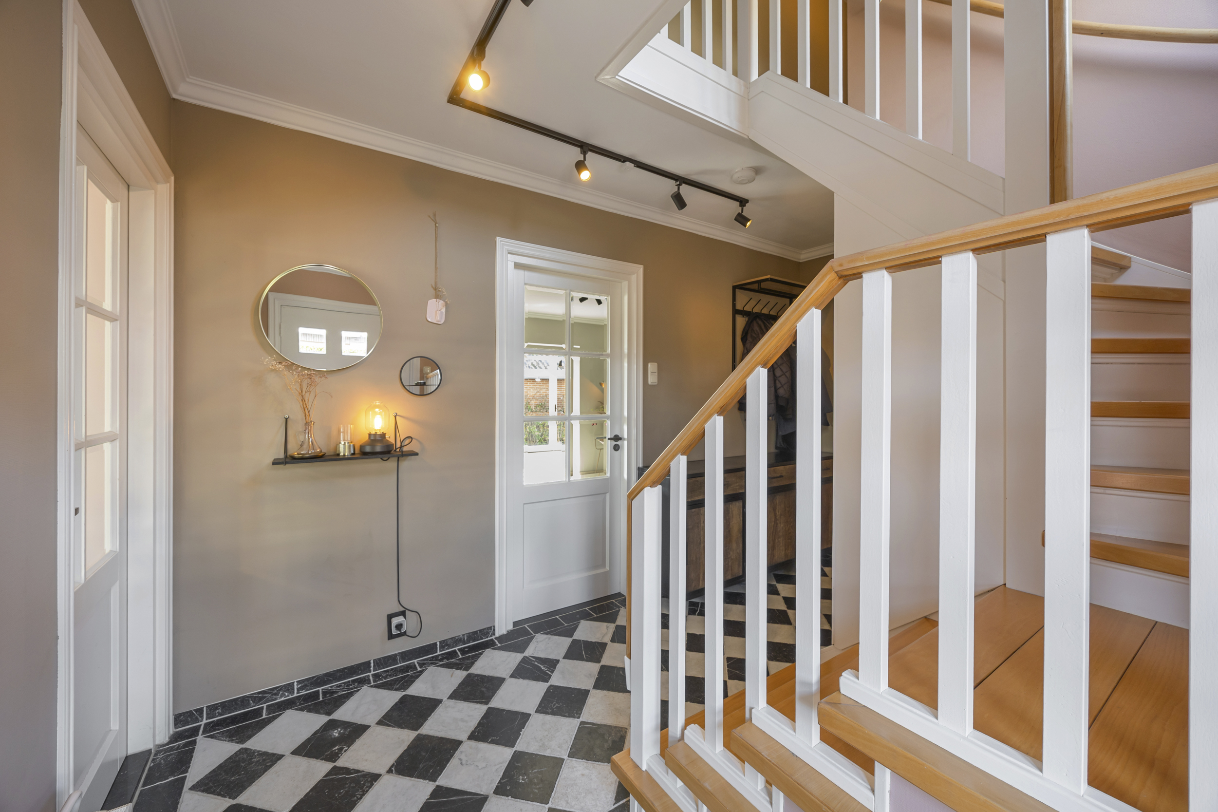 De entree van de woning biedt een prettige binnenkomst via een ruime hal met garderobe, het gastentoilet en toegang tot zowel de kelder als een kantoorruimte/ slaapkamer. De authentieke trap zorgt voor een fraaie opgang naar de eerste verdieping.