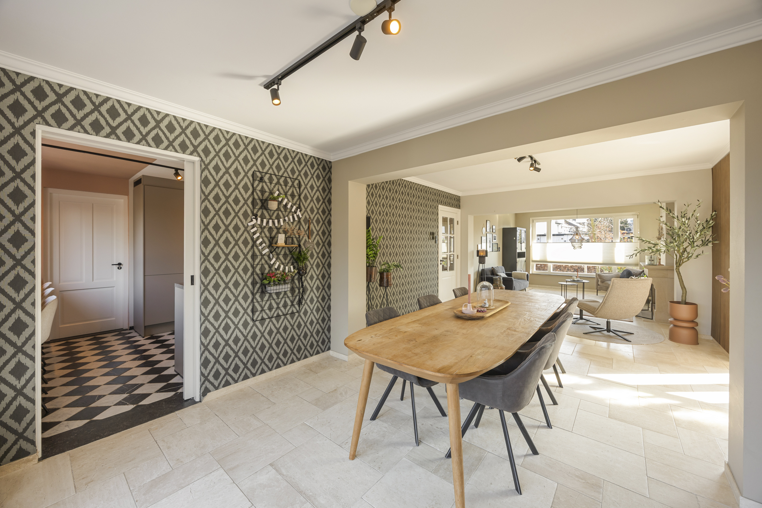 De gehele leefruimte is afgewerkt met een eigentijdse tegelvloer met vloerverwarming, wat zorgt voor een warme en tijdloze uitstraling.