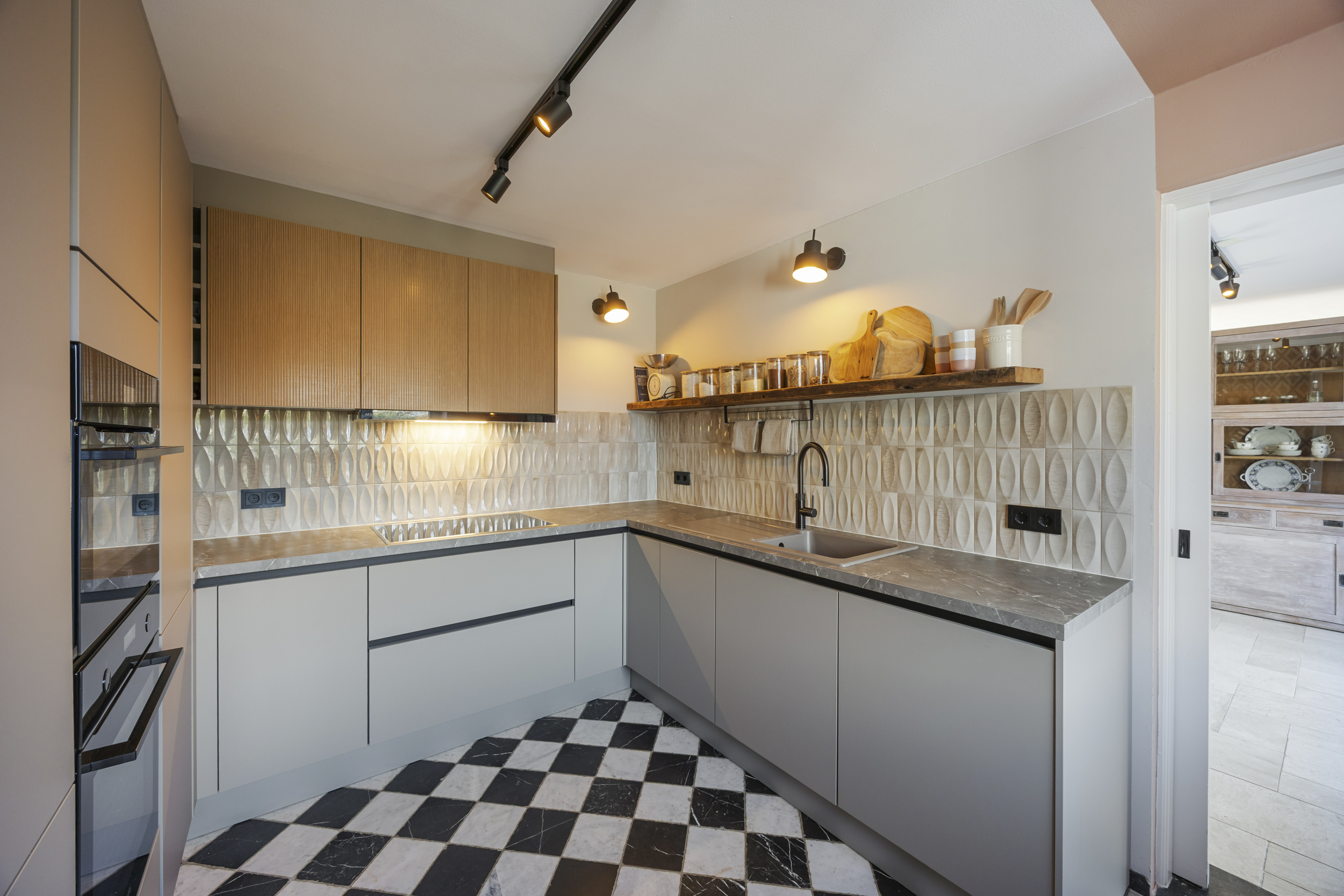 De separate keuken is ruim opgezet (circa 12m²) en ingericht met een recent in 2025 vernieuwde, luxe en modern vormgegeven installatie. Deze prachtige keuken is voorzien van veel opbergruimte en de navolgende apparatuur: inductie kookplaat, afzuigkap, koelkast, oven, combi-oven, vaatwasser en Quooker kraan. Erg leuk detail in deze ruimte is het fraaie houten blad aan de raamzijde dat bijvoorbeeld dienst kan doen als tafelblad voor het smeren van ‘een snelle boterham’.