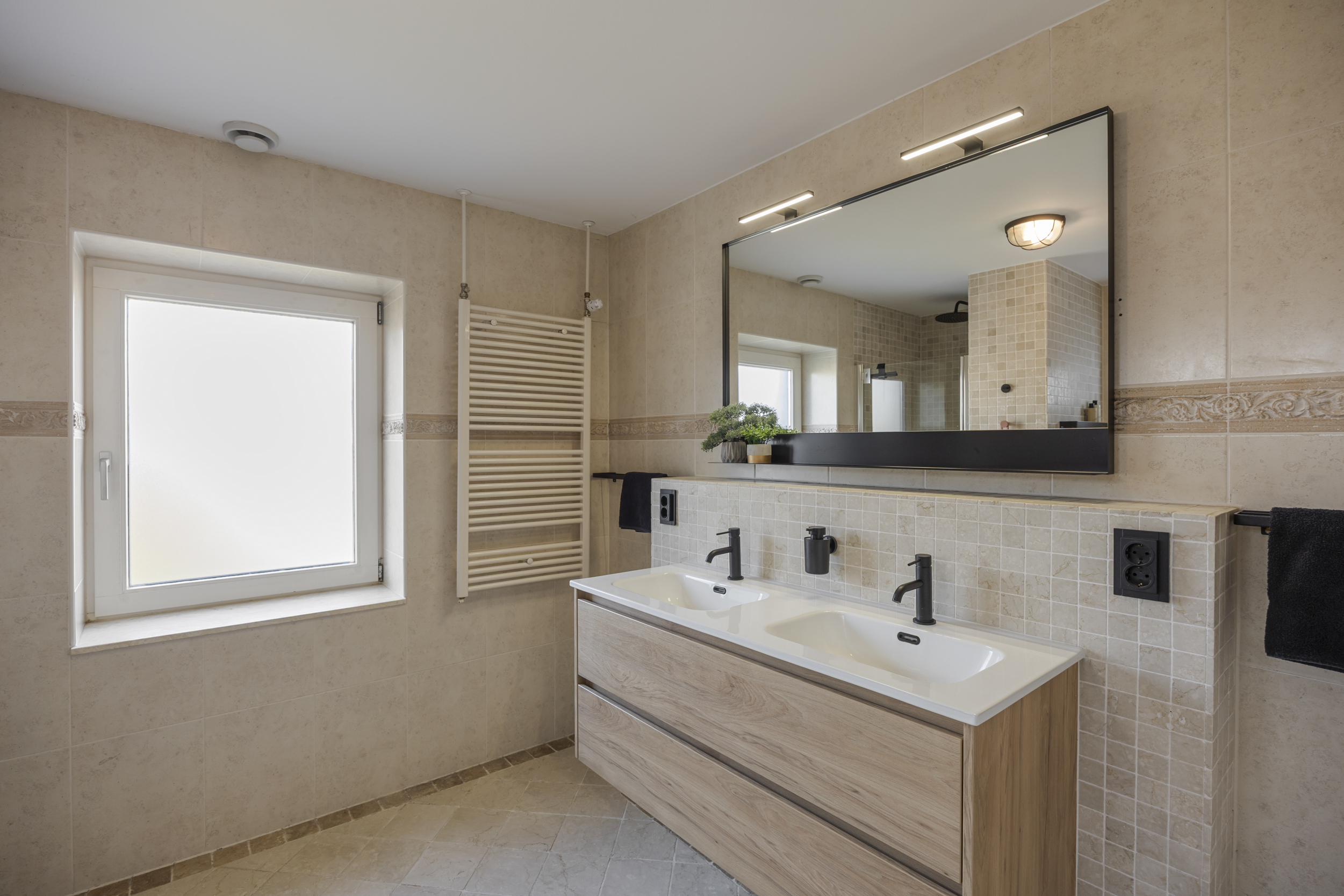 De ruime badkamer is voorzien van een ligbad, een aparte inloopdouche en een dubbele wastafel met meubel. Voor extra comfort is hier elektrische vloerverwarming aanwezig.