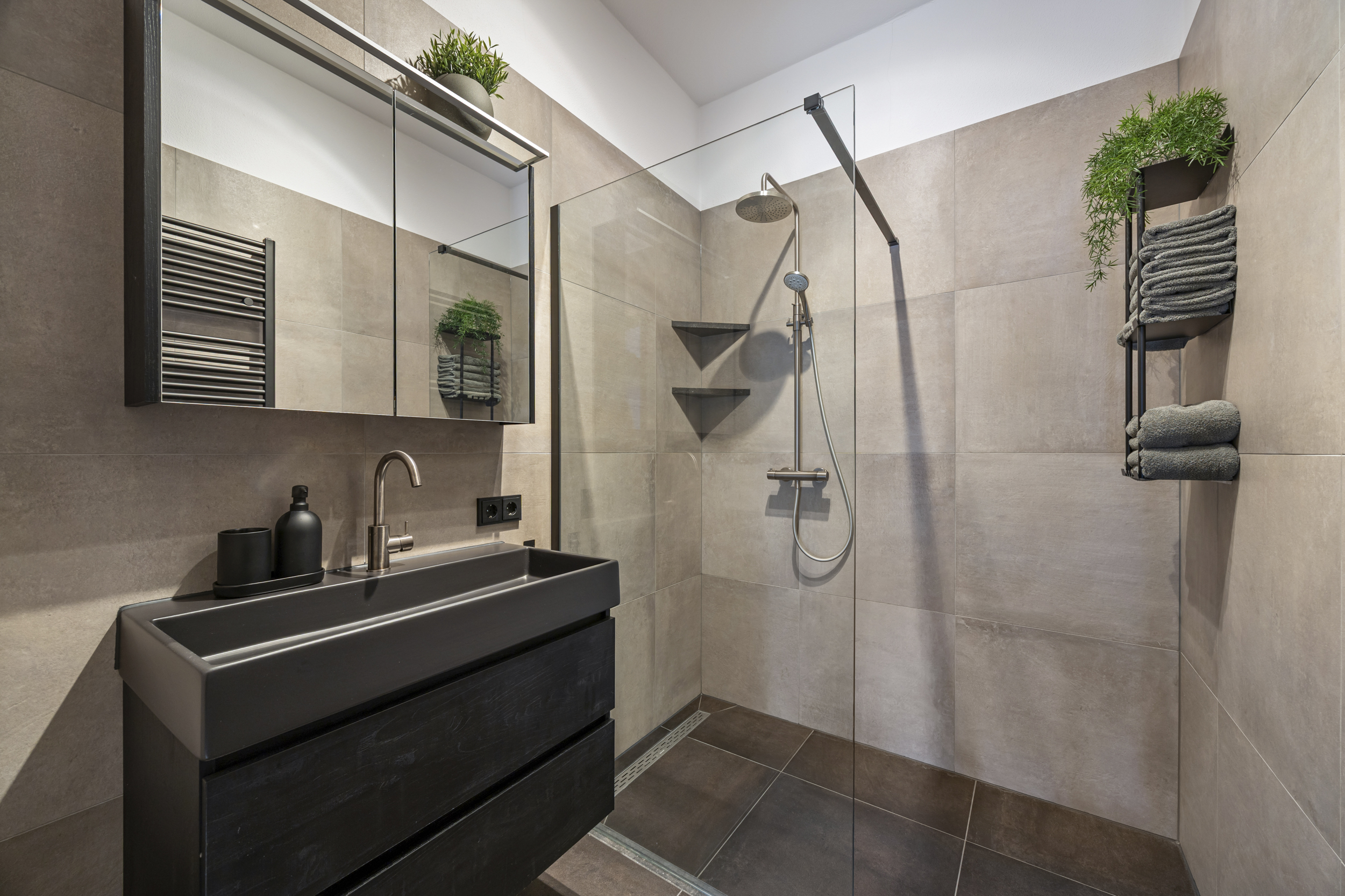 De luxe, moderne badkamer is voorzien van een inloopdouche, grote wastafel met meubel, elektrische vloerverwarming en een elektrische designradiator – comfortabel en stijlvol afgewerkt.