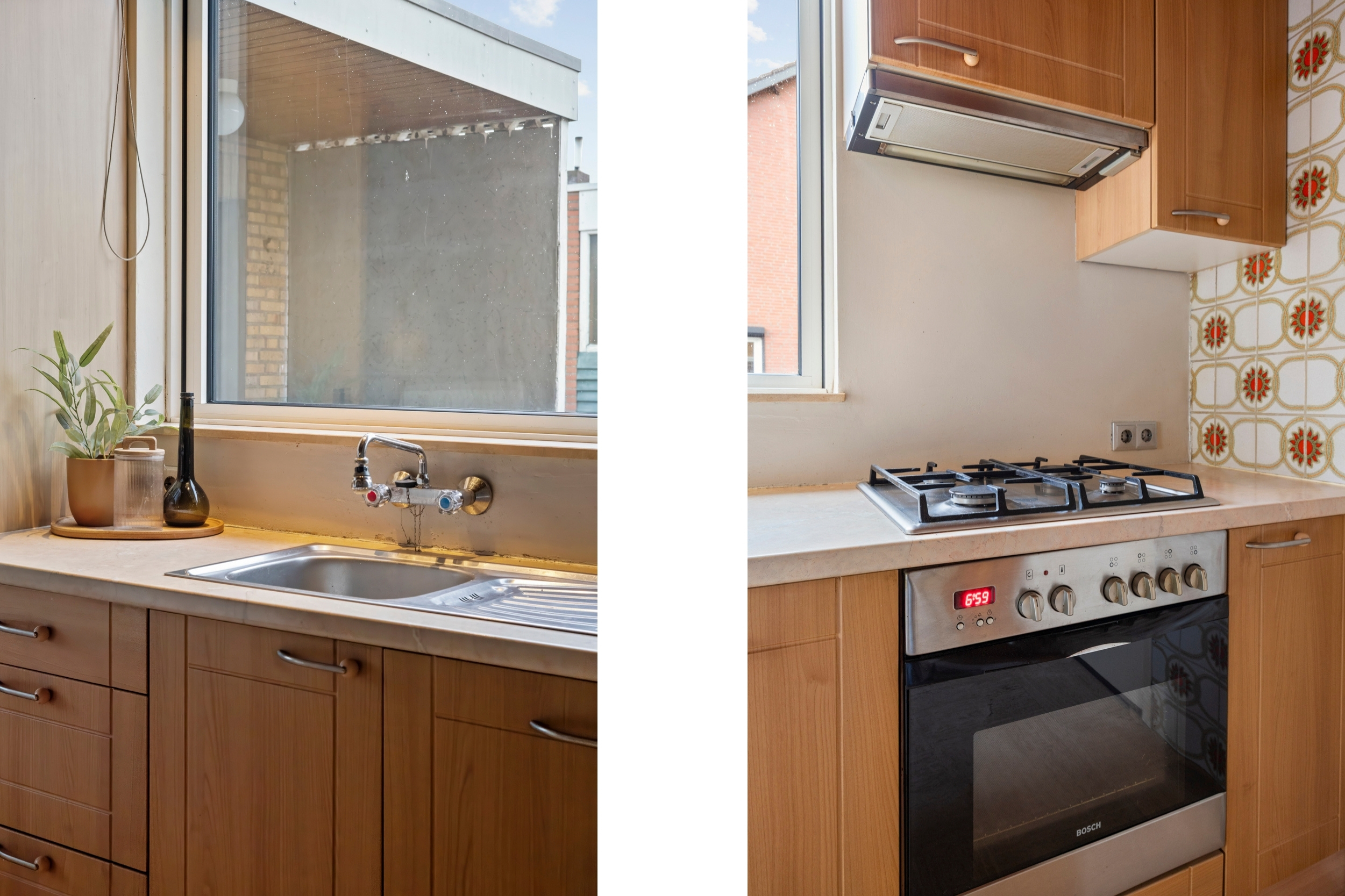 Aansluitend bevindt zich de open keuken van 9m², die in directe en open verbinding staat met de woonkamer. De keuken is geplaatst in 2011 en voorzien van een eigentijdse keukeninstallatie. De opstelling biedt voldoende werk- en bergruimte en is uitgerust met de volgende inbouwapparatuur: gaskookplaat, afzuigkap, oven, vaatwasser en koelkast. Vanuit de keuken is er een directe verbinding met de serre en de inpandige garage.