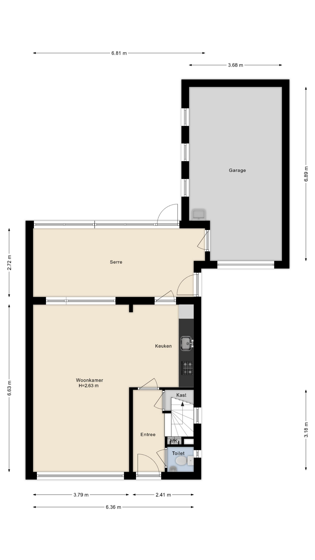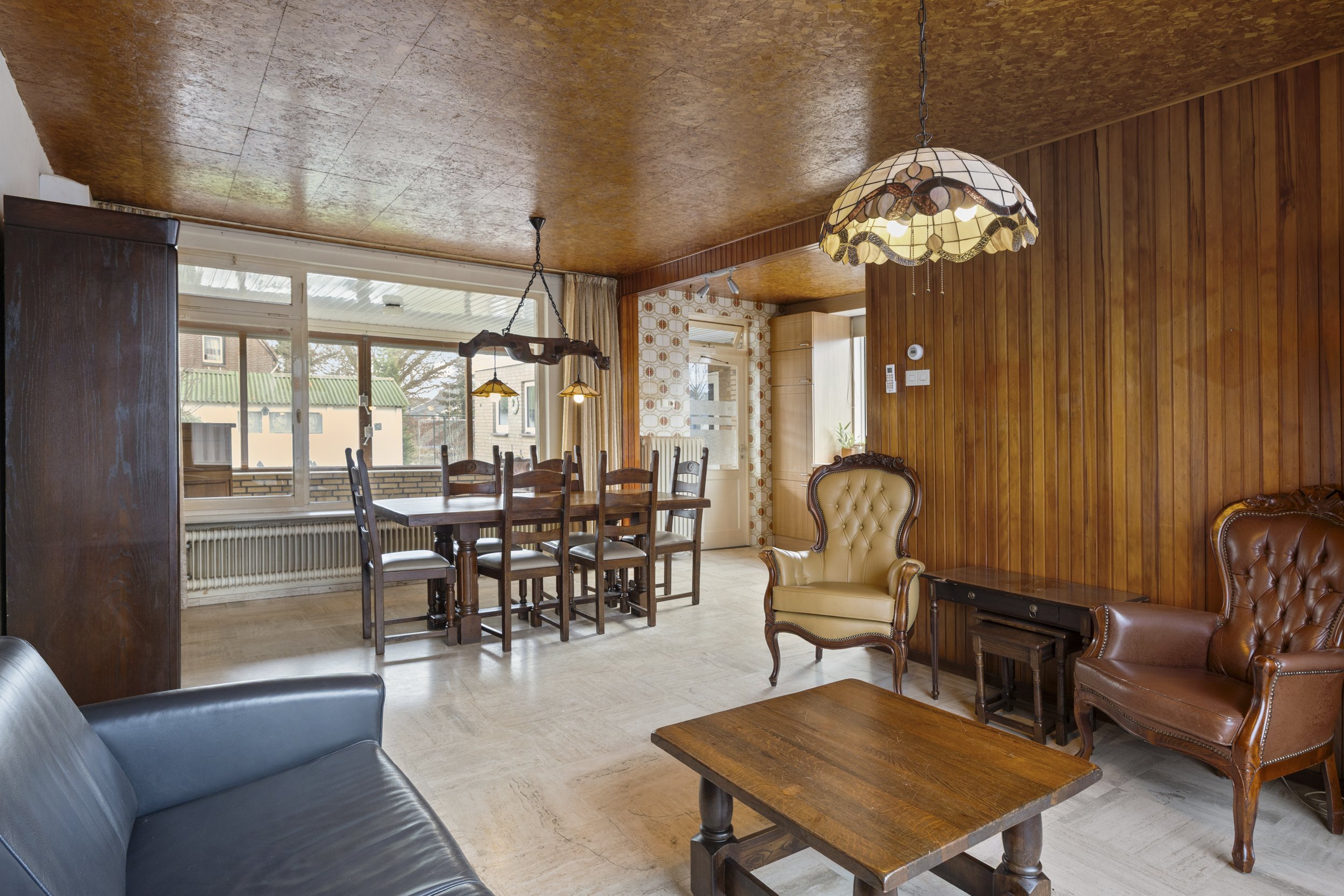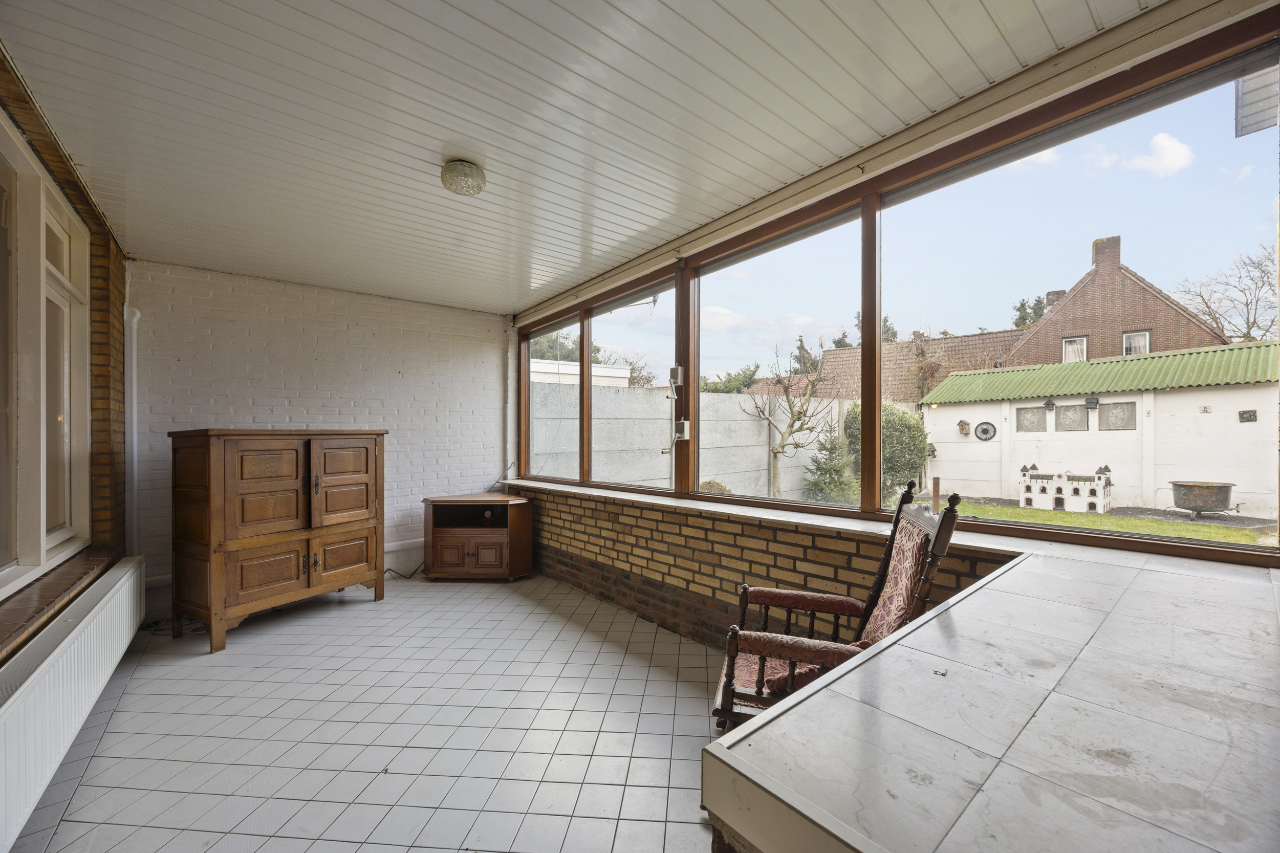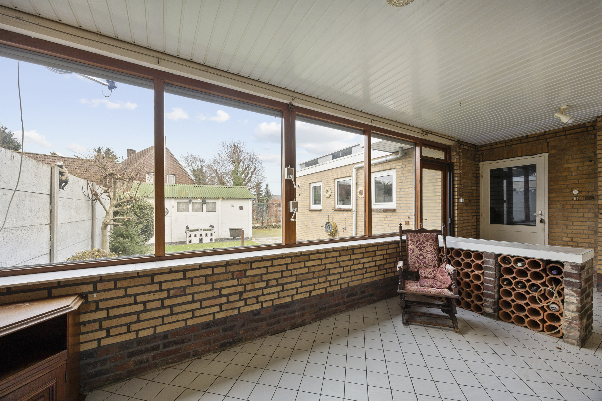 Vanuit de serre heeft u toegang tot de tuin, de oprit én de inpandige stenen garage, wat het dagelijks gebruik bijzonder comfortabel maakt.