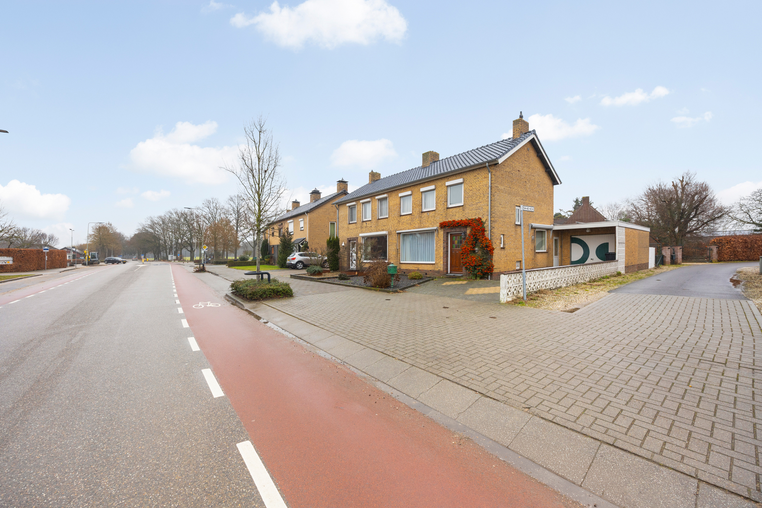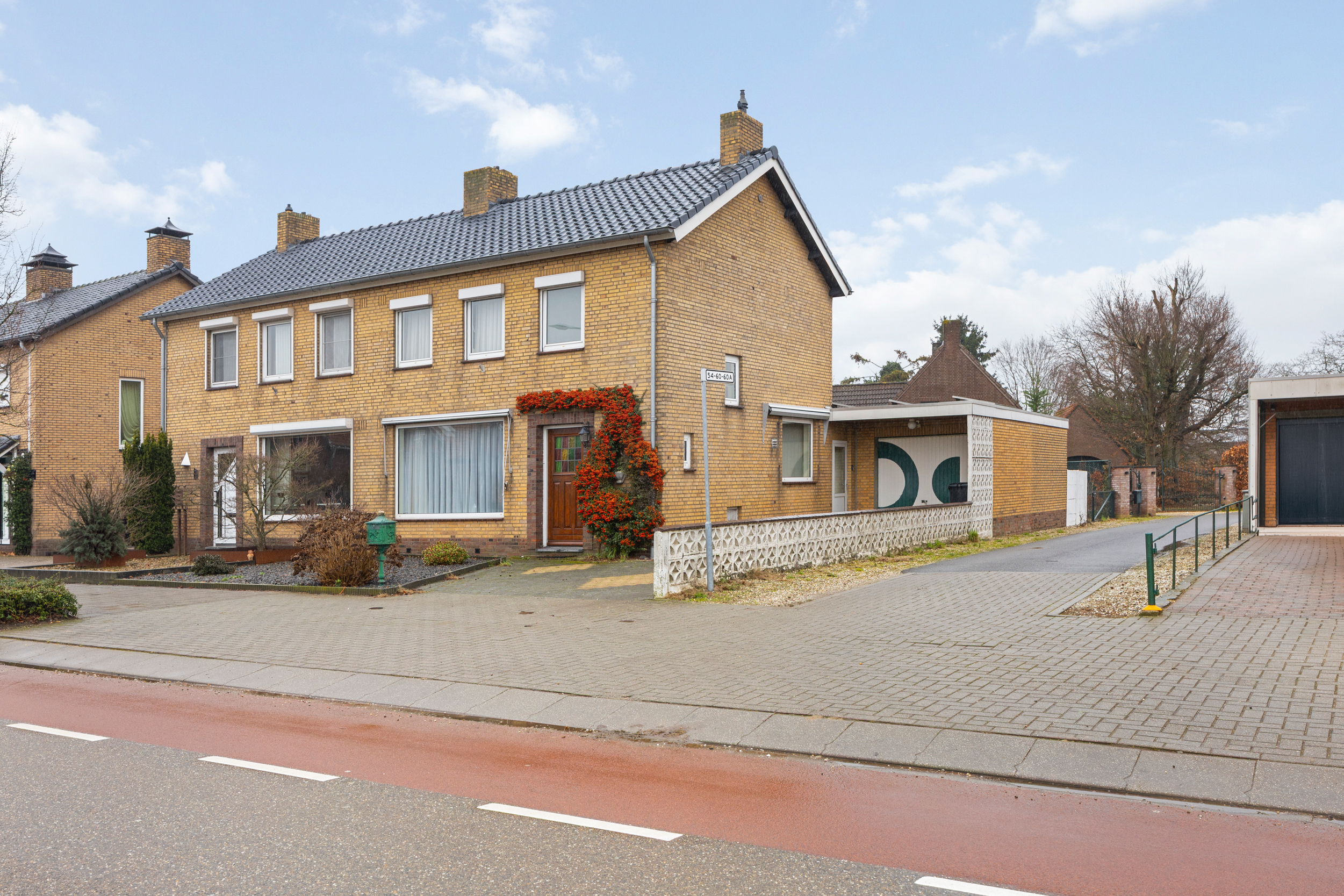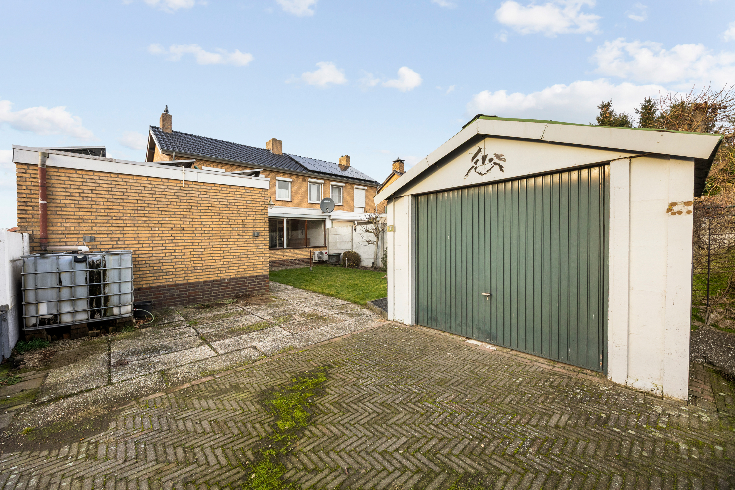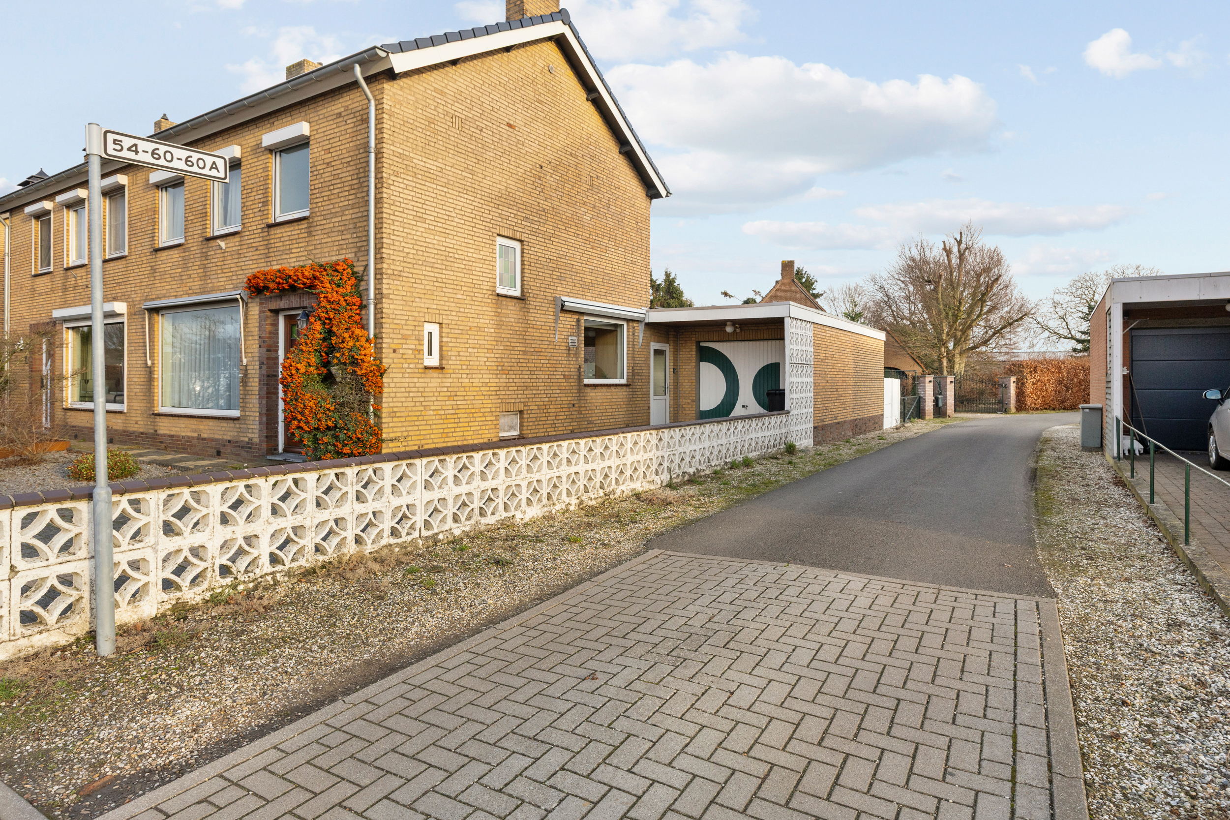 De ruime oprit biedt meer dan voldoende parkeergelegenheid op eigen terrein en is in het dagelijks gebruik bijzonder praktisch. Het zijpad aan de rechterzijde van de woning zorgt voor een goede bereikbaarheid van het perceel en de tweede garage.
