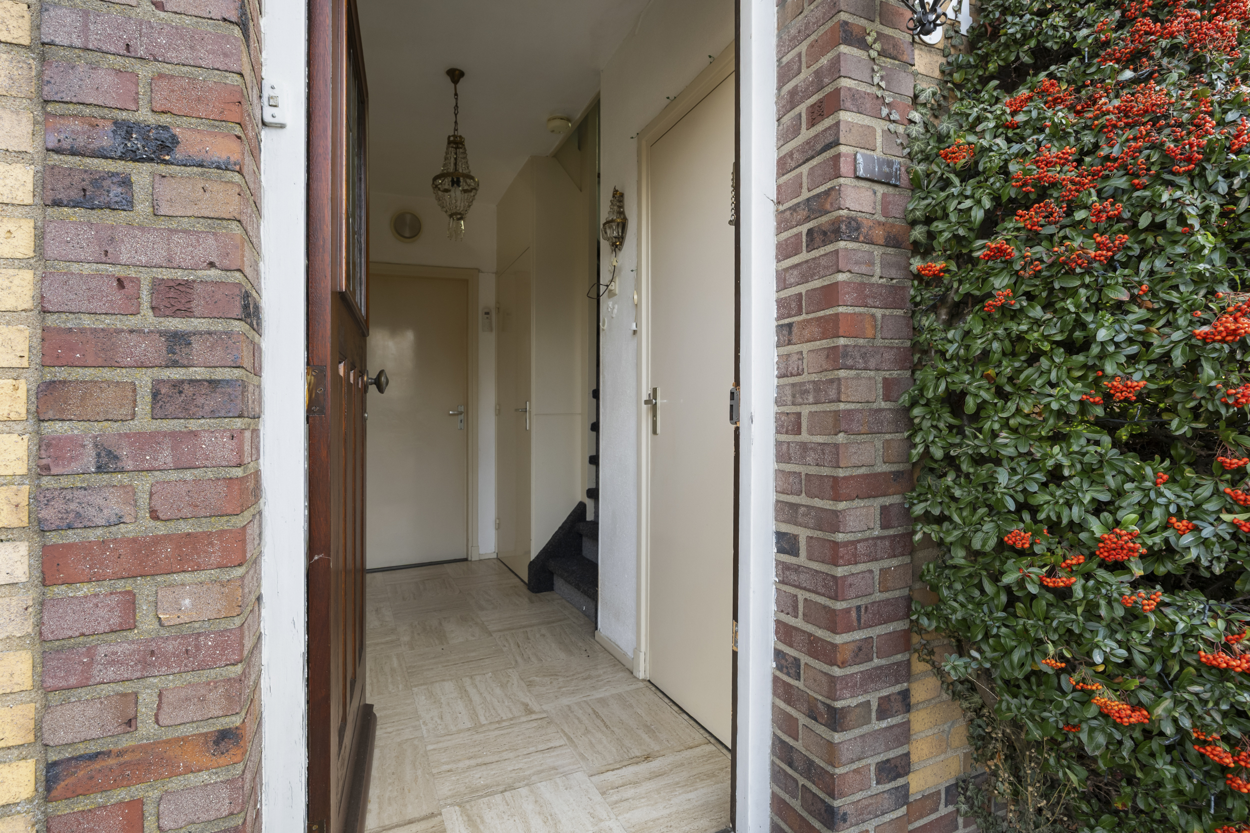 Via de entree betreedt je de woning in de hal, waar zich de meterkast, een praktische garderoberuimte, de trapopgang naar de eerste verdieping, een trapkast en het gastentoilet bevinden. Vanuit de hal heb je direct toegang tot de woonkamer.