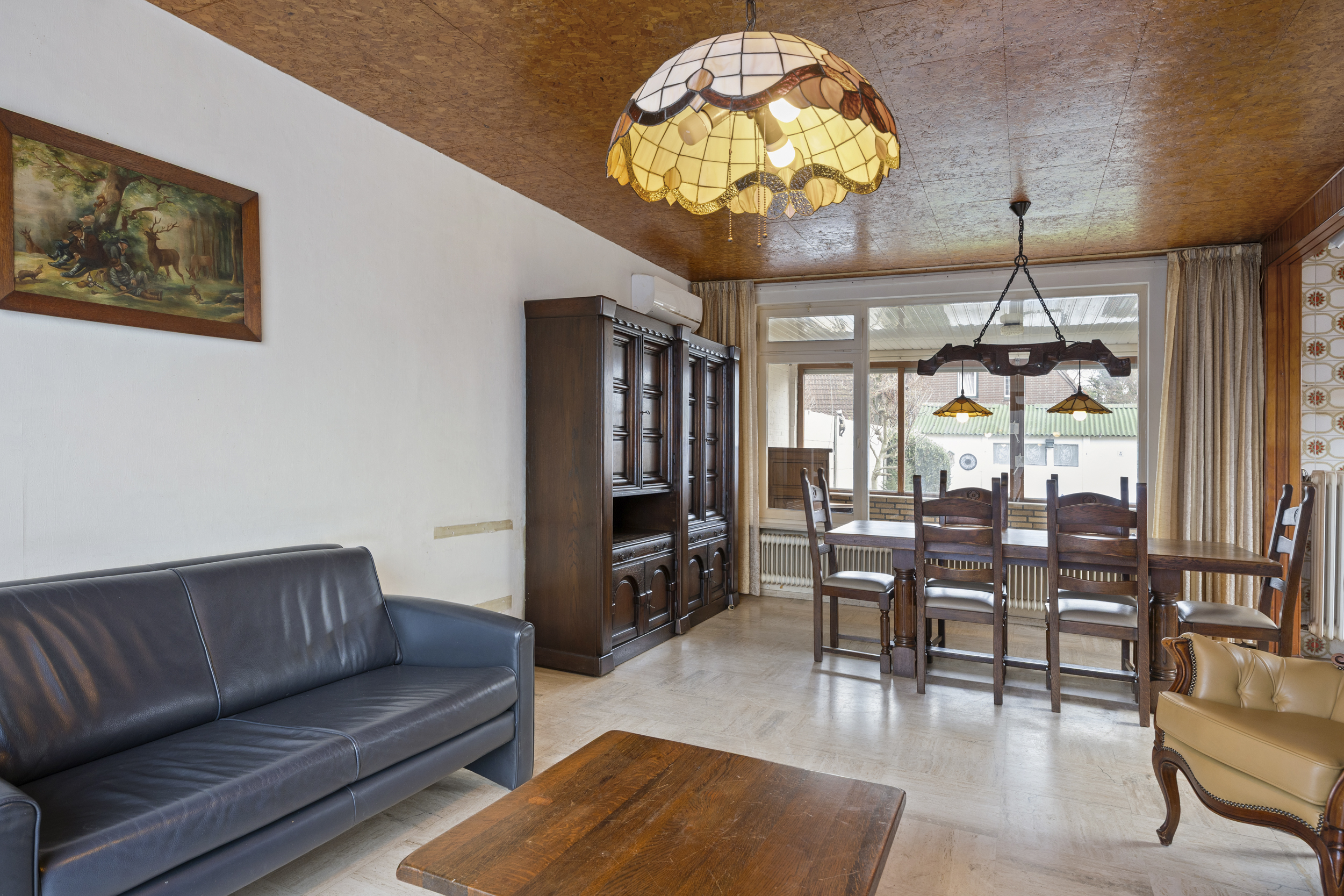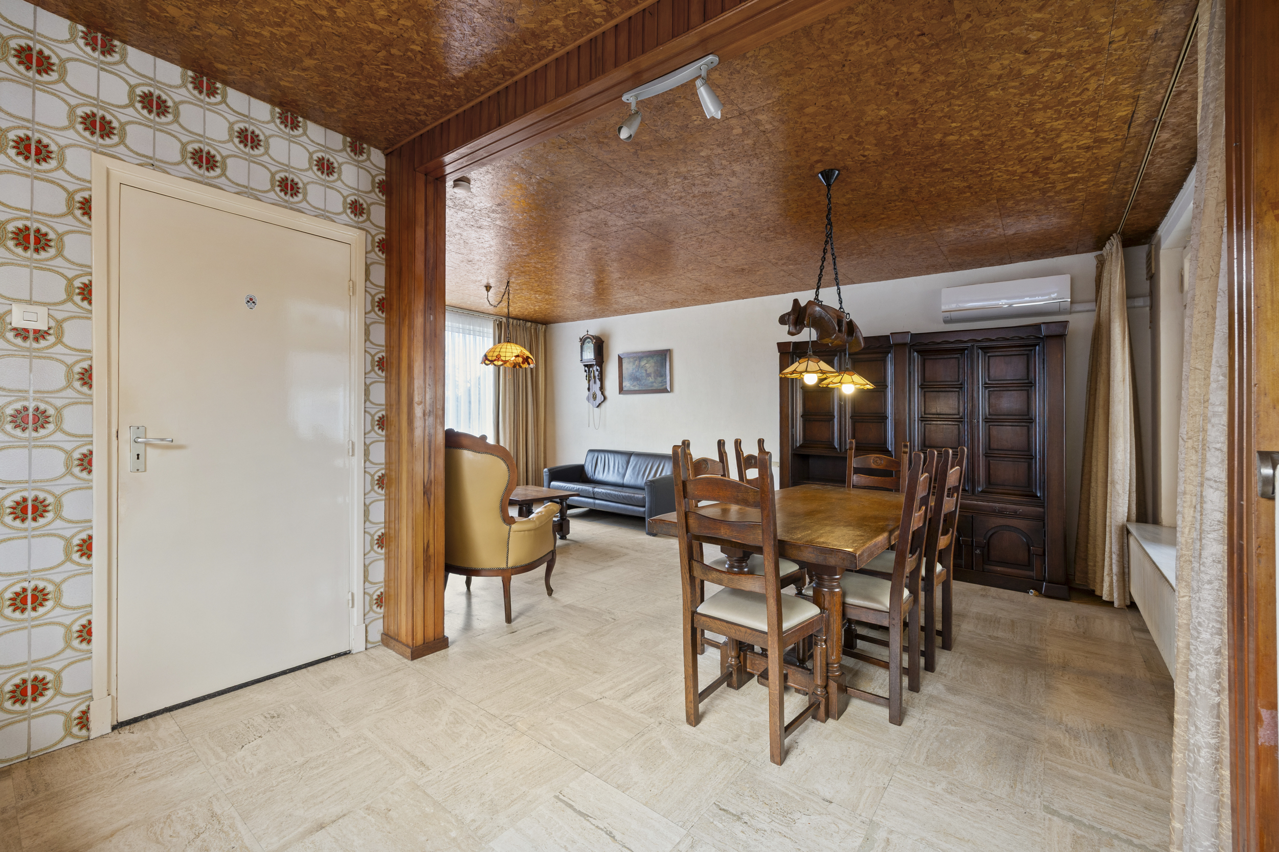 De ruime L-vormige woonkamer van 25 m² vormt het hart van de woning en biedt volop leefruimte voor zowel een comfortabele zithoek als een ruime eethoek. De woonkamer is afgewerkt met een travertin tegelvloer, wat zorgt voor een warme en karaktervolle uitstraling. Dankzij de gunstige maatvoering en de grote raampartijen is de ruimte licht en flexibel in te delen. De woonruimte is uitgerust met airconditioning.
