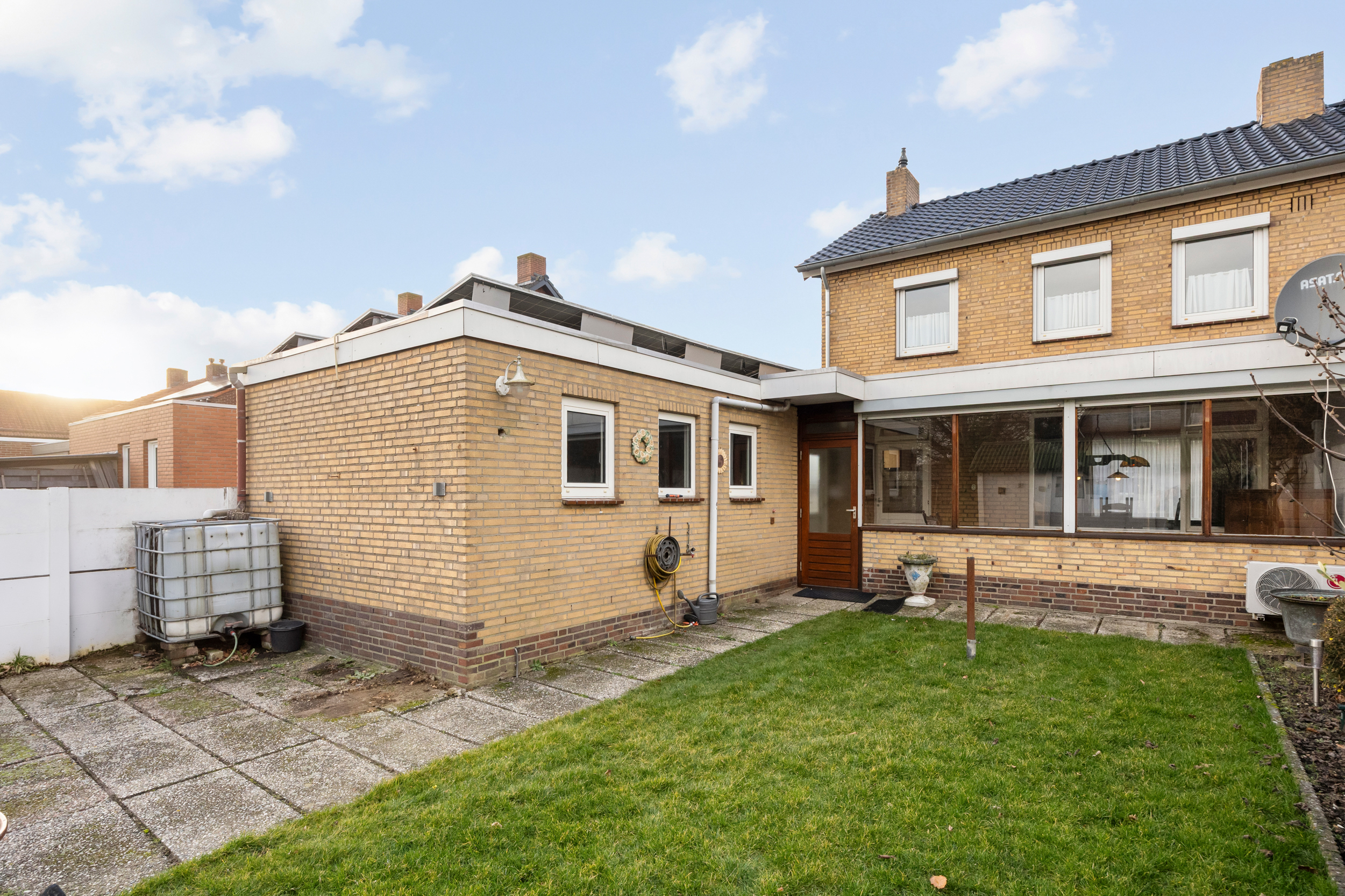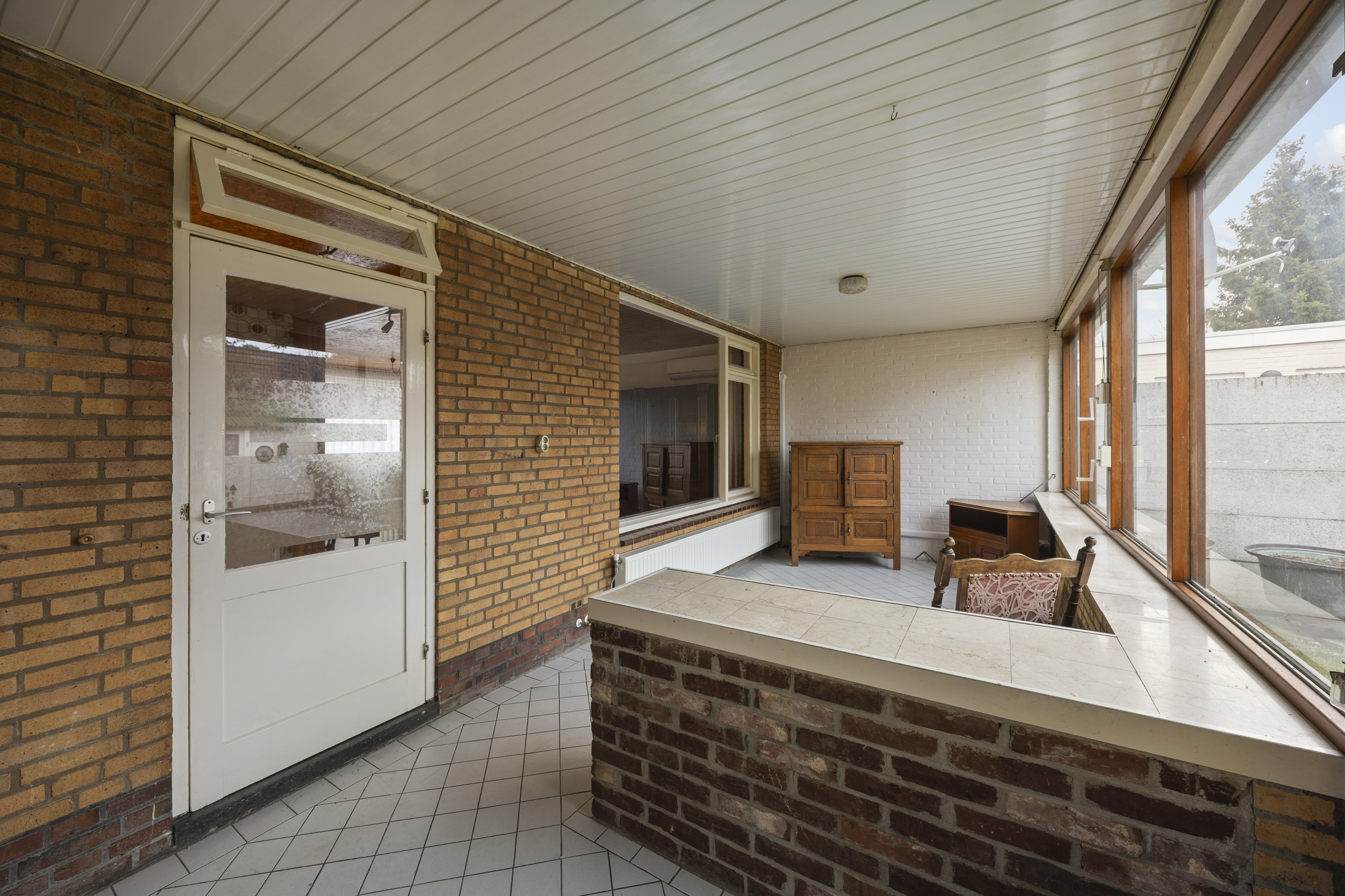 Aan de achterzijde van de woning is tevens over de volledige breedte een serre aangebouwd. Deze lichte ruimte vormt een verlengstuk van het wooncomfort en biedt een mooi uitzicht op de diepe achtertuin. Vanuit de serre heeft u direct toegang tot zowel de tuin als de inpandige garage, alsook de oprit.