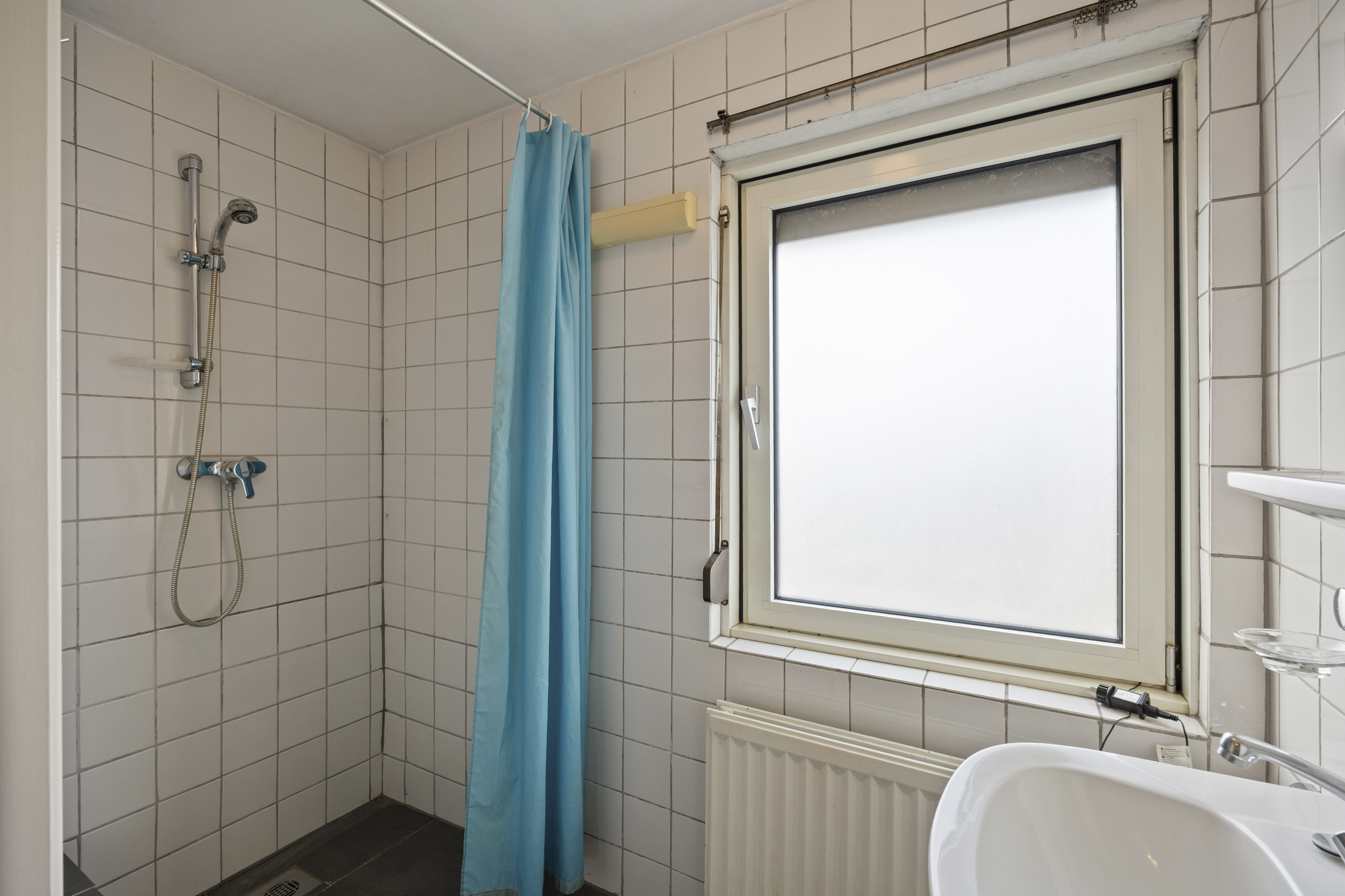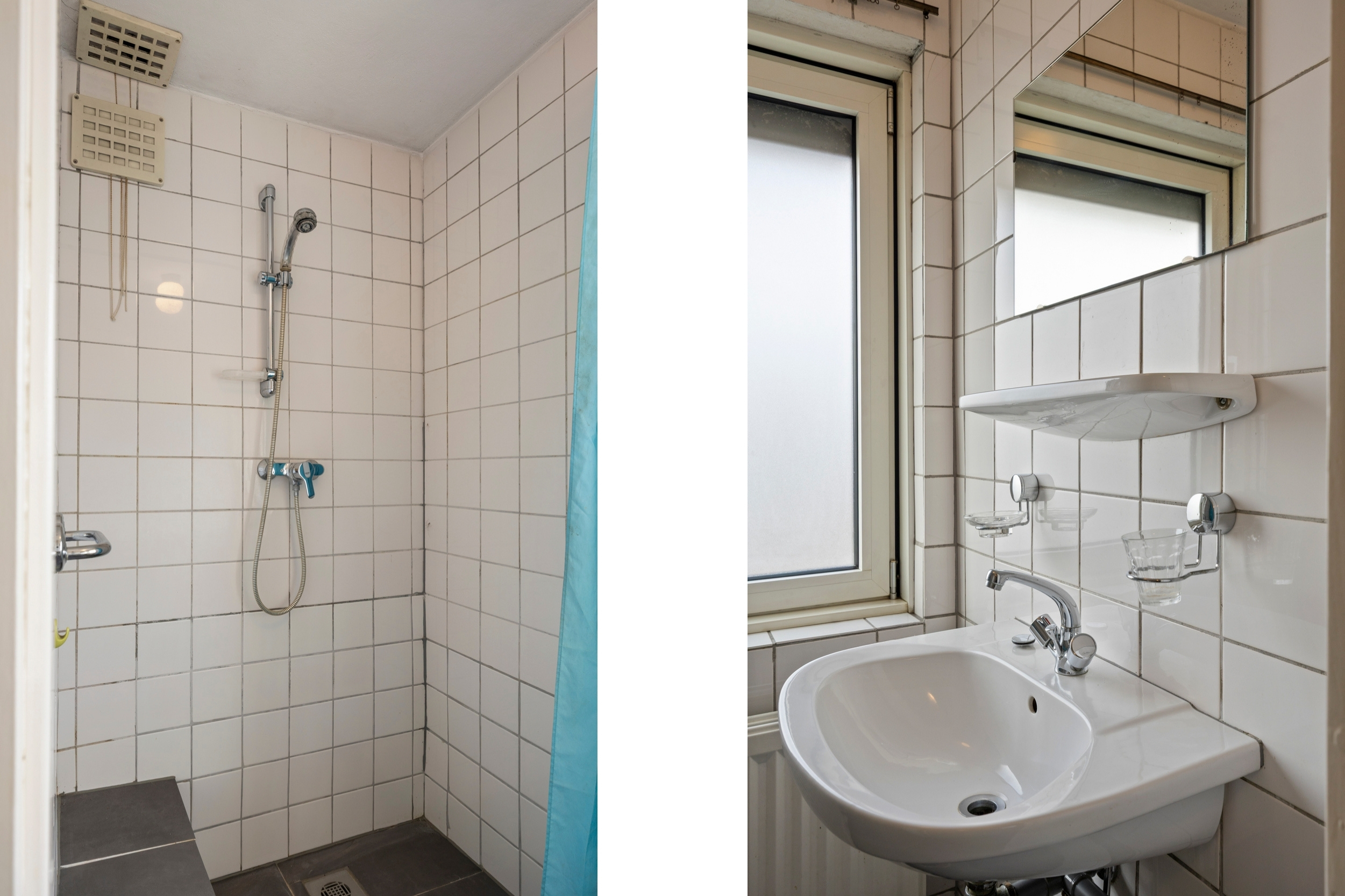 De volledig betegelde badkamer is comfortabel en functioneel ingericht met een douche en wastafel.