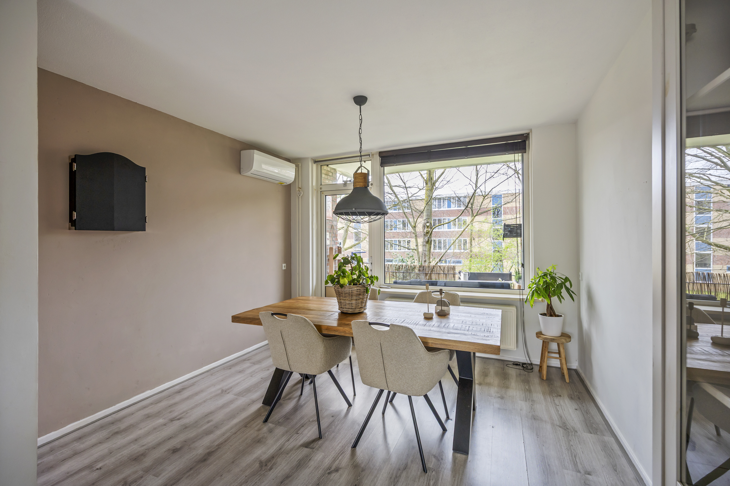 De woonkamer is zonder twijfel één van de sterke punten van het appartement. Deze ruimte is bijzonder royaal opgezet en dankzij de grote raampartijen geniet je hier van een prettige hoeveelheid natuurlijk licht. Er is meer dan voldoende ruimte voor zowel een gezellige zithoek als een ruime eethoek. Vanuit de woonkamer loop je zo het balkon op, dat op het westen is gelegen – ideaal om na het werk nog even van de zon te genieten. Daarnaast is de woonkamer voorzien van airconditioning, wat zorgt voor extra comfort tijdens warme dagen. Door de slimme indeling bestaat bovendien de mogelijkheid om hier eventueel een derde slaapkamer te realiseren.