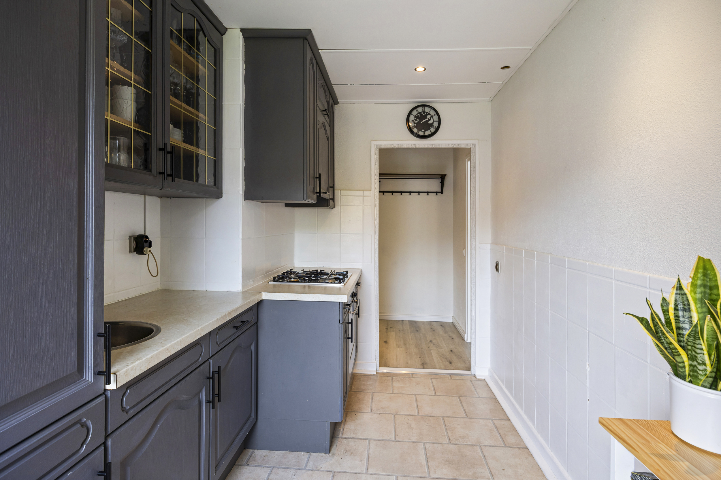 De gesloten keuken is praktisch ingericht en voorzien van een nette aanbouwkeuken met onder andere een gaskookplaat, afzuigkap en oven. Aansluitend vind je de bijkeuken, een fijne extra ruimte die perfect dienstdoet als wasruimte en bergruimte. Hier bevinden zich ook de aansluitingen voor de wasmachine en droger, evenals de opstelling van de cv-ketel.
