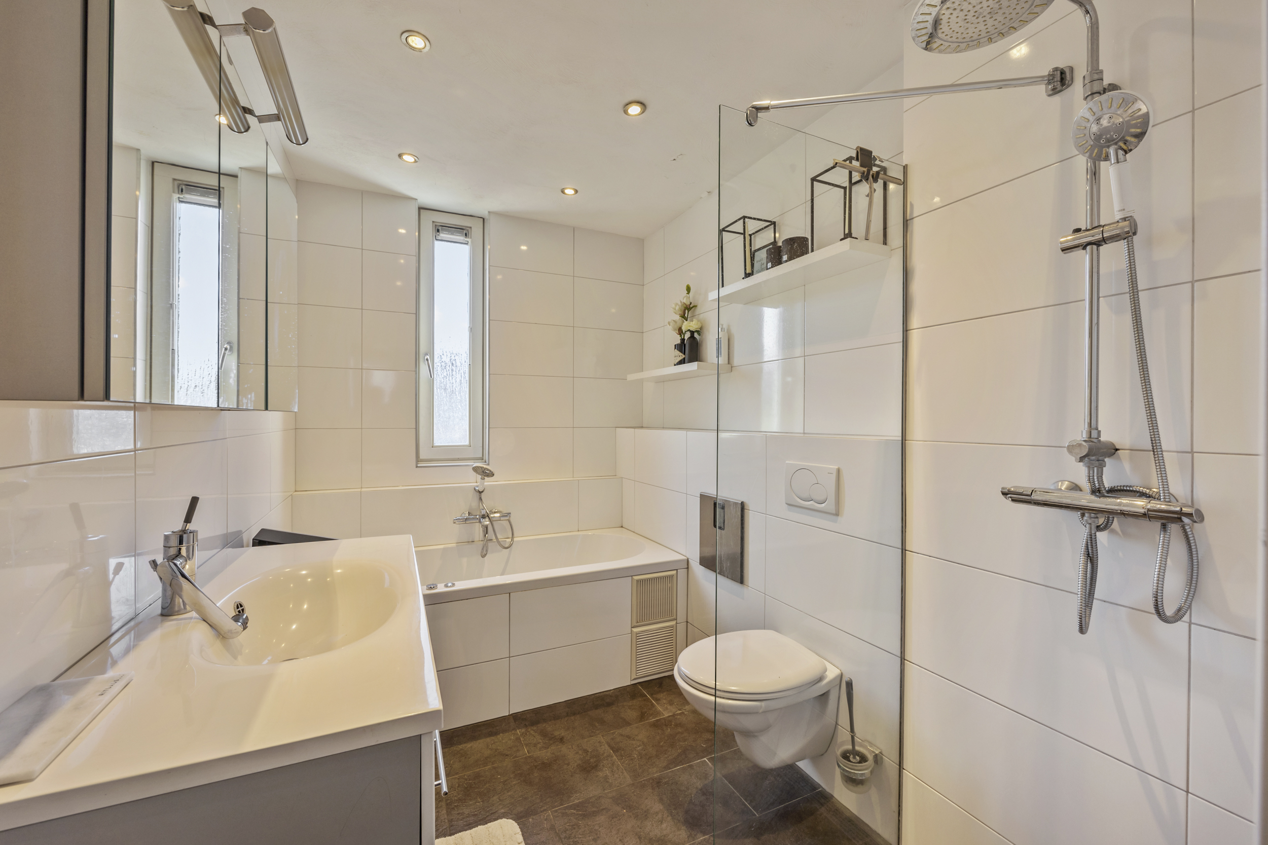 De badkamer is modern en stijlvol afgewerkt, volledig betegeld en voorzien van een whirlpool ligbad, ruime inloopdouche met glazen wand, een tweede toilet én een dubbele wastafel met meubel en spiegel. Luxe en comfort komen hier samen!