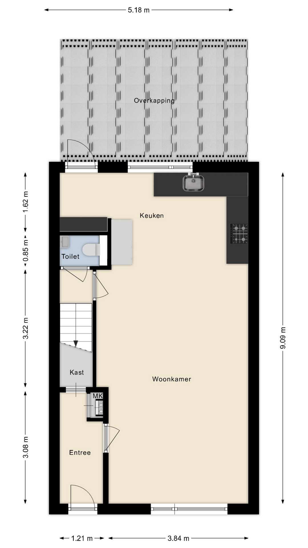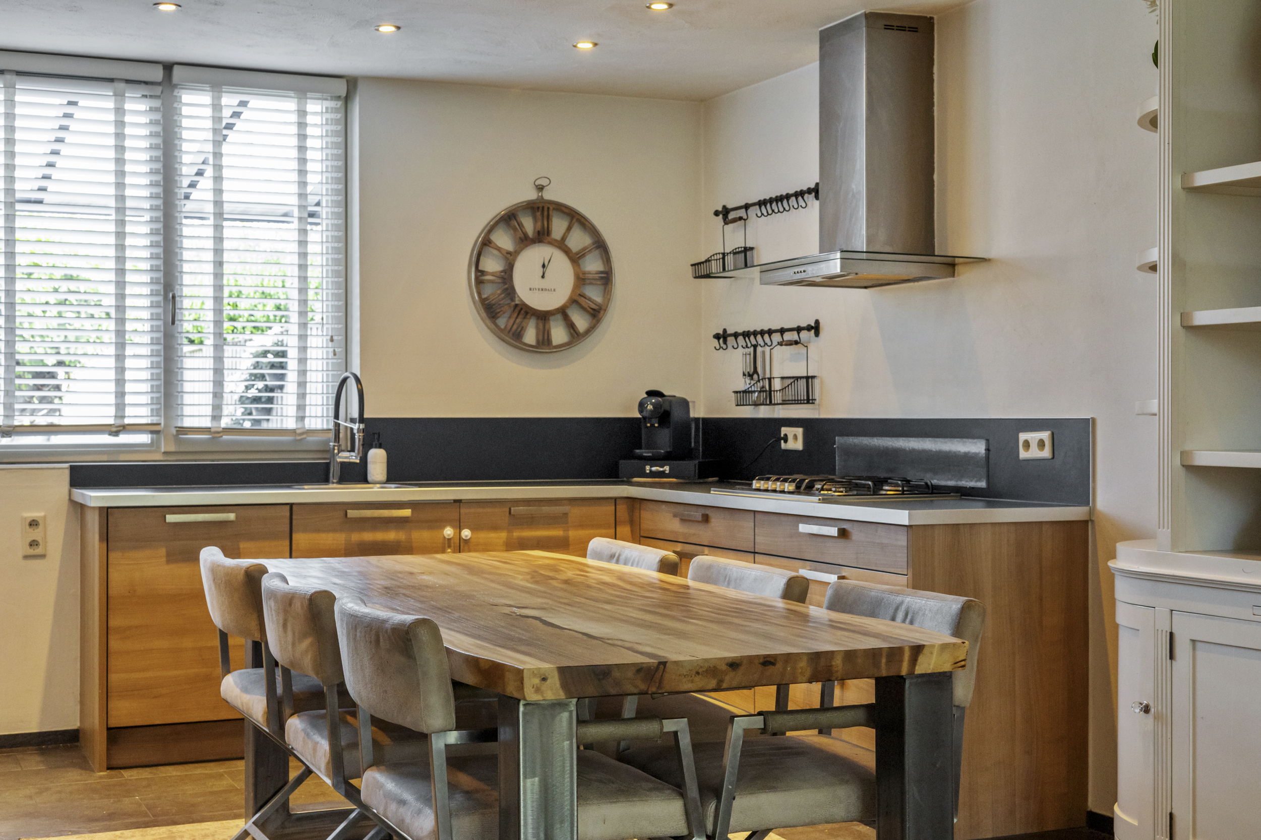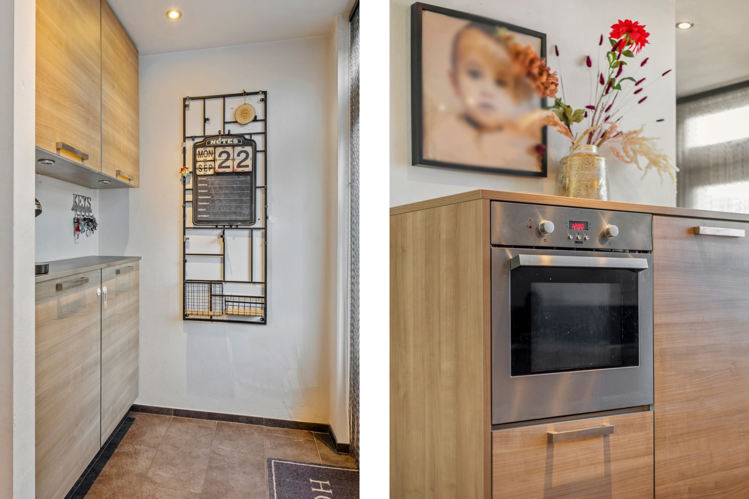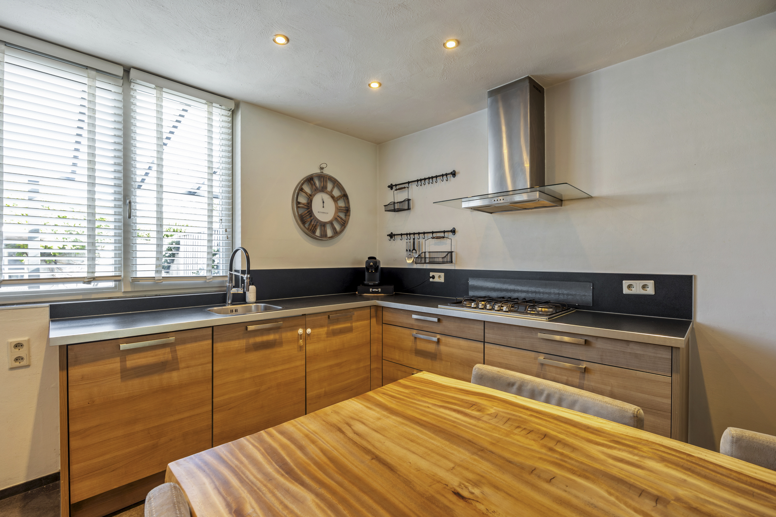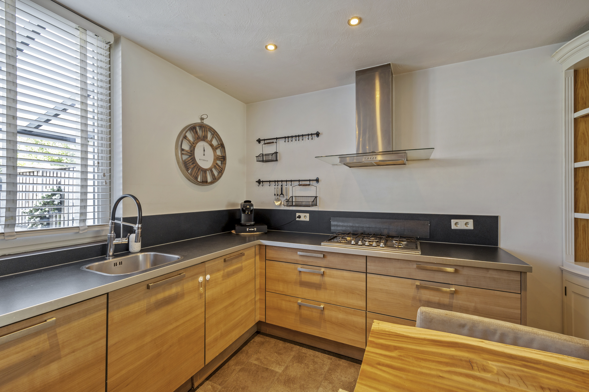 De open eetkeuken sluit mooi aan op de woonkamer en is voorzien van een luxe keukenopstelling met veel werk- en opbergruimte. Hier vind je alle benodigde inbouwapparatuur: een gaskookplaat, afzuigkap, koelkast, oven en vaatwasser. Een leuk detail is het aparte koffiehoekje. Via de loopdeur in de keuken heb je direct toegang tot de tuin en de fraaie overkapping – ideaal voor binnen-buitenleven! In de tussenhal bevindt zich het modern afgewerkte gastentoilet en de trapopgang naar boven.