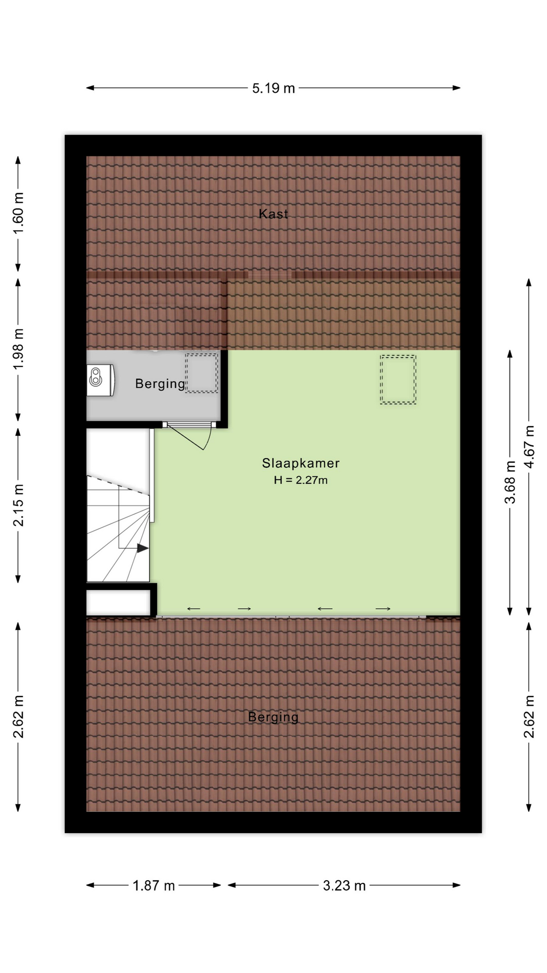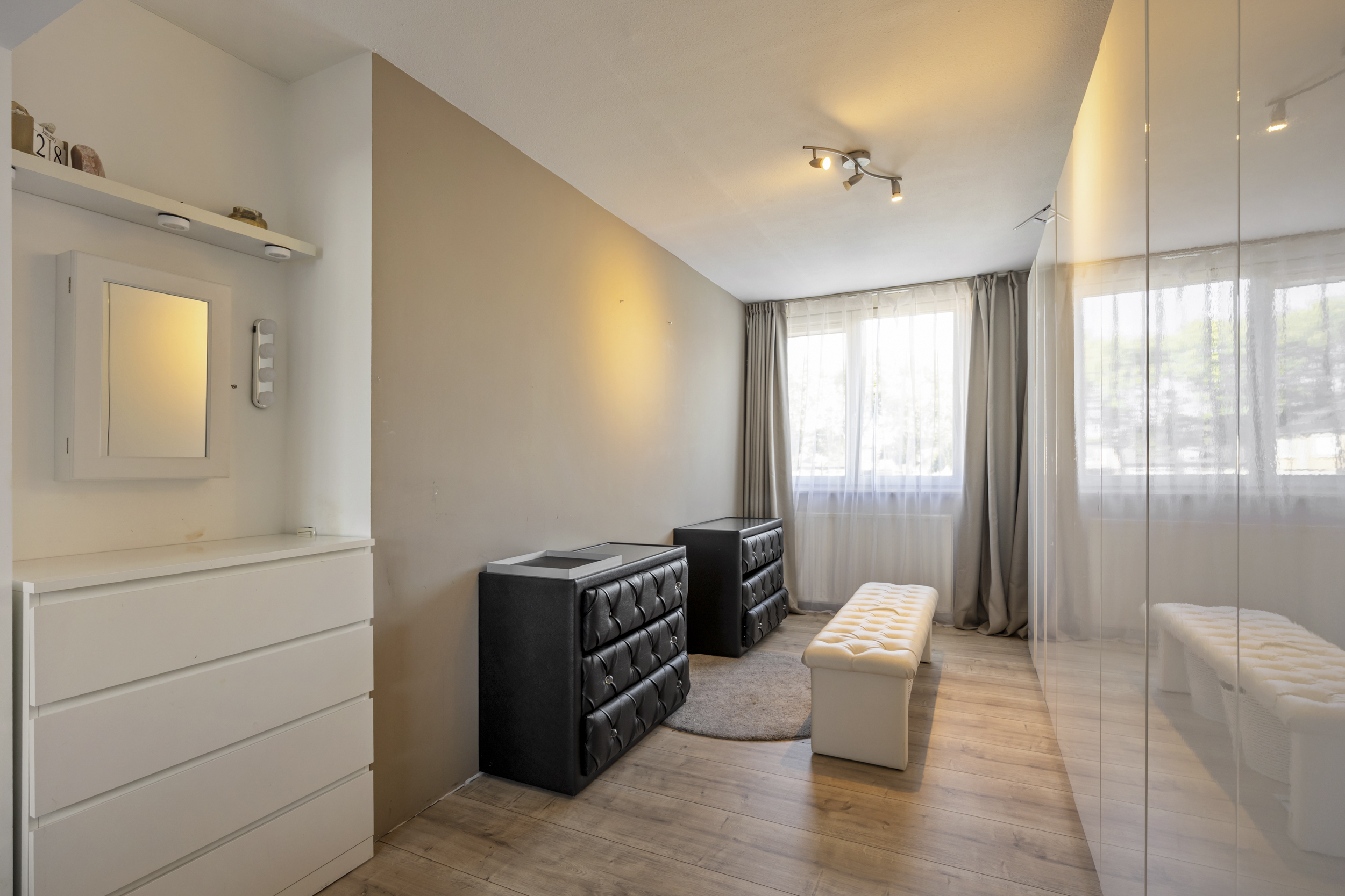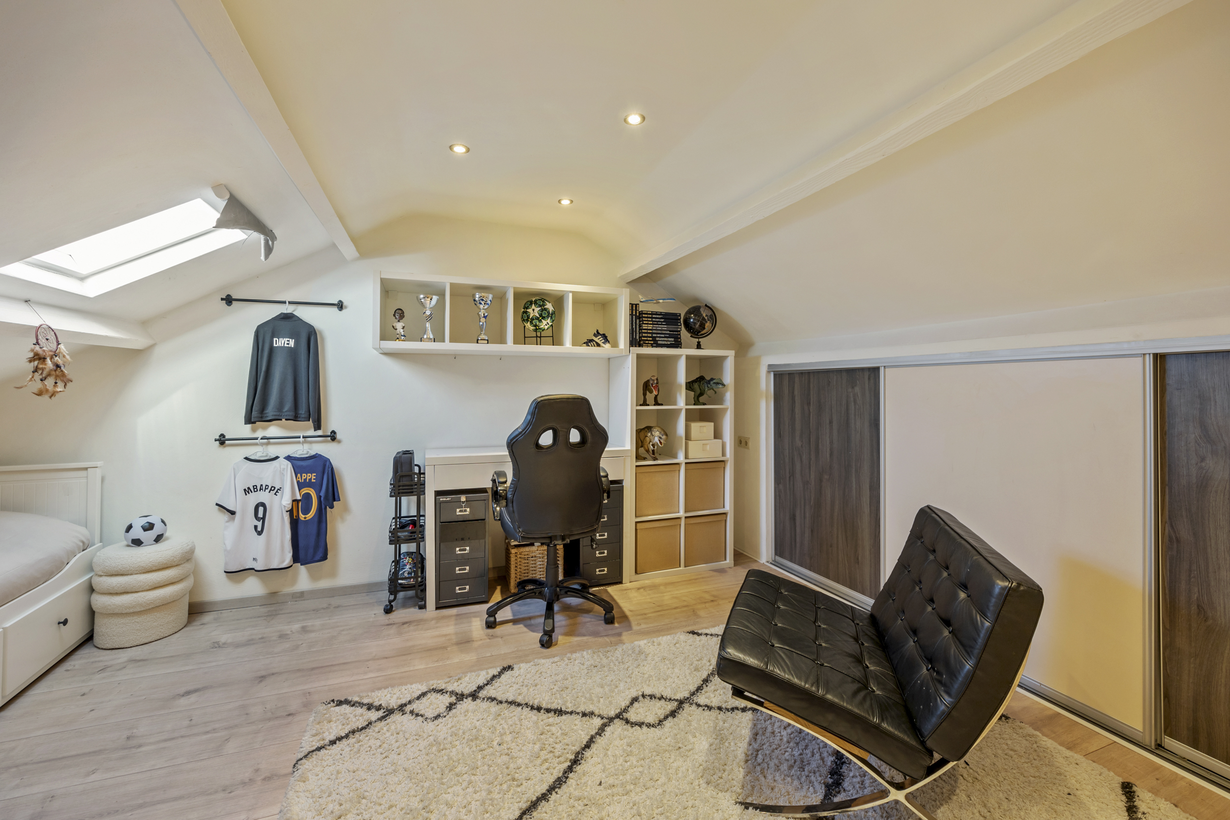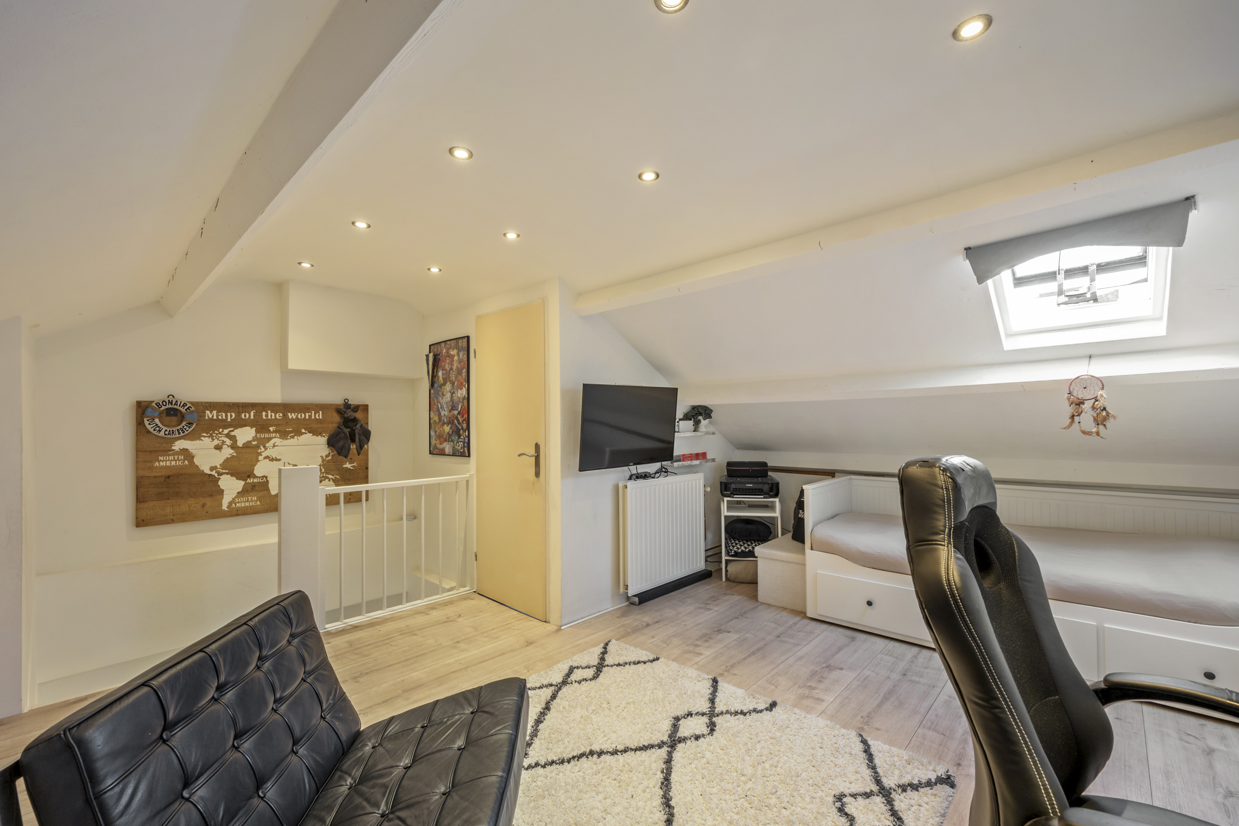 Ook de tweede verdieping is via een vaste trap bereikbaar. Hier tref je een ruime zolderkamer aan, voorzien van een dakraam, laminaatvloer en een kastenwand met schuifdeuren. Perfect als extra slaapkamer, werkkamer of hobbyruimte.