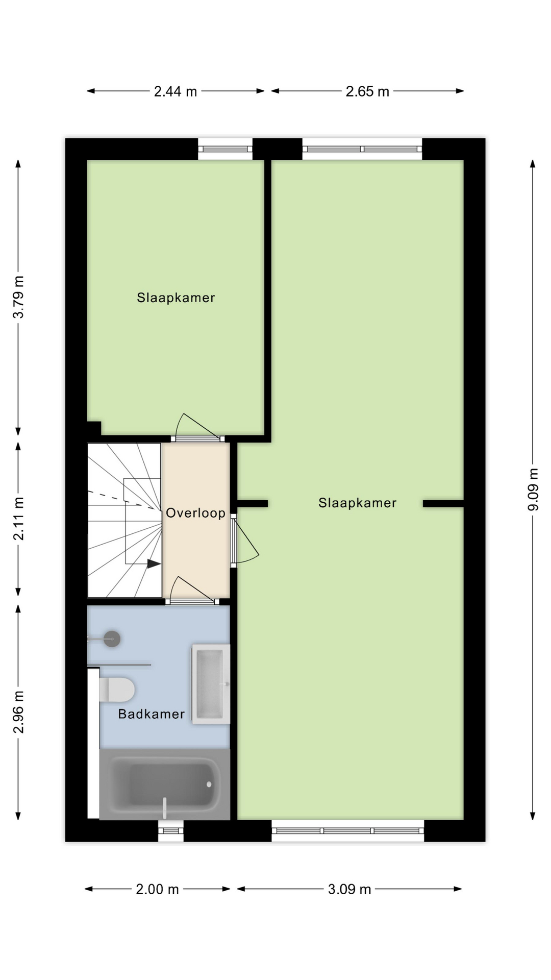 De eerste verdieping bereik je via een vaste trap. De centrale overloop geeft toegang tot twee ruime slaapkamers, een inloopkast en de badkamer.