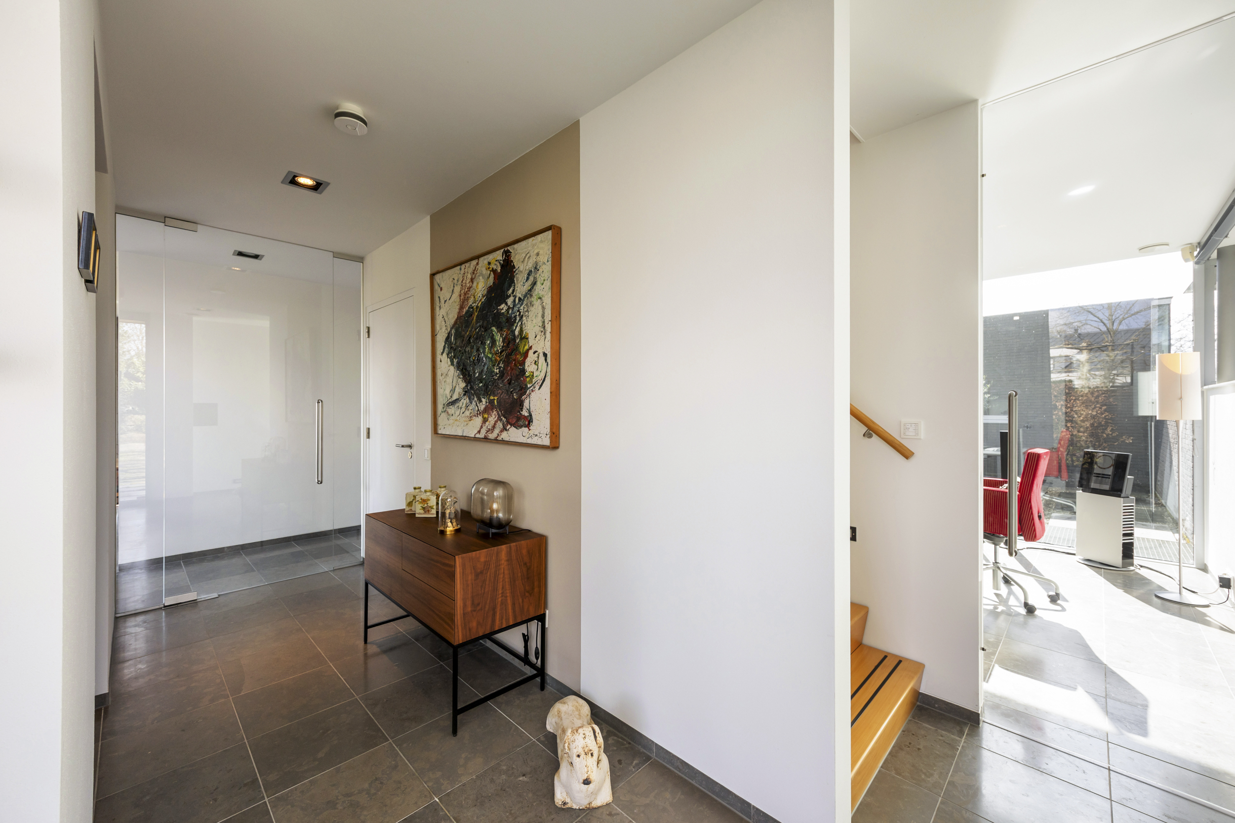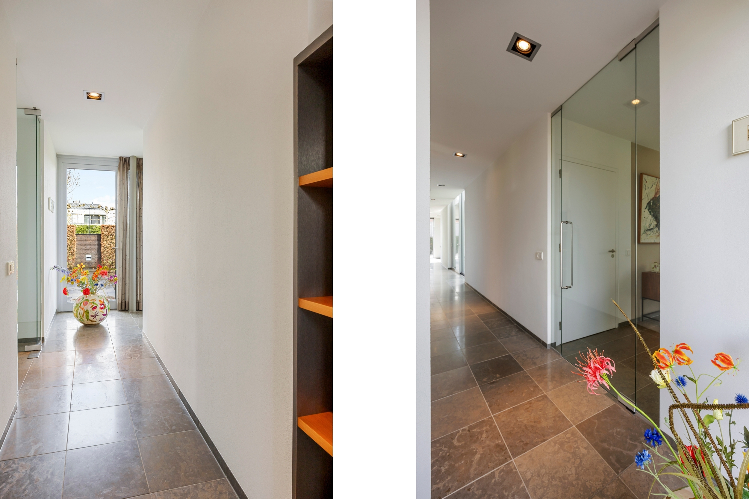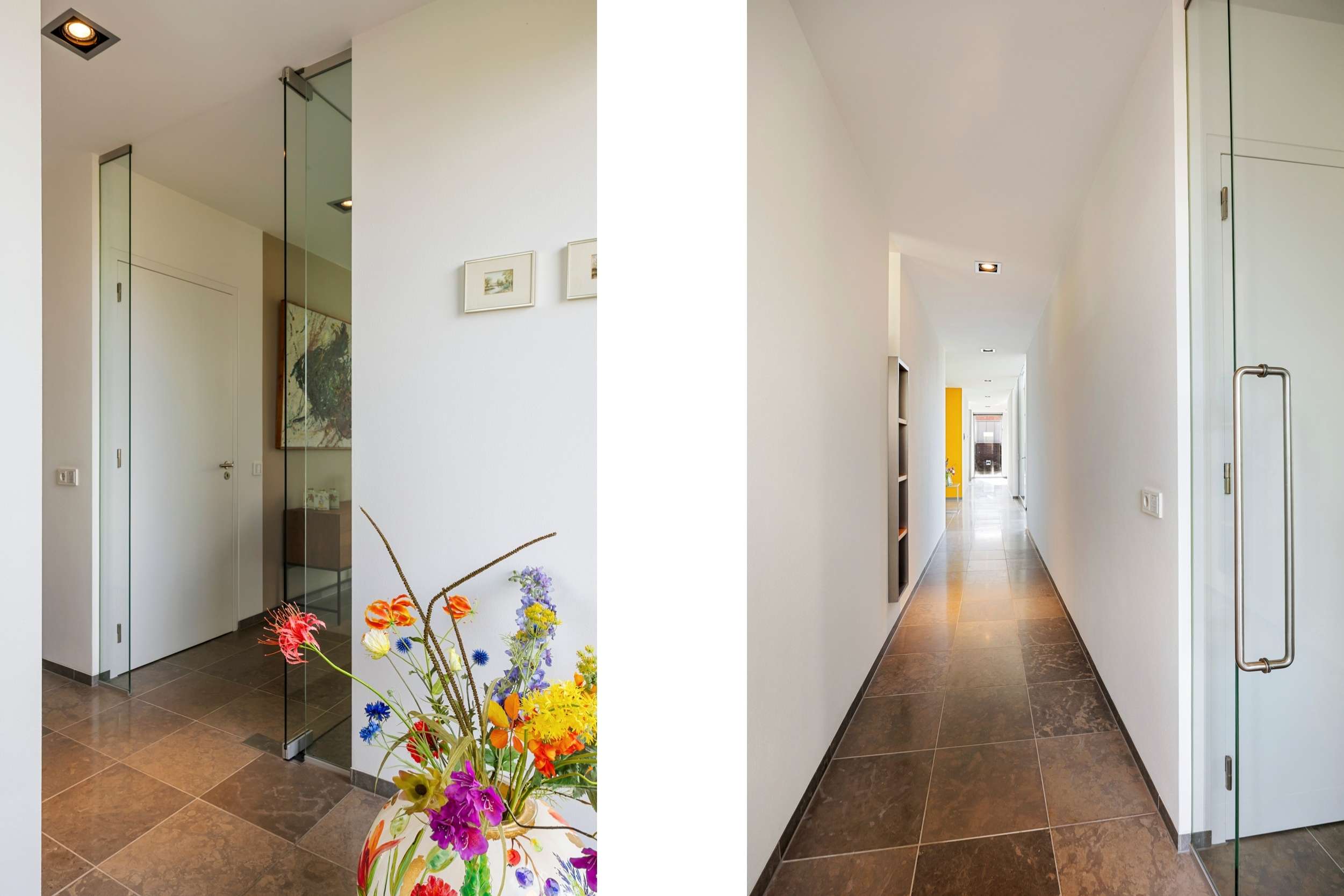 Via de royale glazen voordeur betreedt u een lichte ontvangsthal, waar strakke lijnen, drempelloze vloeren en glazen binnendeuren zorgen voor een gevoel van openheid en licht. De hal vormt het hart van de woning en onthult direct de kenmerkende zichtlijnen die het ontwerp zo bijzonder maken.