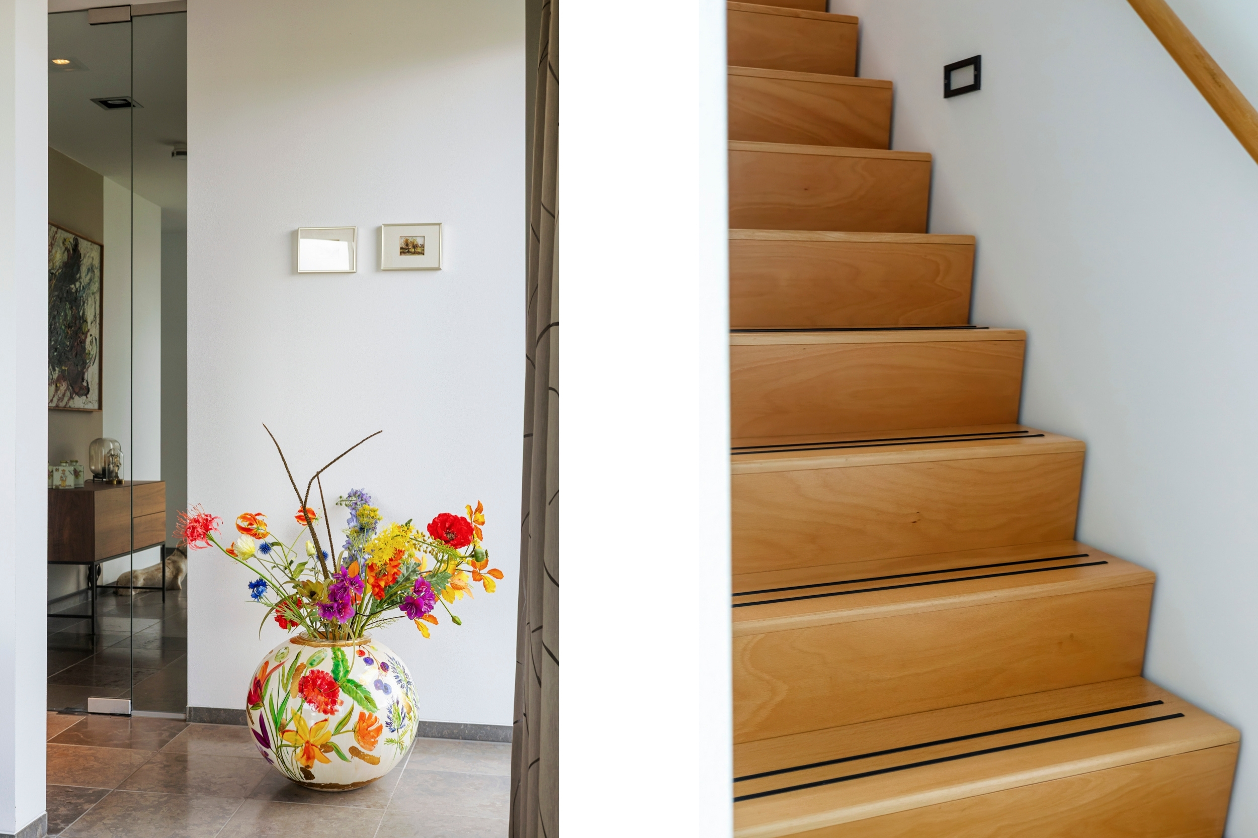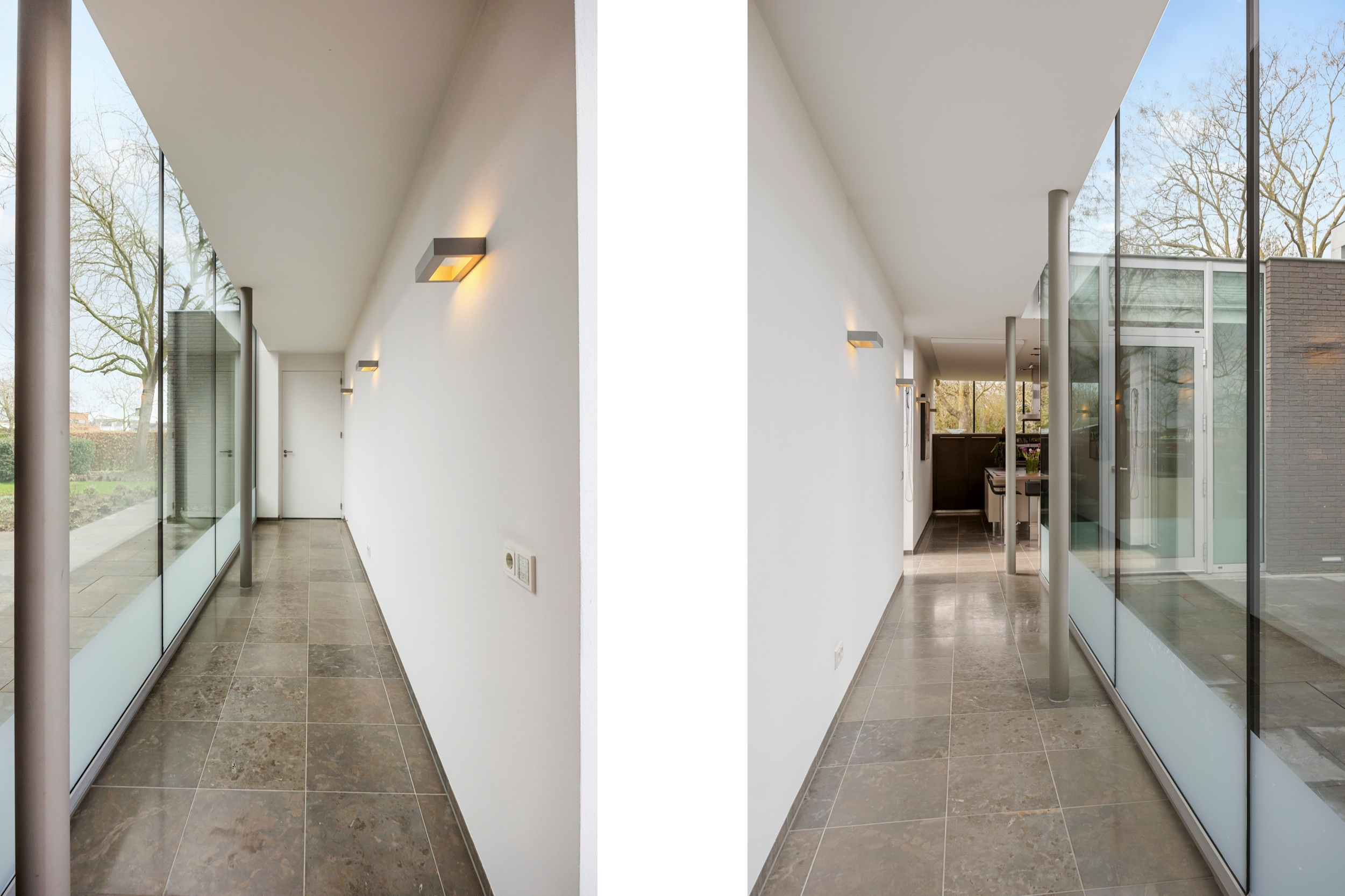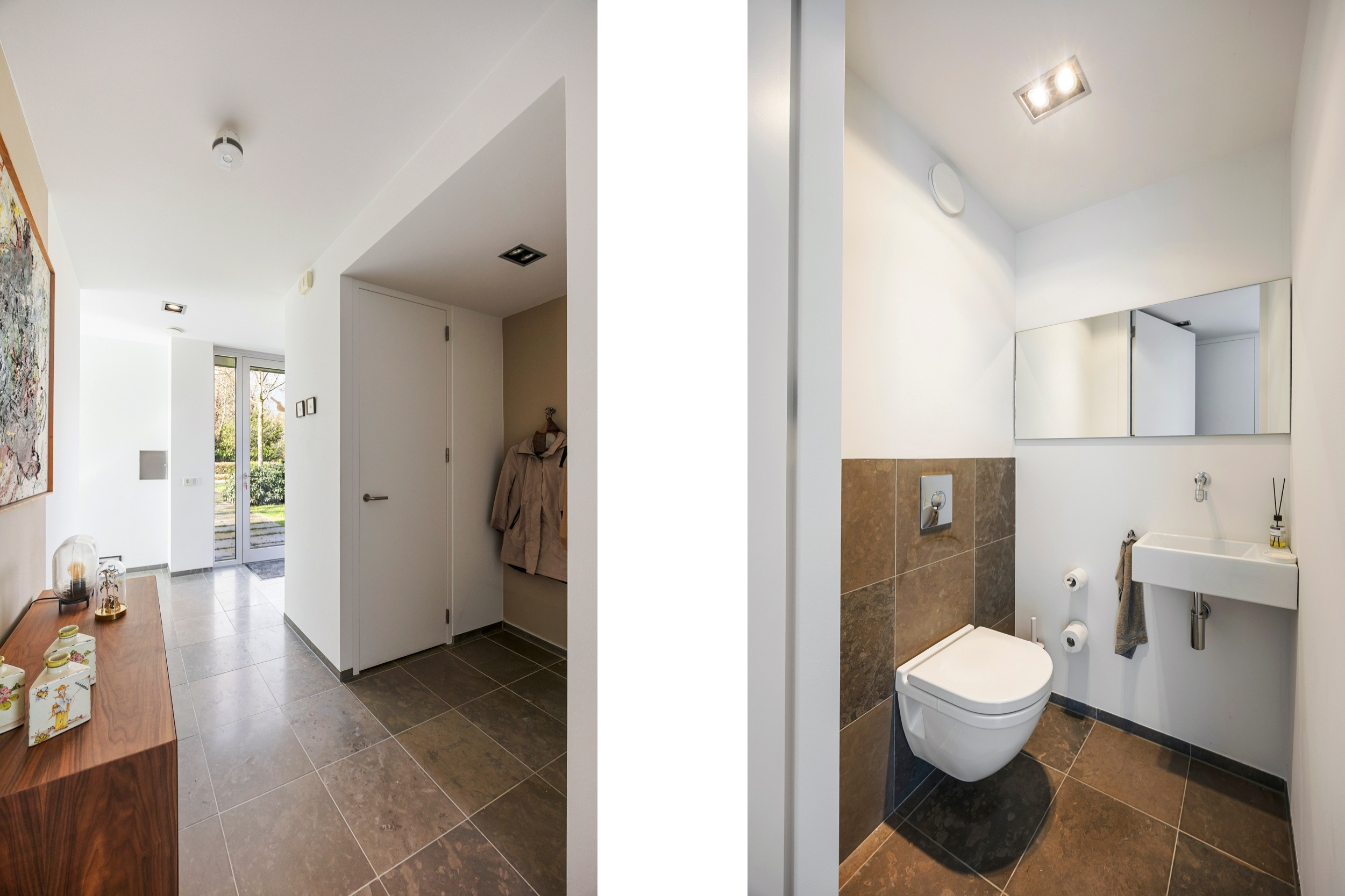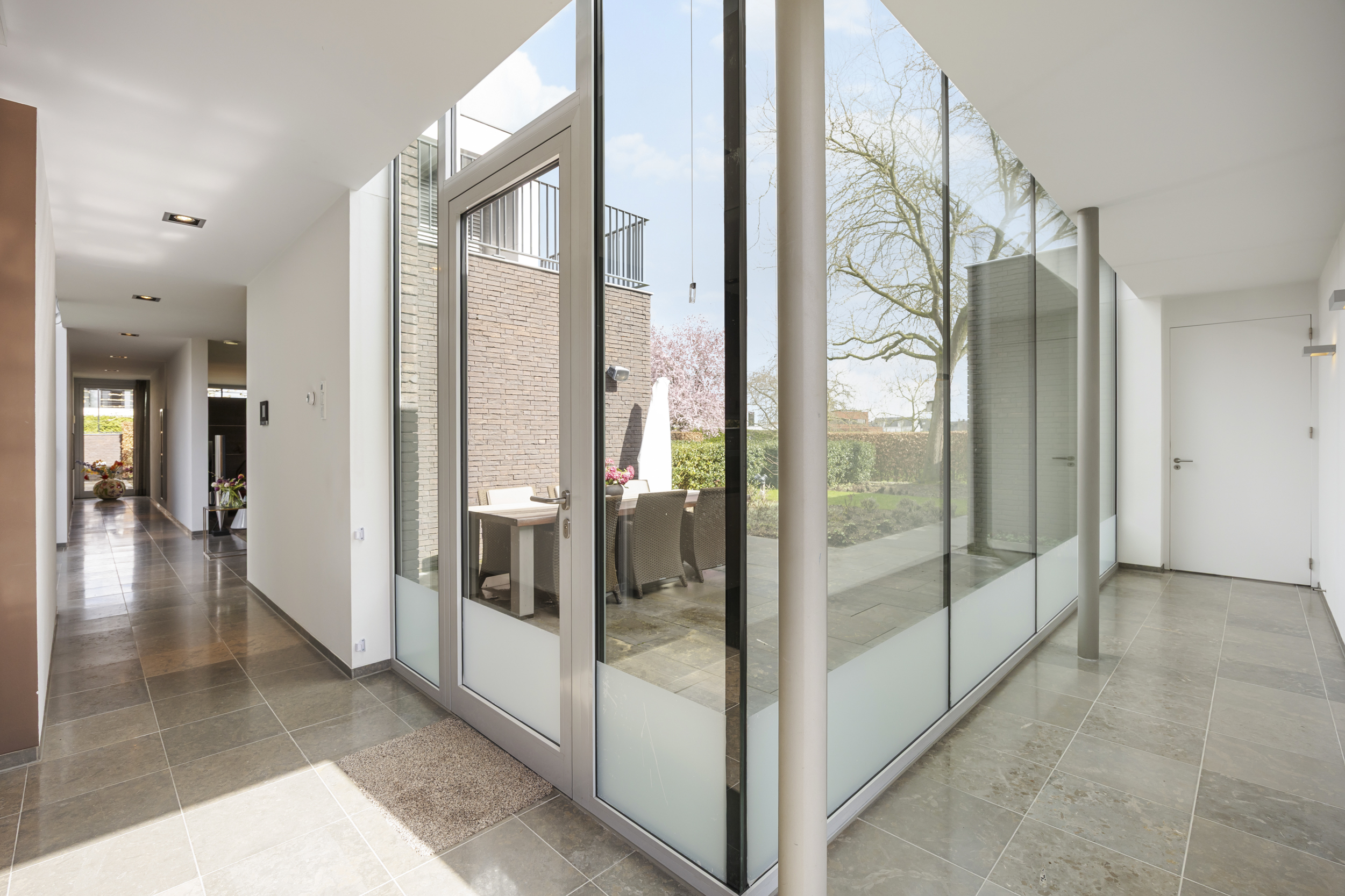 Via de royale glazen voordeur betreedt u een lichte ontvangsthal, waar strakke lijnen, drempelloze vloeren en glazen binnendeuren zorgen voor een gevoel van openheid en licht. De hal vormt het hart van de woning en onthult direct de kenmerkende zichtlijnen die het ontwerp zo bijzonder maken.