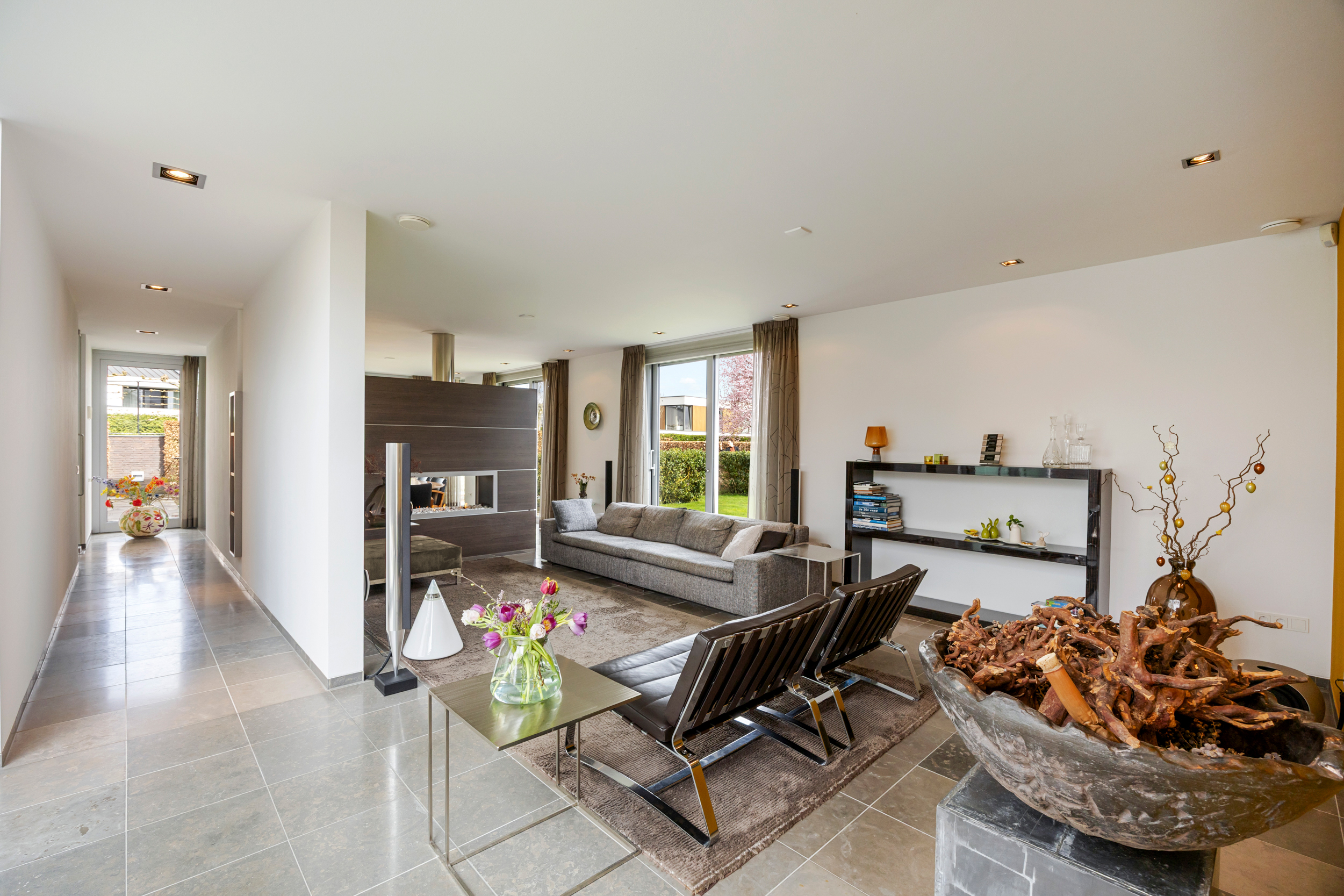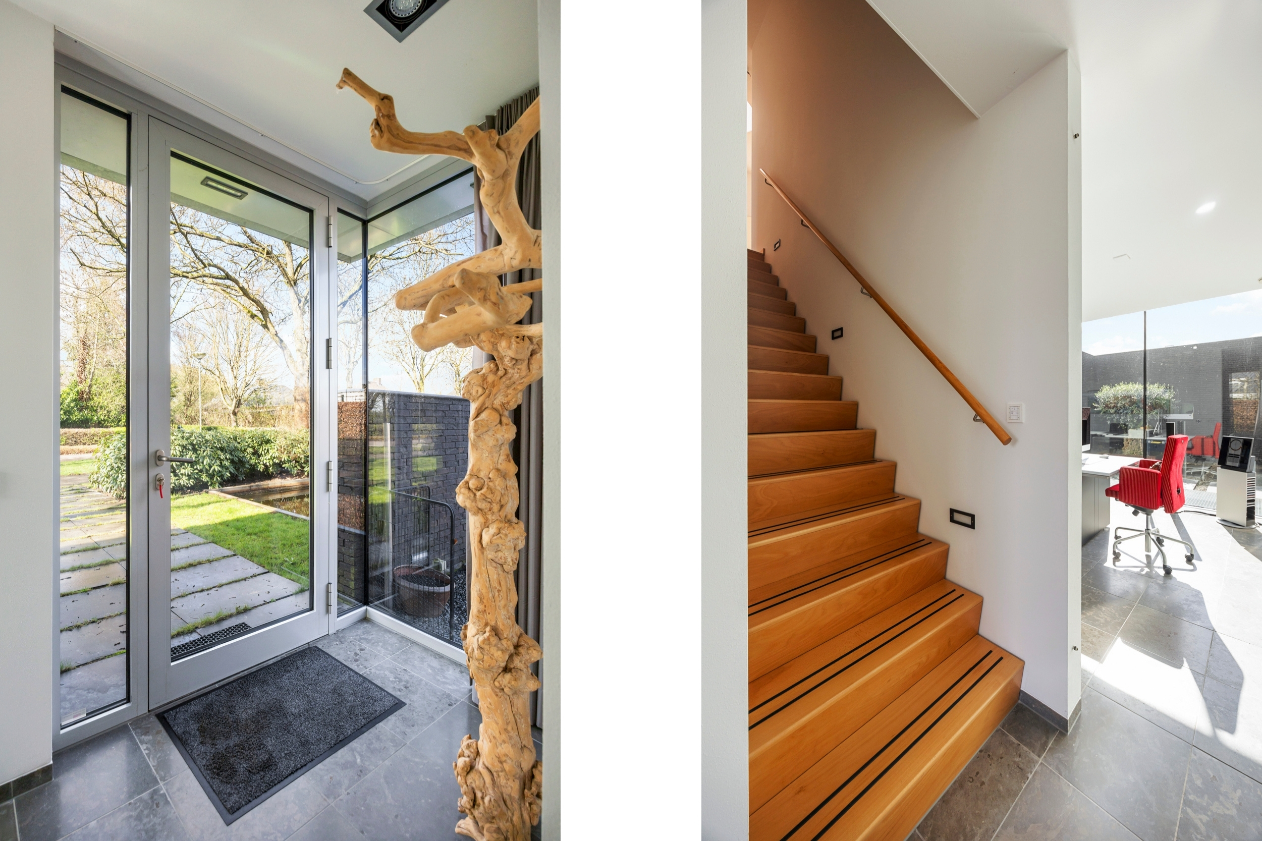 Via de moderne glazen voordeur betreedt u een ruime, lichte entree waar direct de kwaliteit en doordachte architectuur voelbaar zijn. Strakke lijnen, zichtassen en royale glaspartijen trekken uw blik vanzelf de woning in, waarbij elke ruimte op een natuurlijke manier in elkaar overloopt.