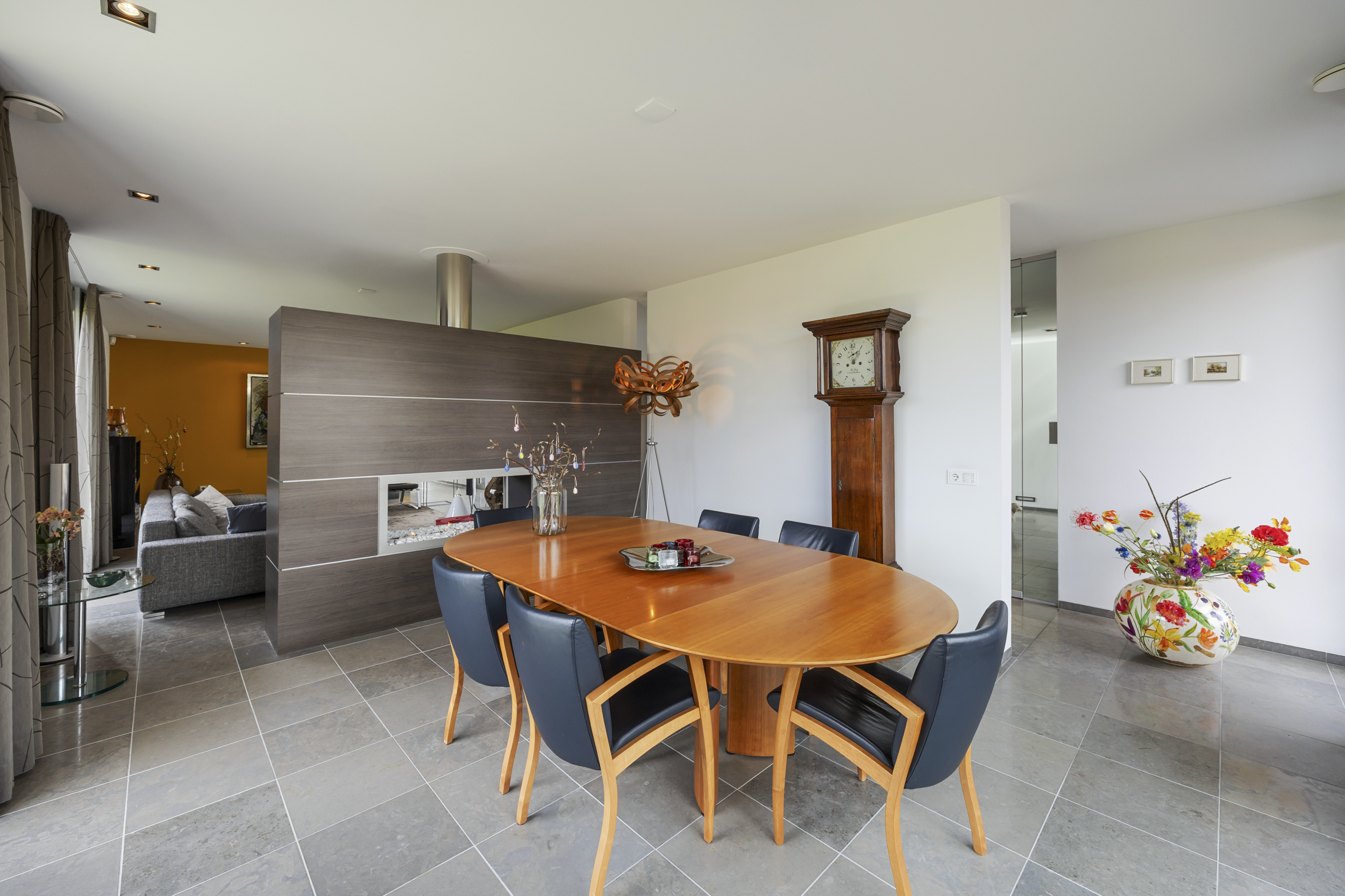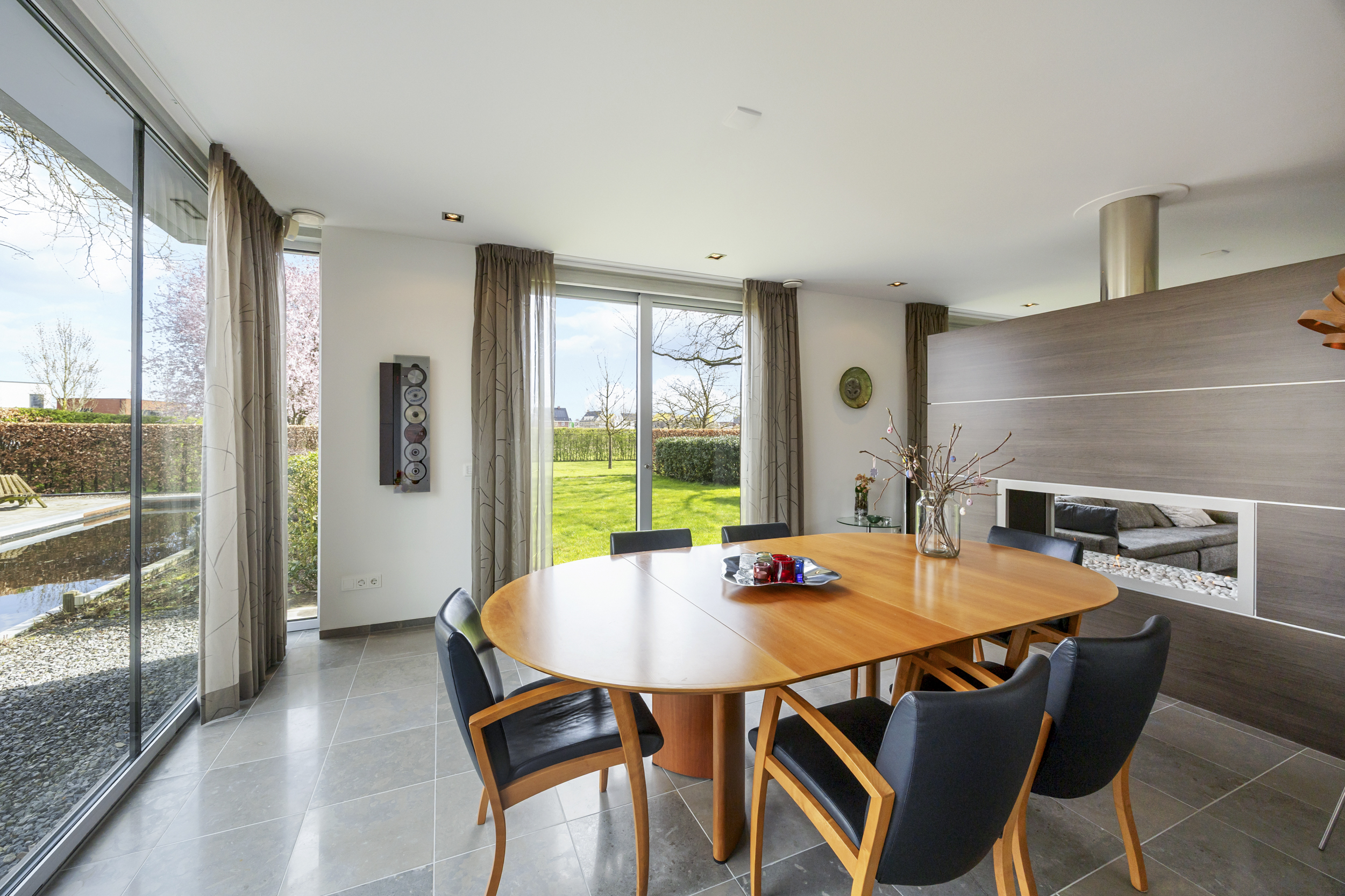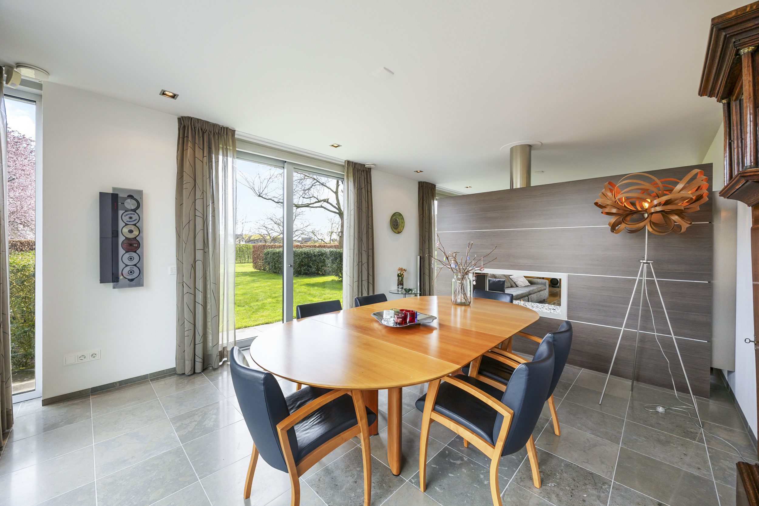 De woonkamer en eetkamer zijn subtiel gescheiden door een centrale gashaard, waardoor twee sfeervolle, verbonden zones ontstaan. Grote raampartijen bieden prachtig daglicht en continu zicht op de patio en tuin, waardoor binnen en buiten bijna één geheel vormen.