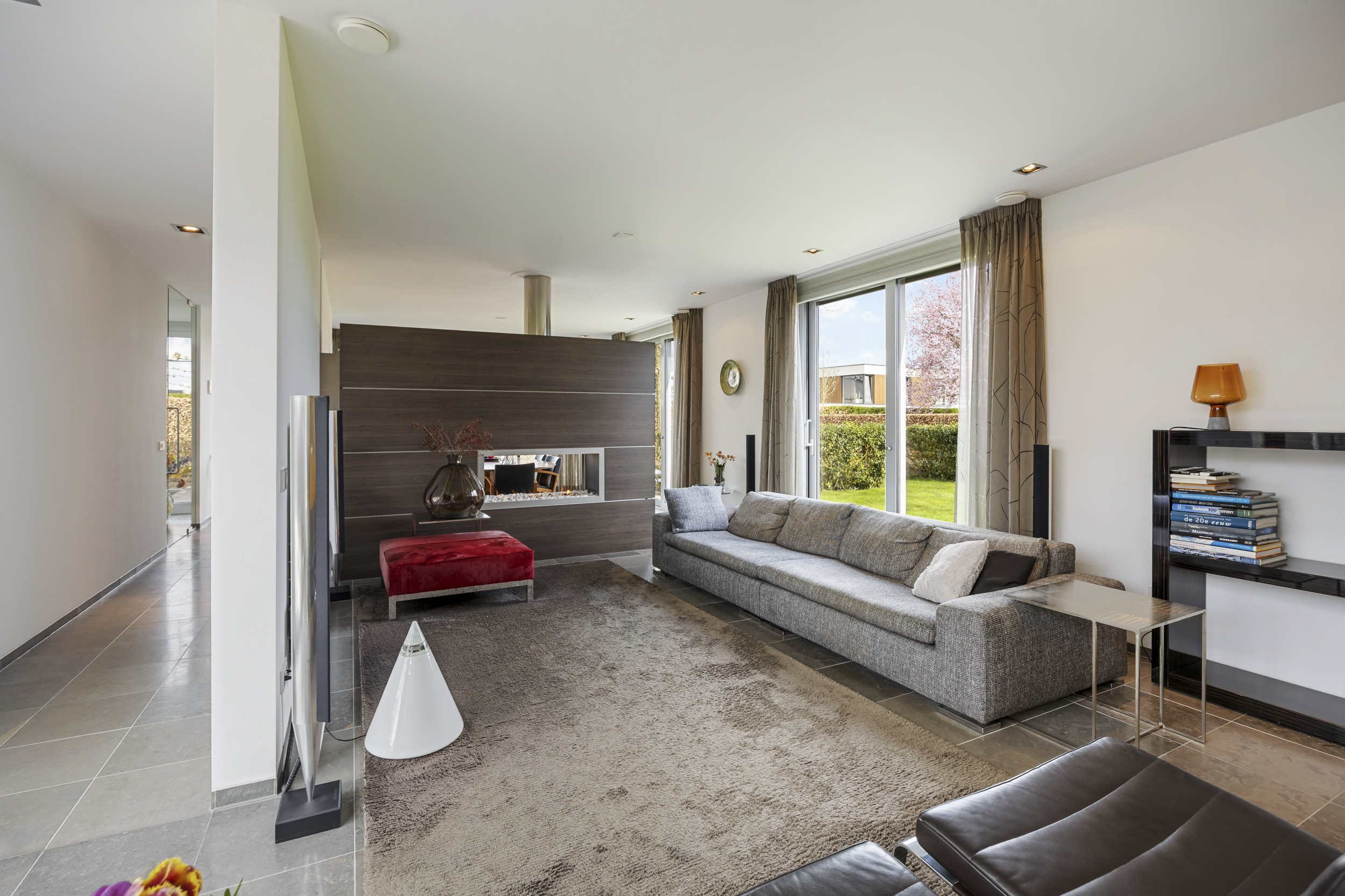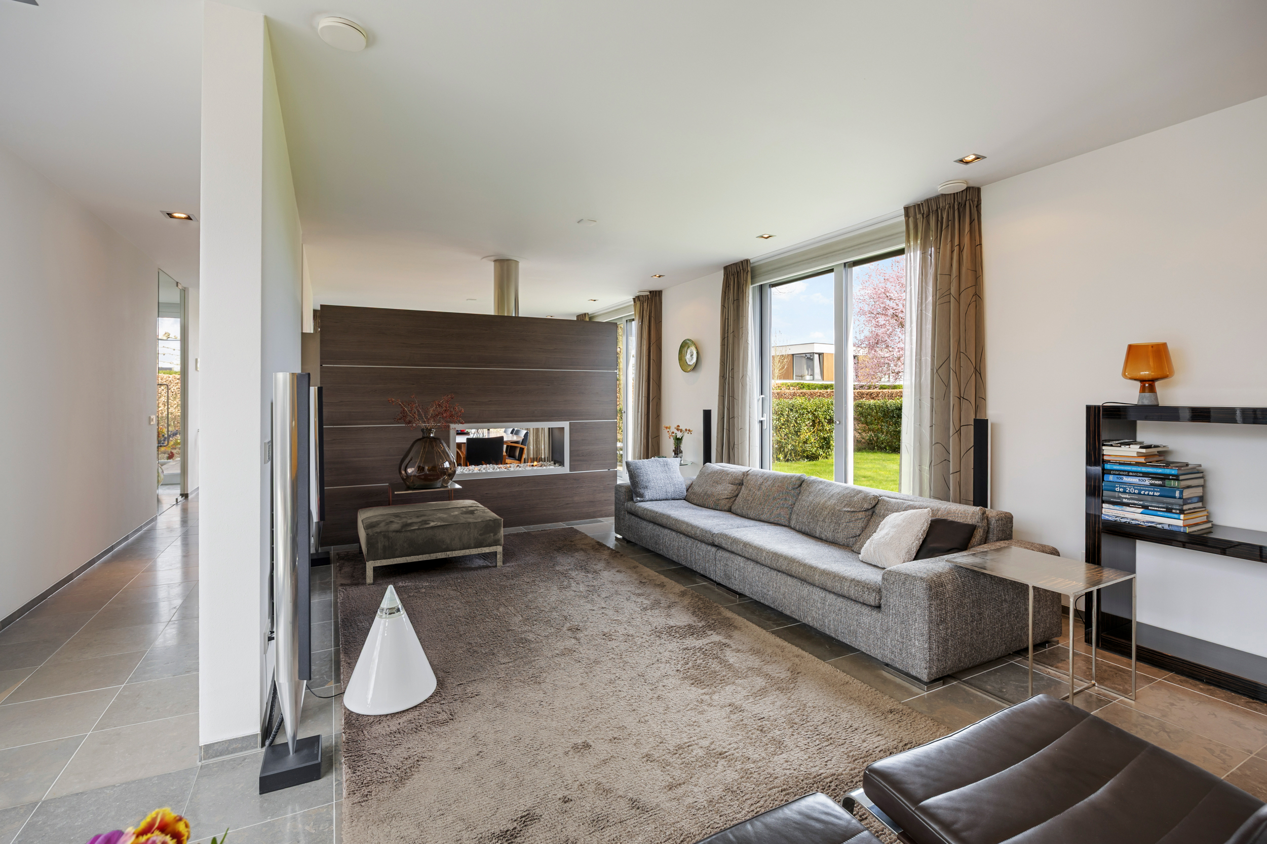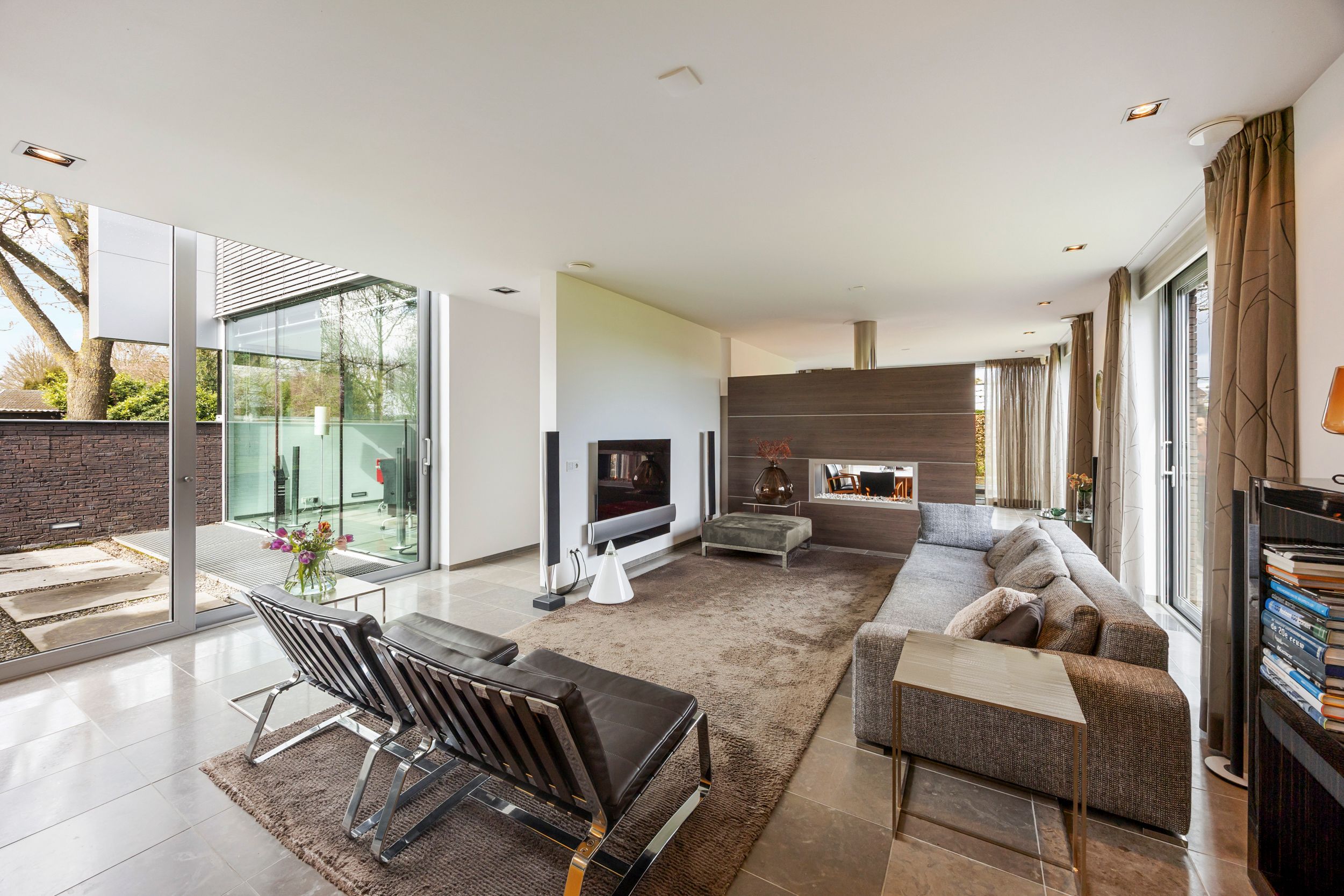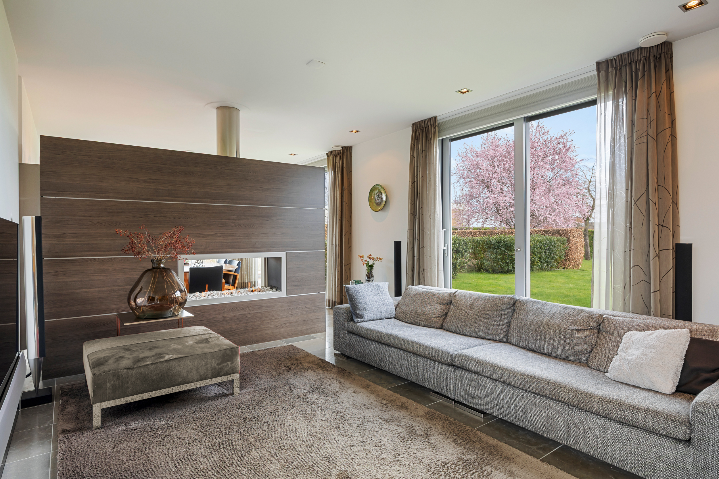 De woonkamer en eetkamer zijn subtiel gescheiden door een centrale gashaard, waardoor twee sfeervolle, verbonden zones ontstaan. Grote raampartijen bieden prachtig daglicht en continu zicht op de patio en tuin, waardoor binnen en buiten bijna één geheel vormen.