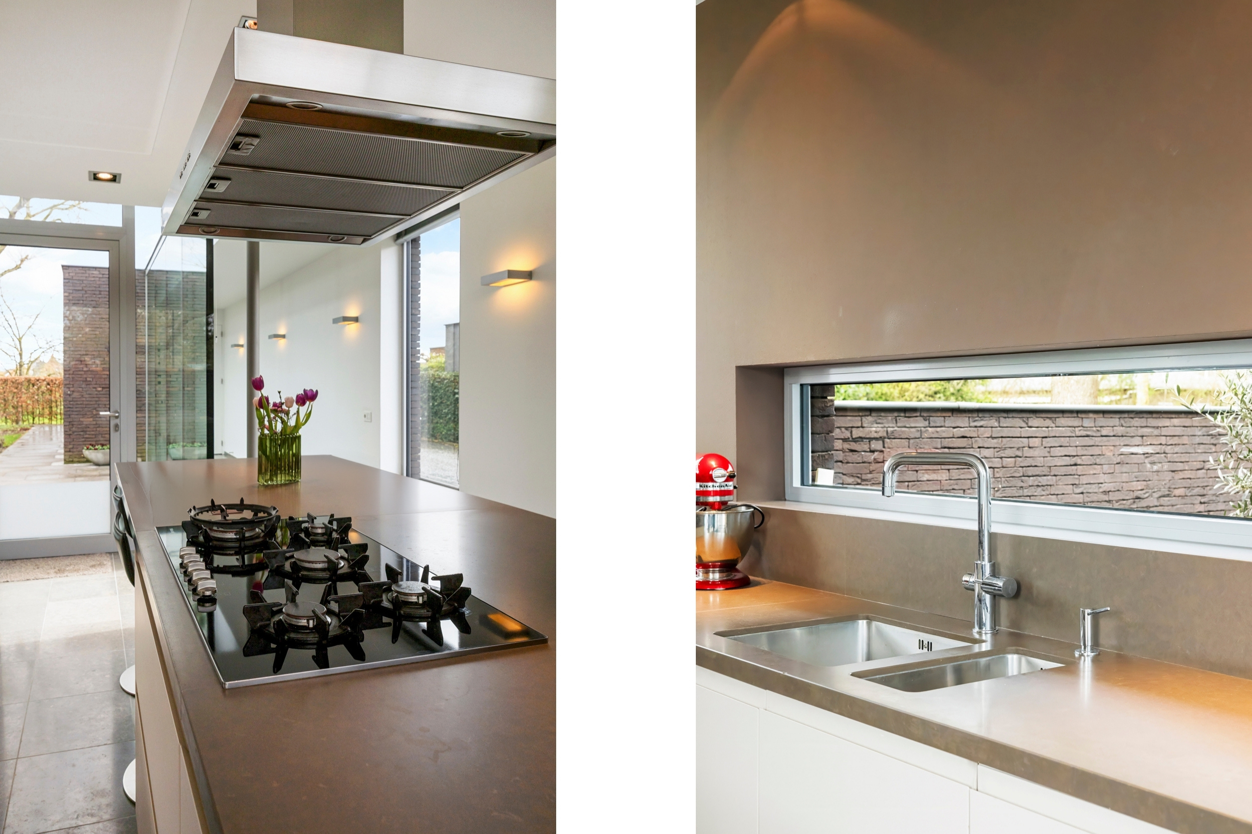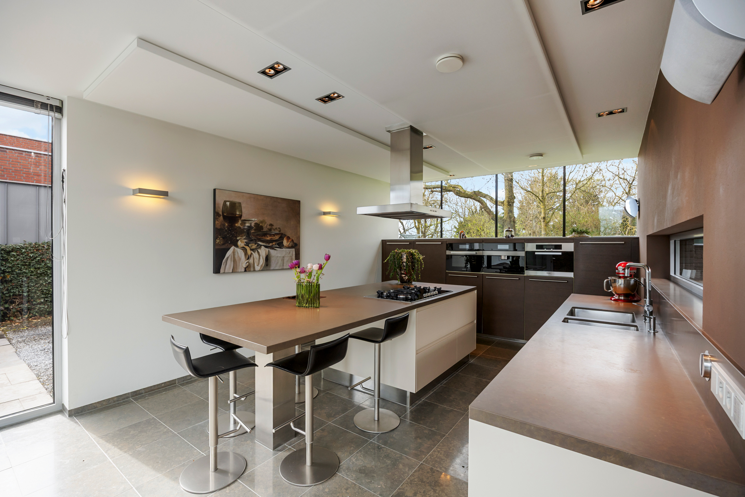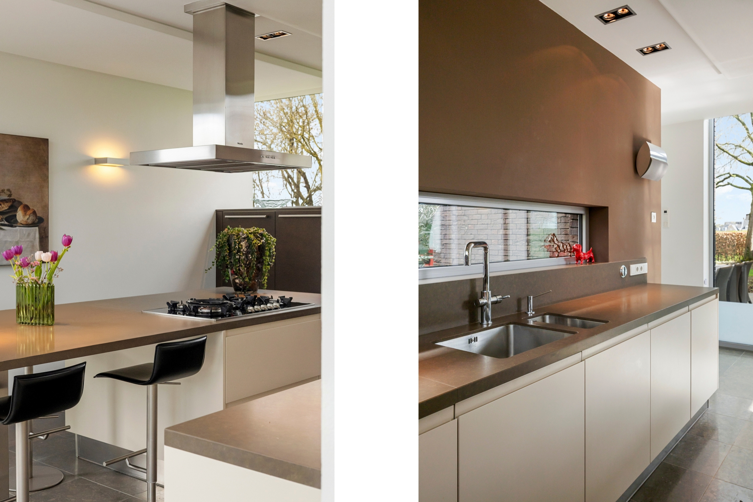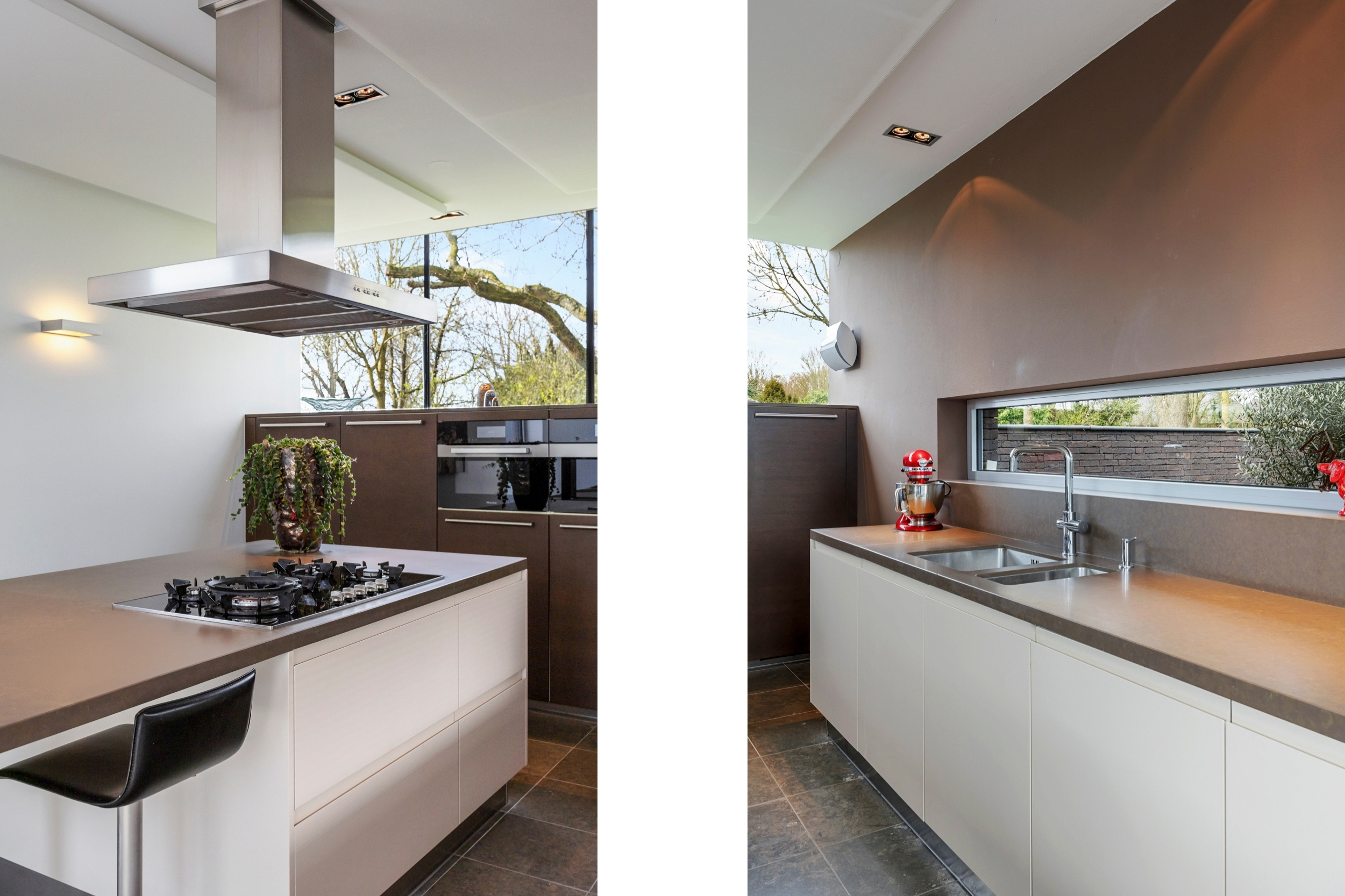 De open, maar toch duidelijke verbinding met de aparte keuken maakt koken tot een fijne, lichte en praktische bezigheid. Vanuit de keuken loop je bovendien zo het terras en de patio op. Praktische ruimtes zoals de bijkeuken en de ruime inpandige garage zijn slim verbonden via een overdekte ‘glazen tunnel’. Deze vormt een comfortabele en functionele doorgang die perfect past bij het ontwerp van de villa.