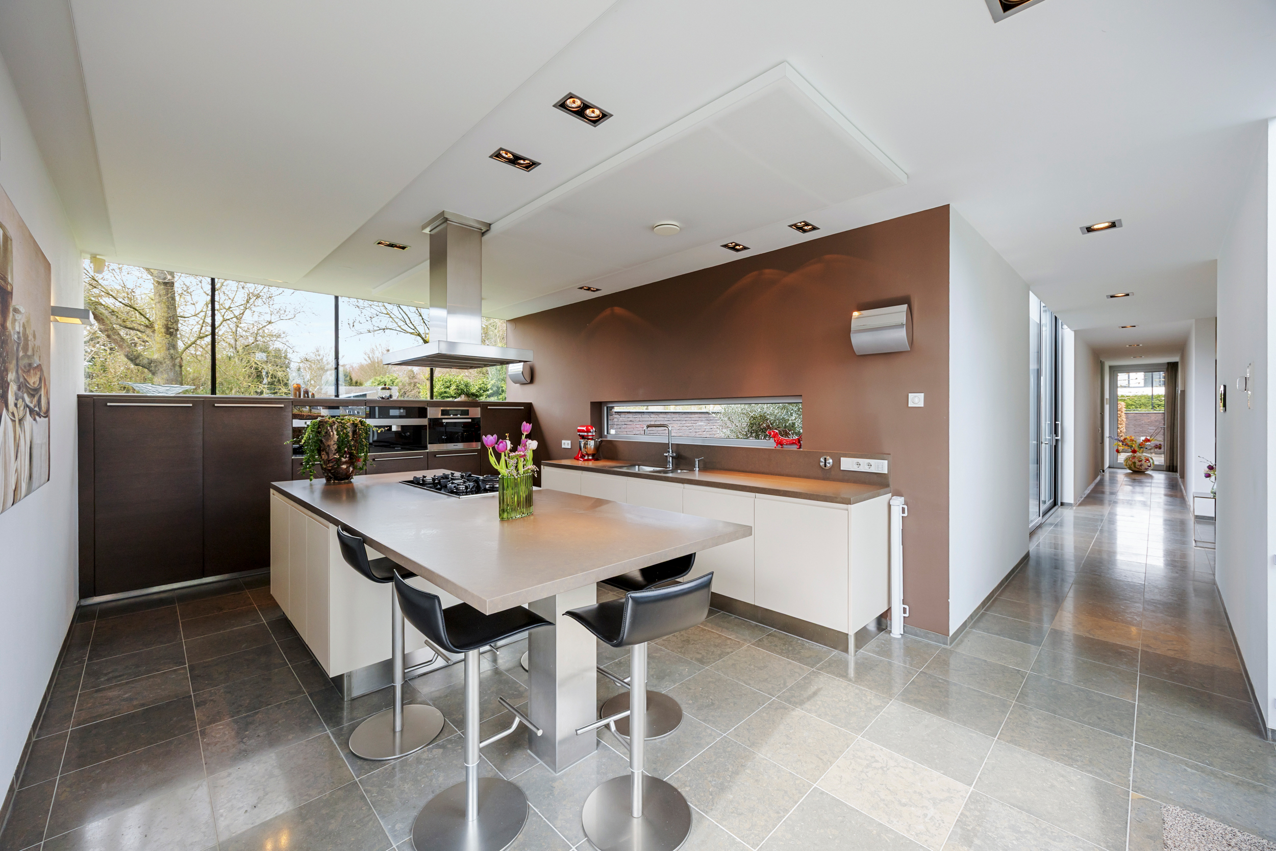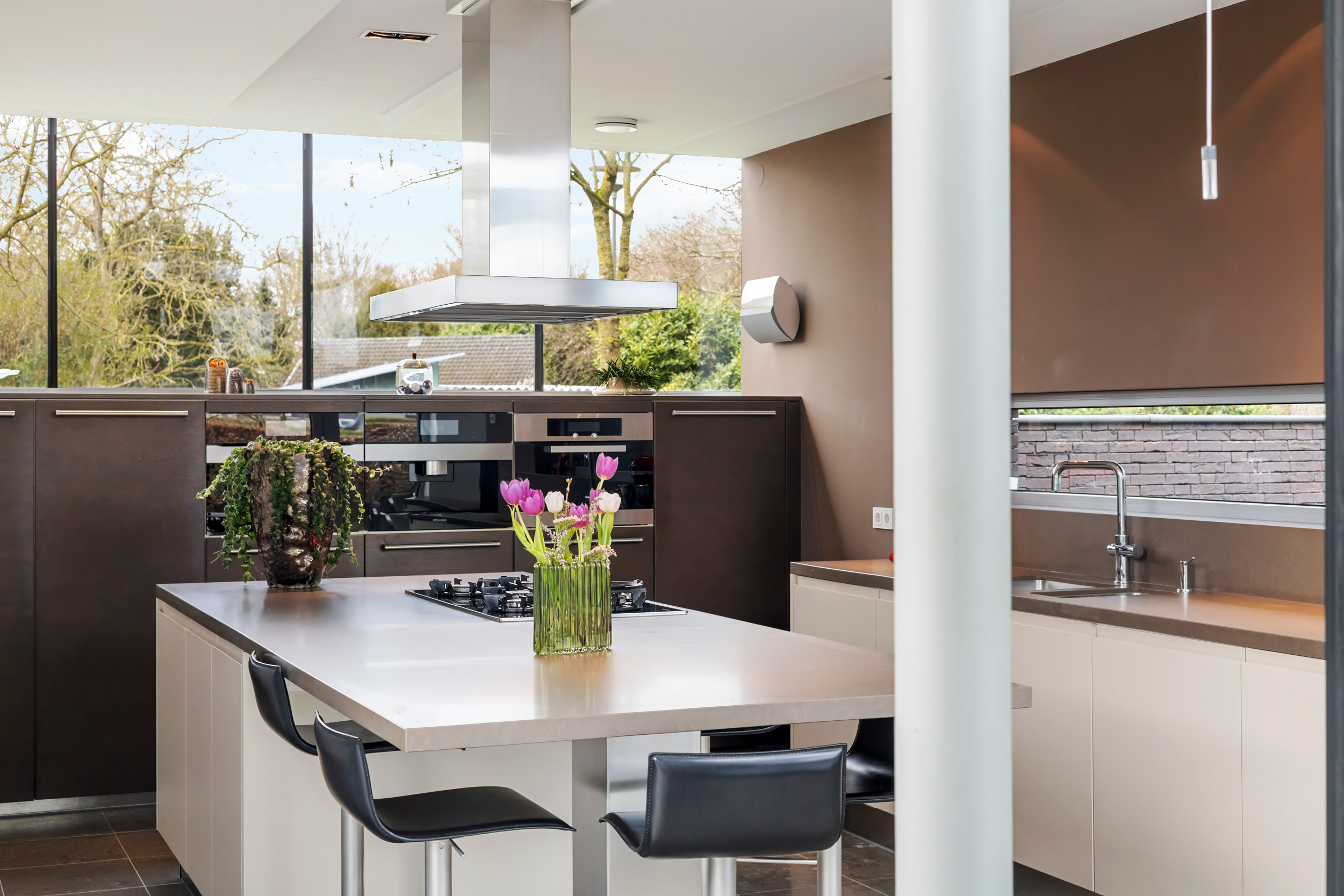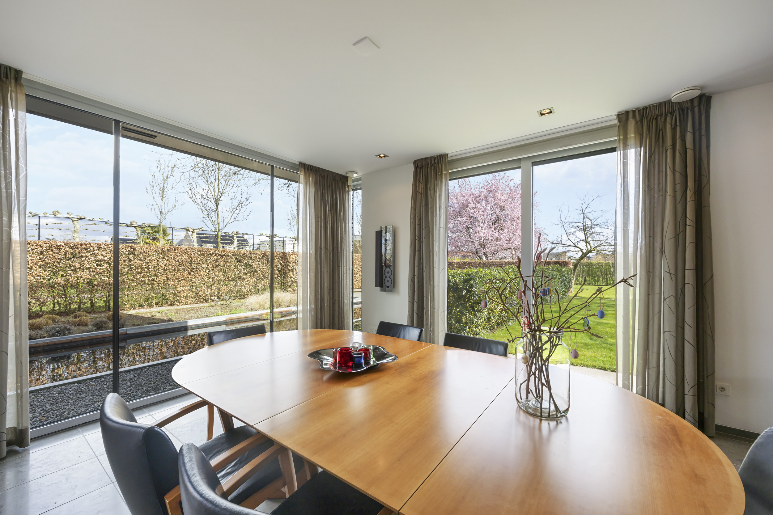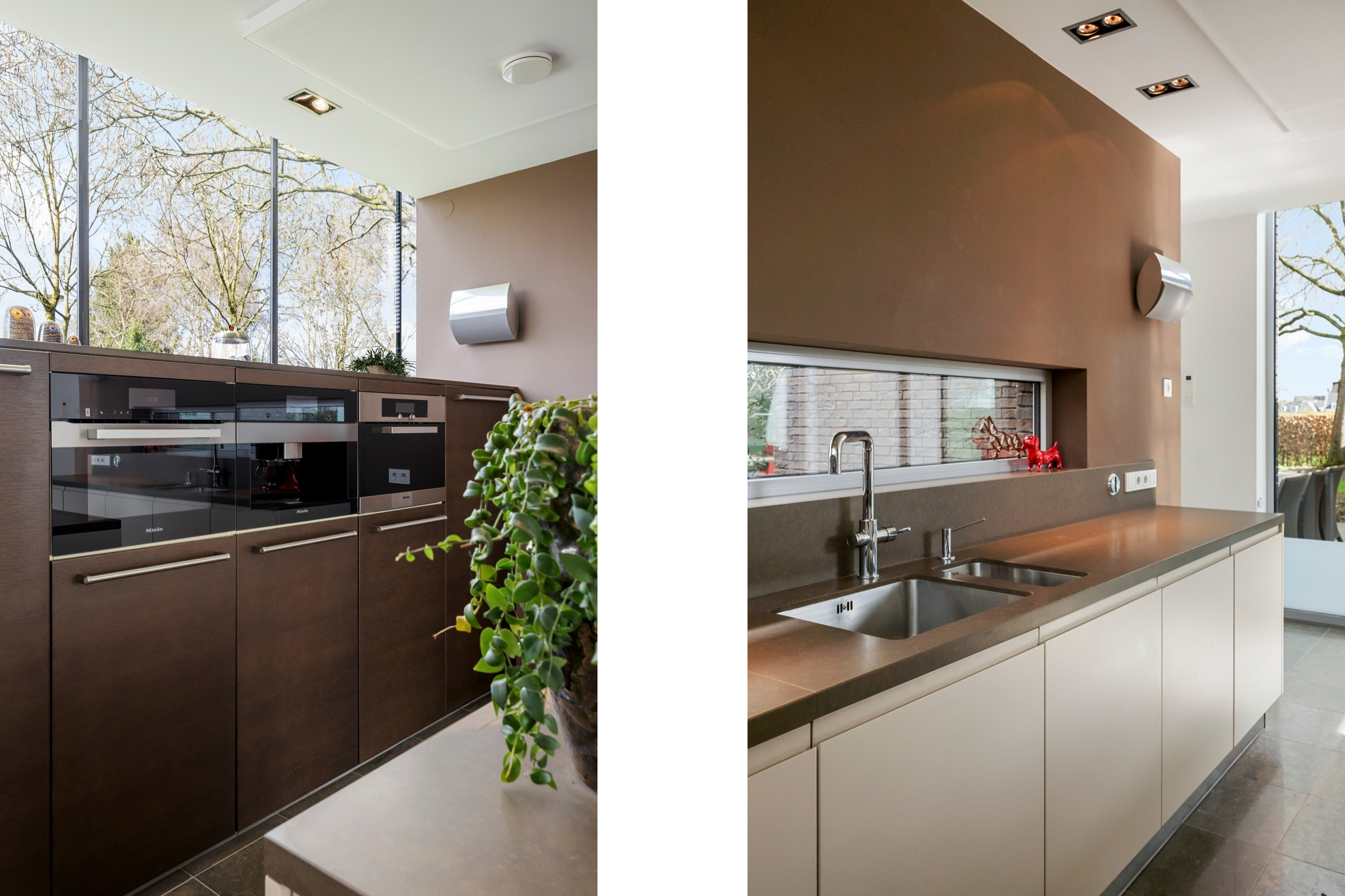De open, maar toch duidelijke verbinding met de aparte keuken maakt koken tot een fijne, lichte en praktische bezigheid. Vanuit de keuken loop je bovendien zo het terras en de patio op. Praktische ruimtes zoals de bijkeuken en de ruime inpandige garage zijn slim verbonden via een overdekte ‘glazen tunnel’. Deze vormt een comfortabele en functionele doorgang die perfect past bij het ontwerp van de villa.