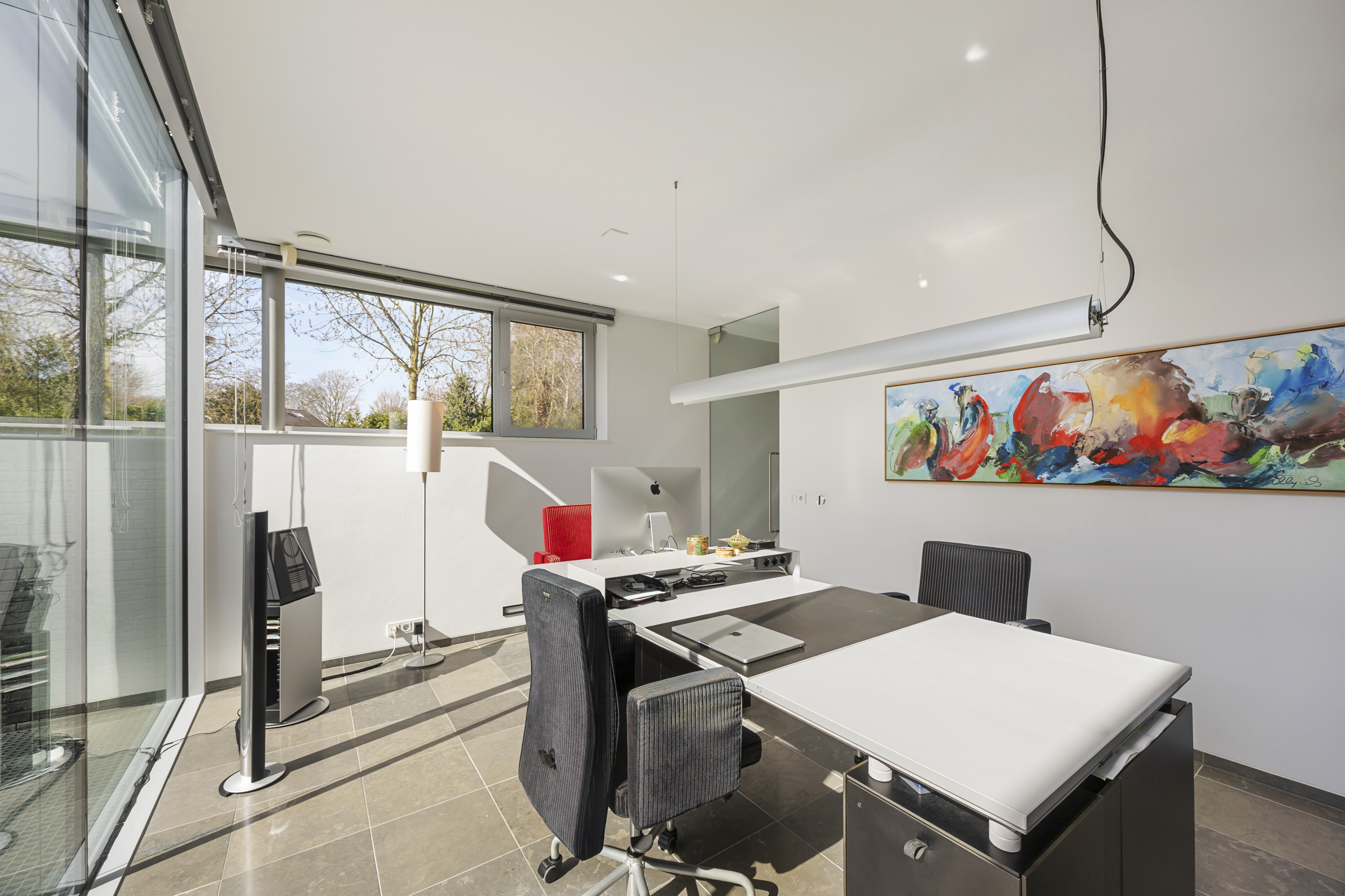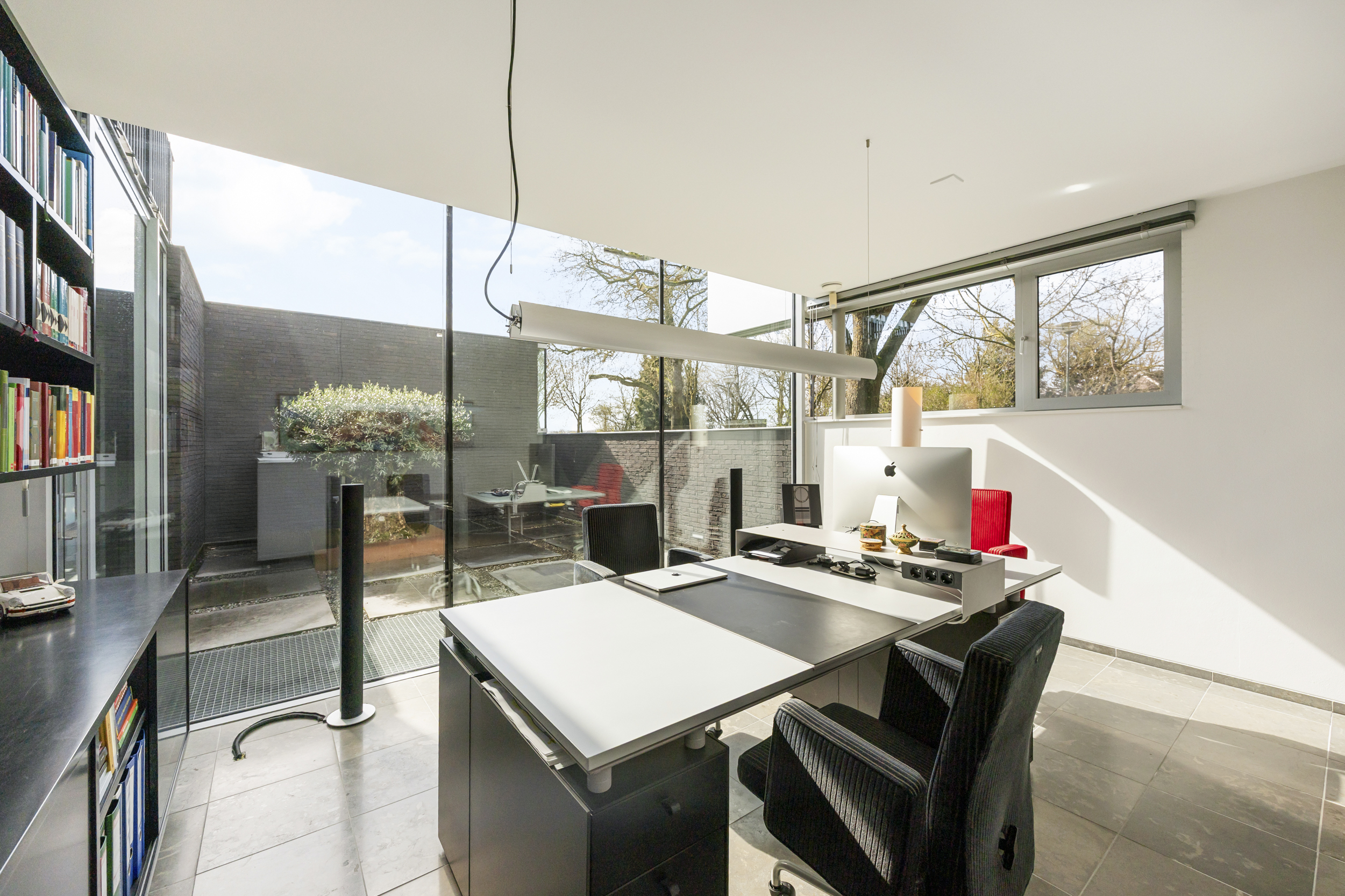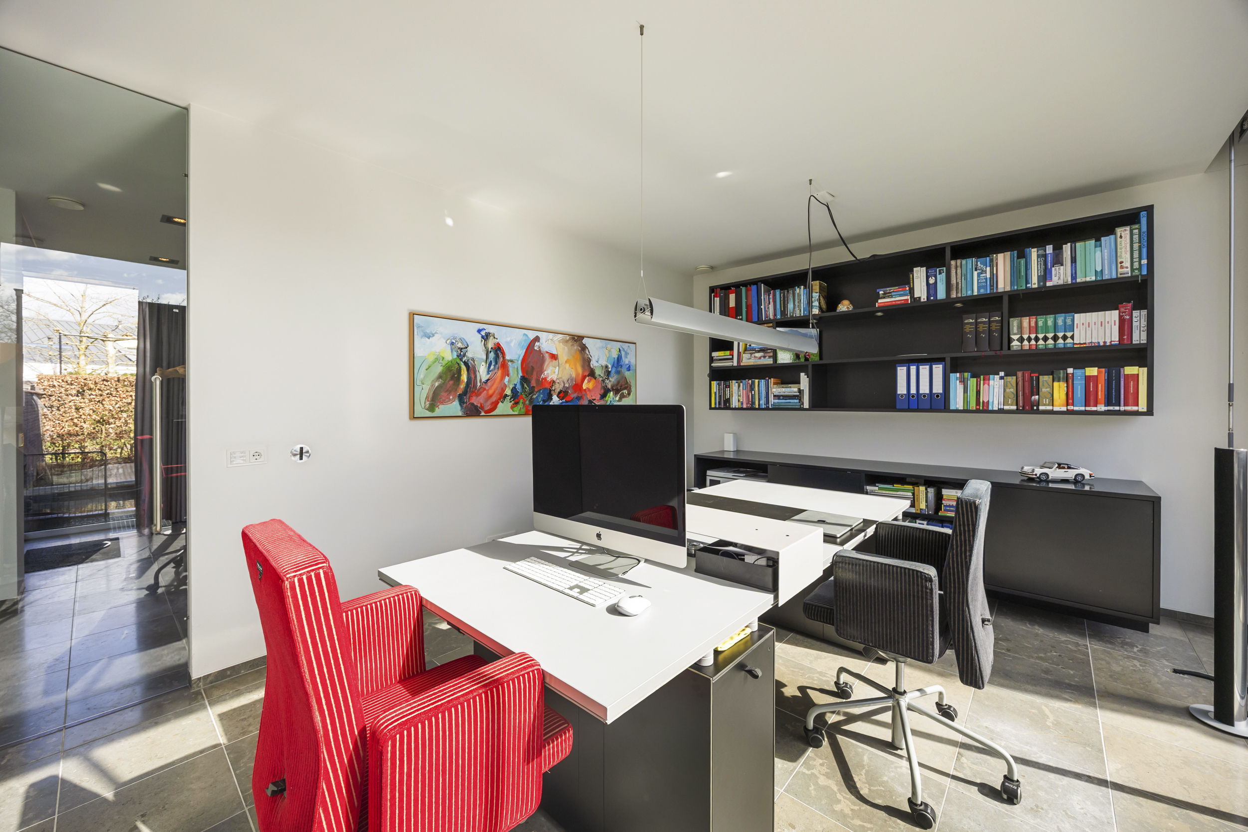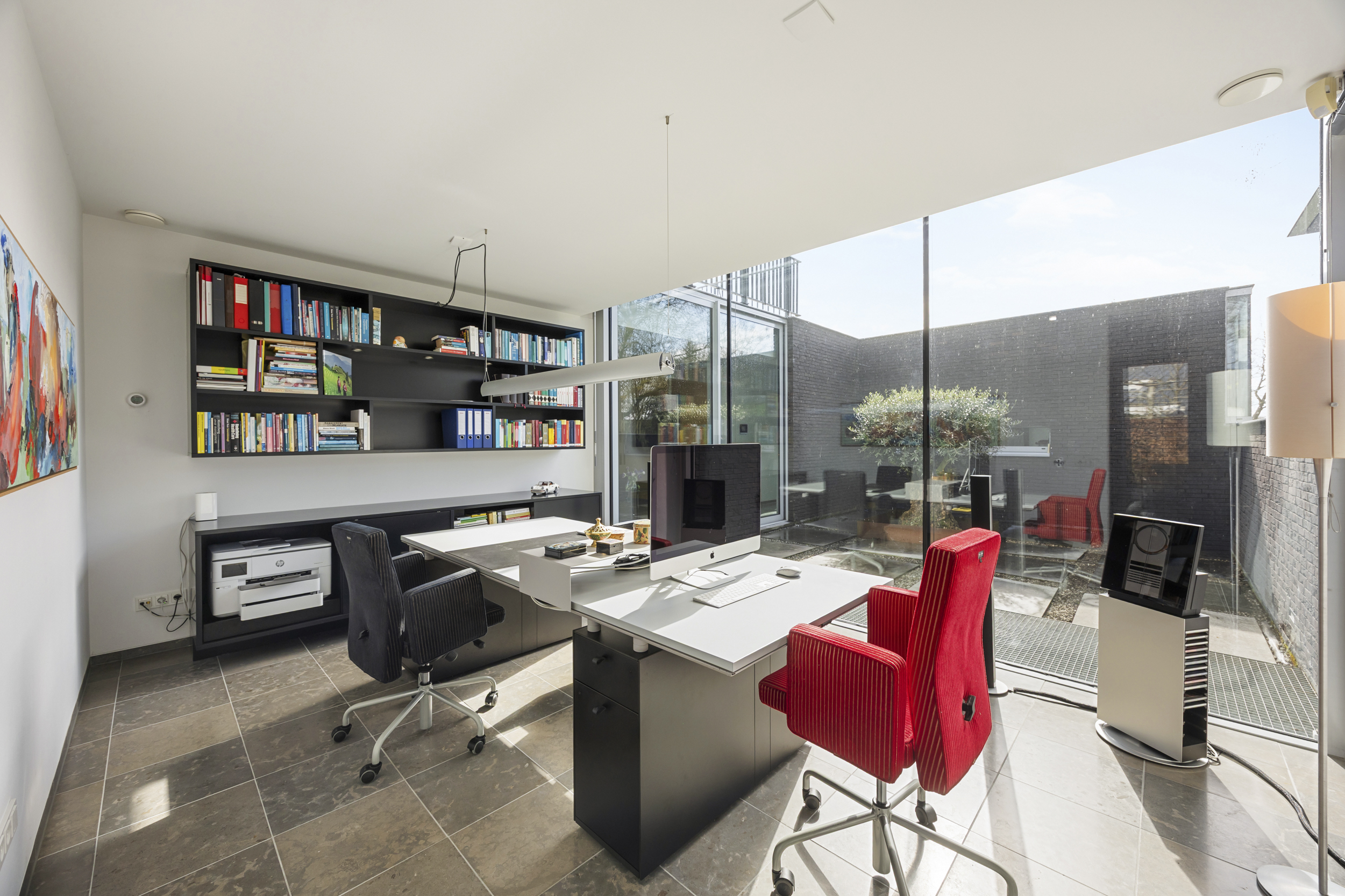 Aan de voorzijde bevindt zich een kantoor, ideaal voor thuiswerken, met uitzicht op de patio en veel daglicht.