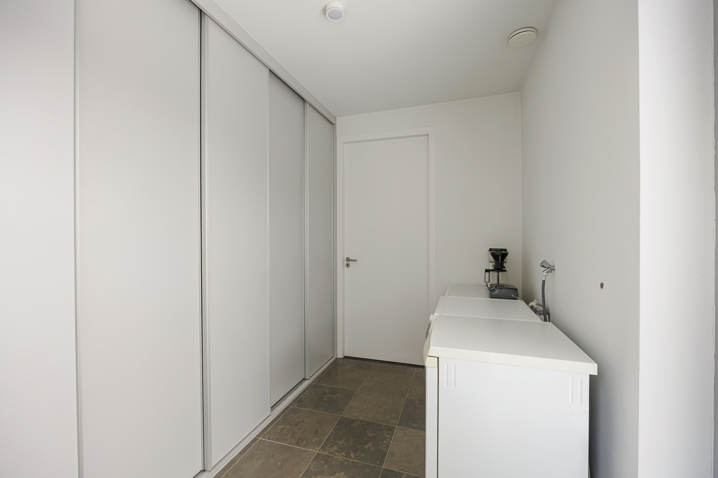 De keuken (ca. 25 m²) is modern en functioneel met kookeiland, geïntegreerde eettafel en hoogwaardige inbouwapparatuur, en beschikt over directe toegang tot het terras en de patio. Aangrenzend bevindt zich een glazen tussenhal die beschut leidt naar de bijkeuken en de garage. De bijkeuken is praktisch ingericht met aansluitingen voor wasmachine en droger en biedt voldoende extra bergruimte.