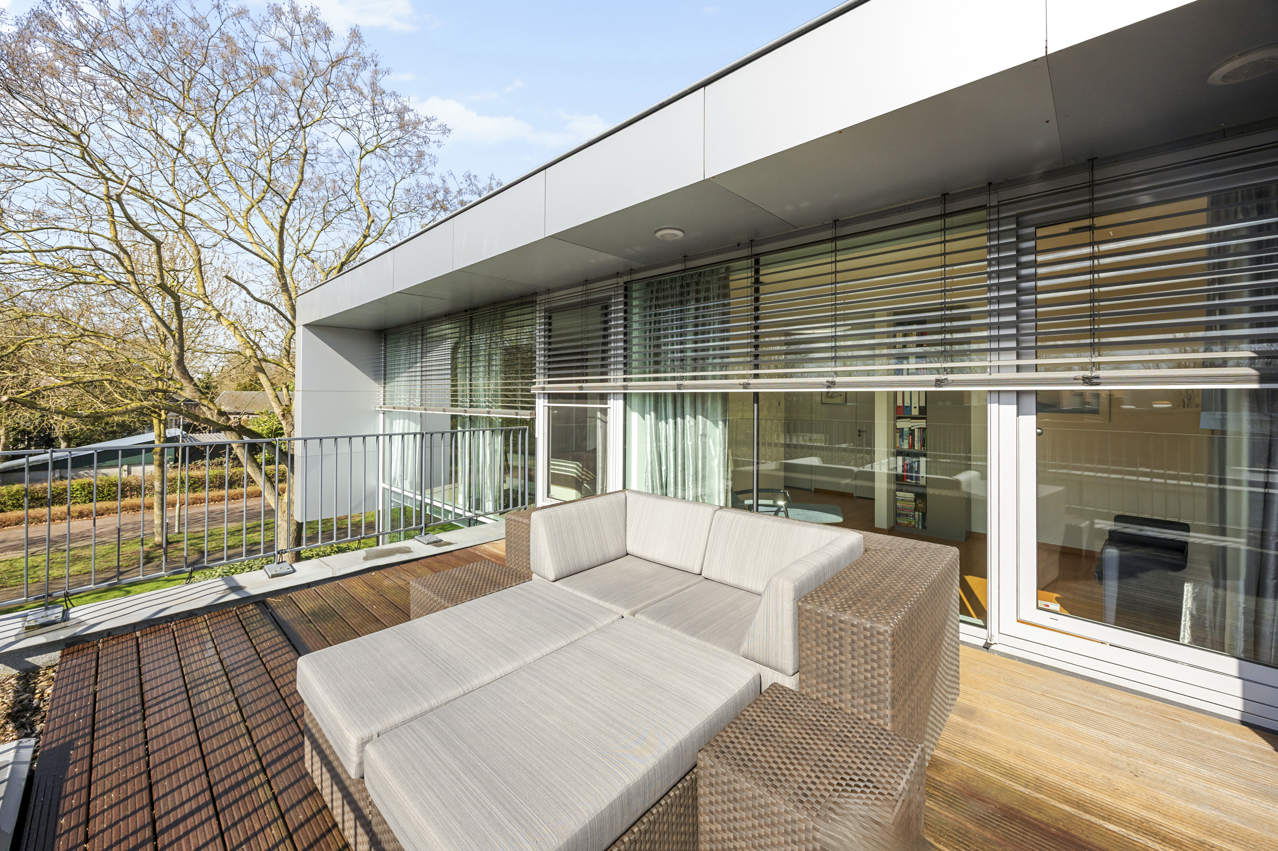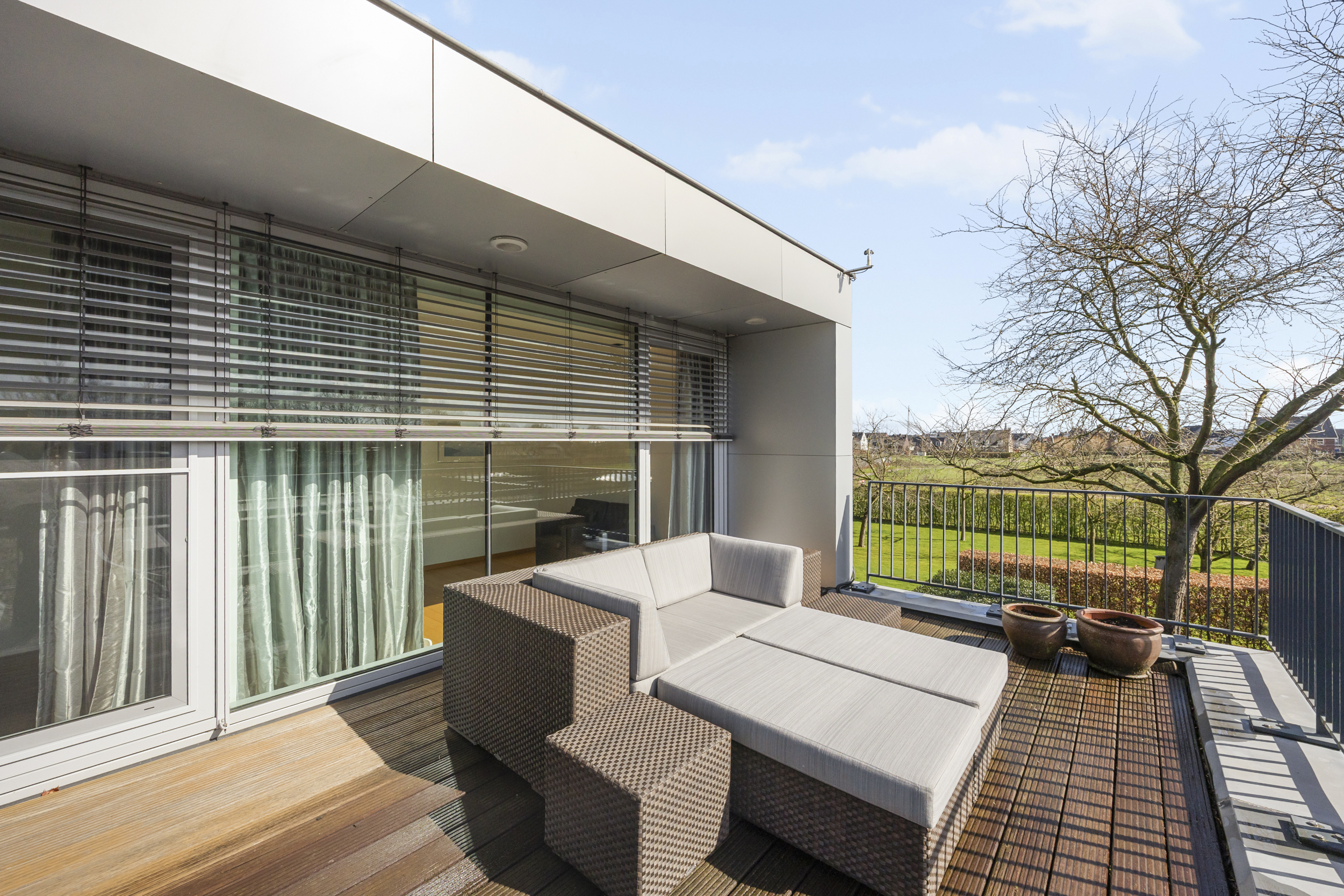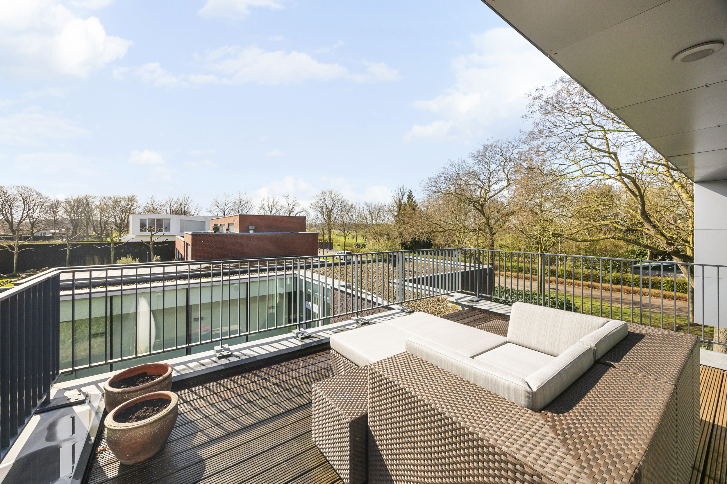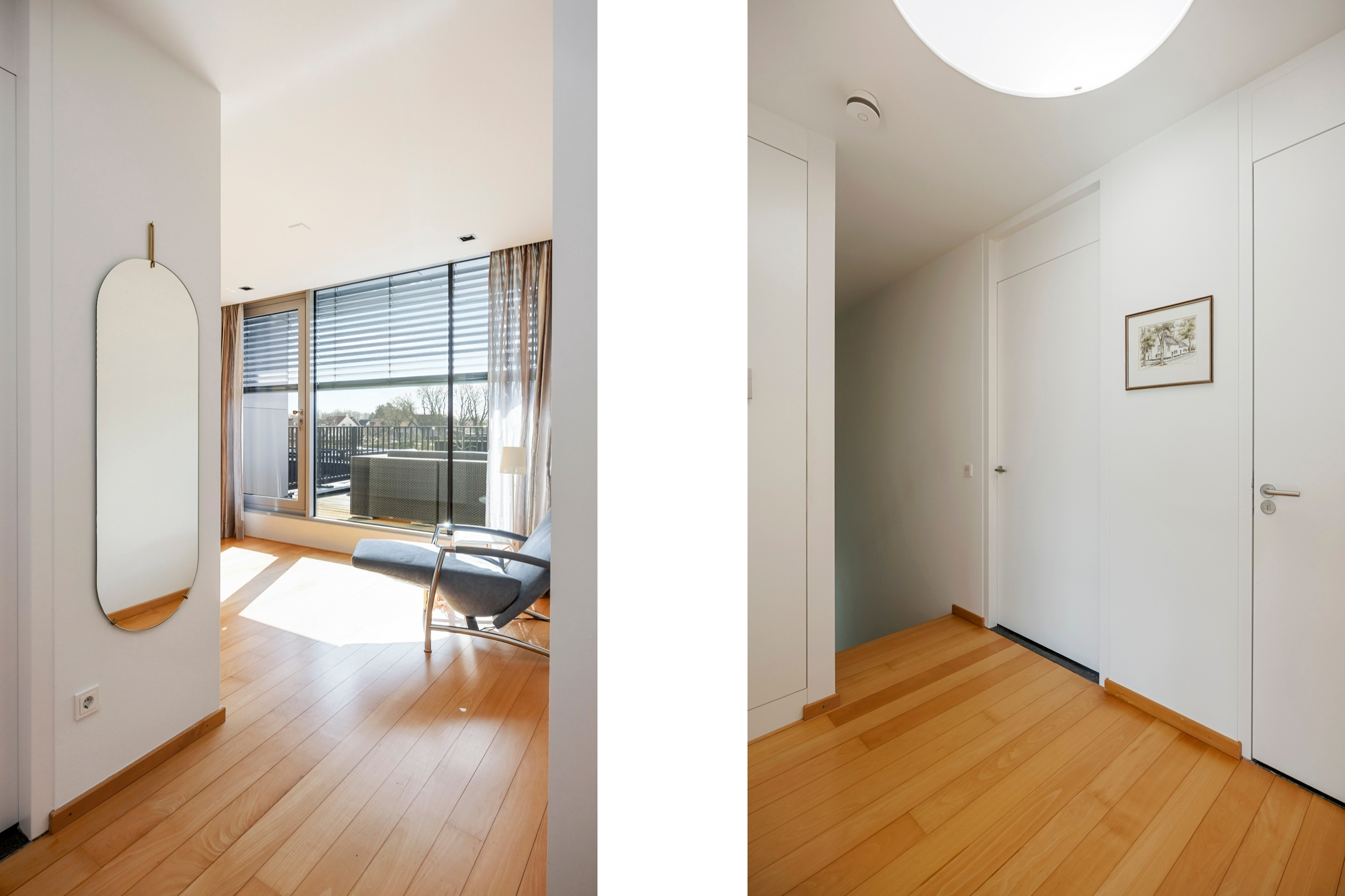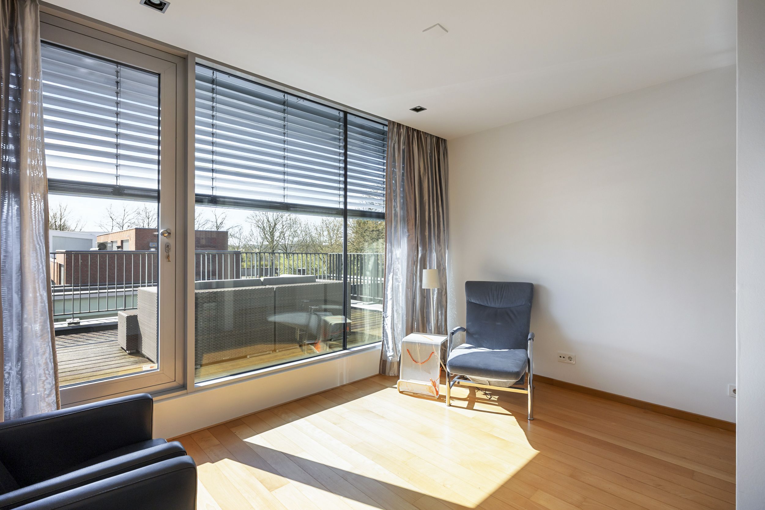 Via de elegante beukenhouten trap bereikt u een royale, lichte overloop die naadloos overgaat in een open werk- of studieruimte. Vanuit hier is het ruime dakterras bereikbaar, waar binnen en buiten prachtig samenkomen.