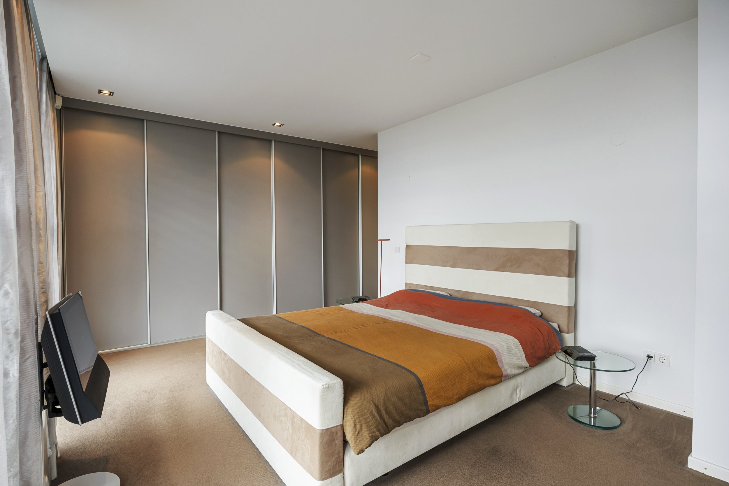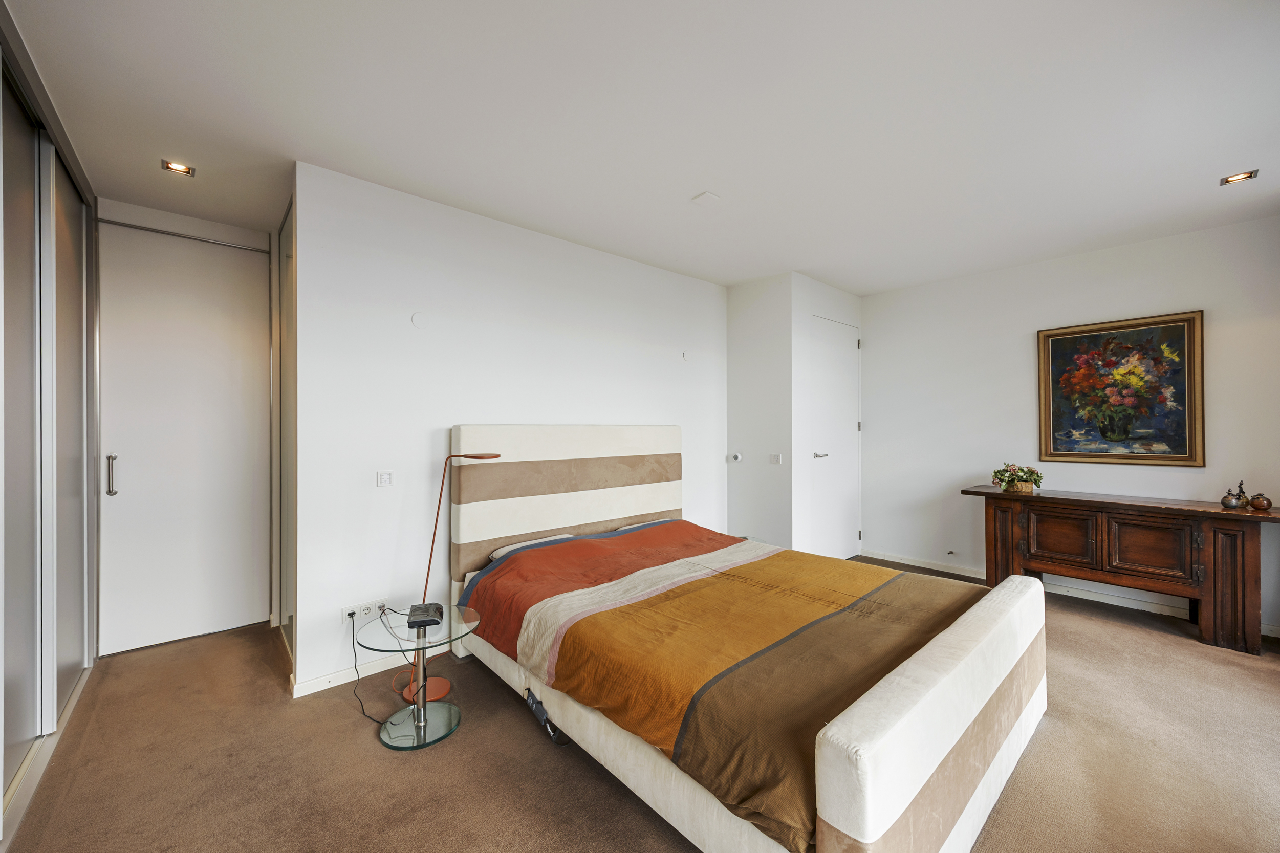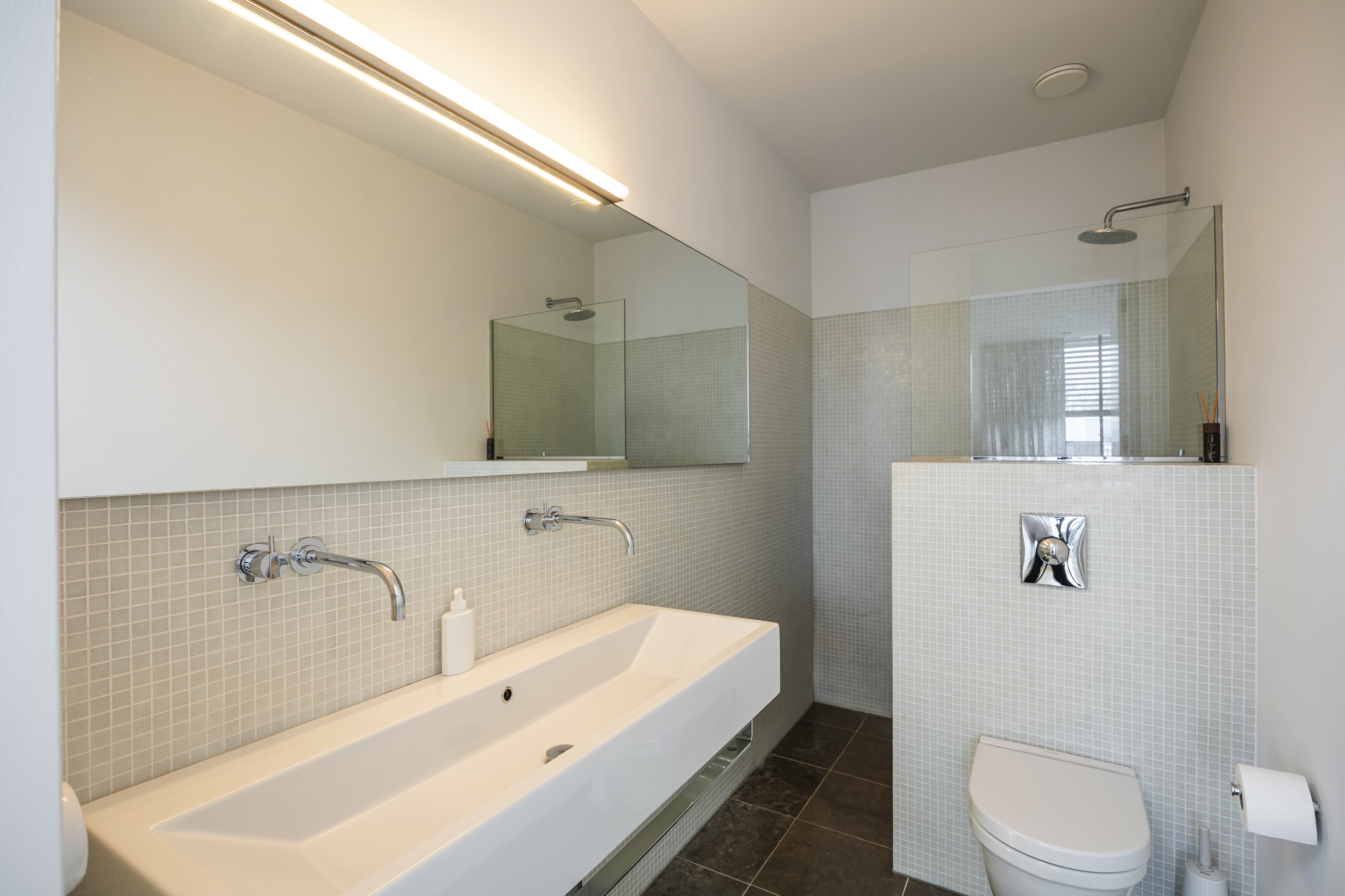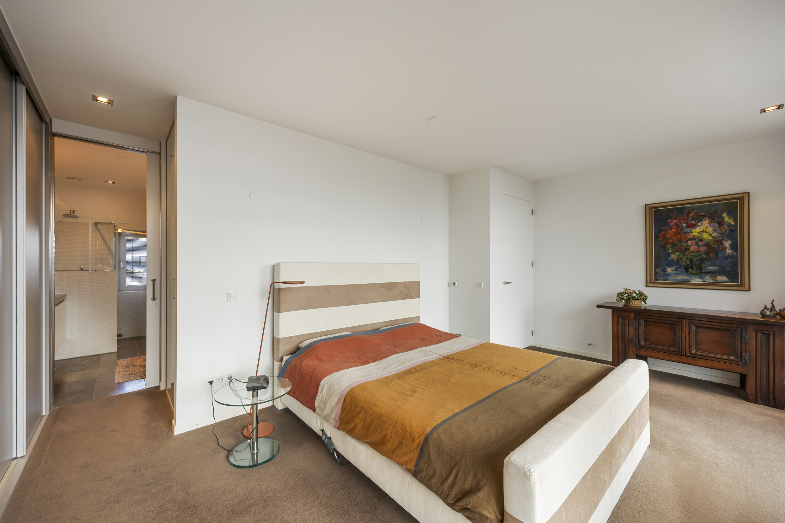 De masterbedroom vormt een luxe privésuite met grote raampartijen, directe toegang tot het dakterras, een ruime kastenwand en een luxe ensuite badkamer met ligbad, regendouche, dubbele wastafel en toilet. Twee aanvullende slaapkamers delen een tweede badkamer met inloopdouche, dubbele wastafel en toilet, wat een hoog niveau van comfort en privacy biedt.