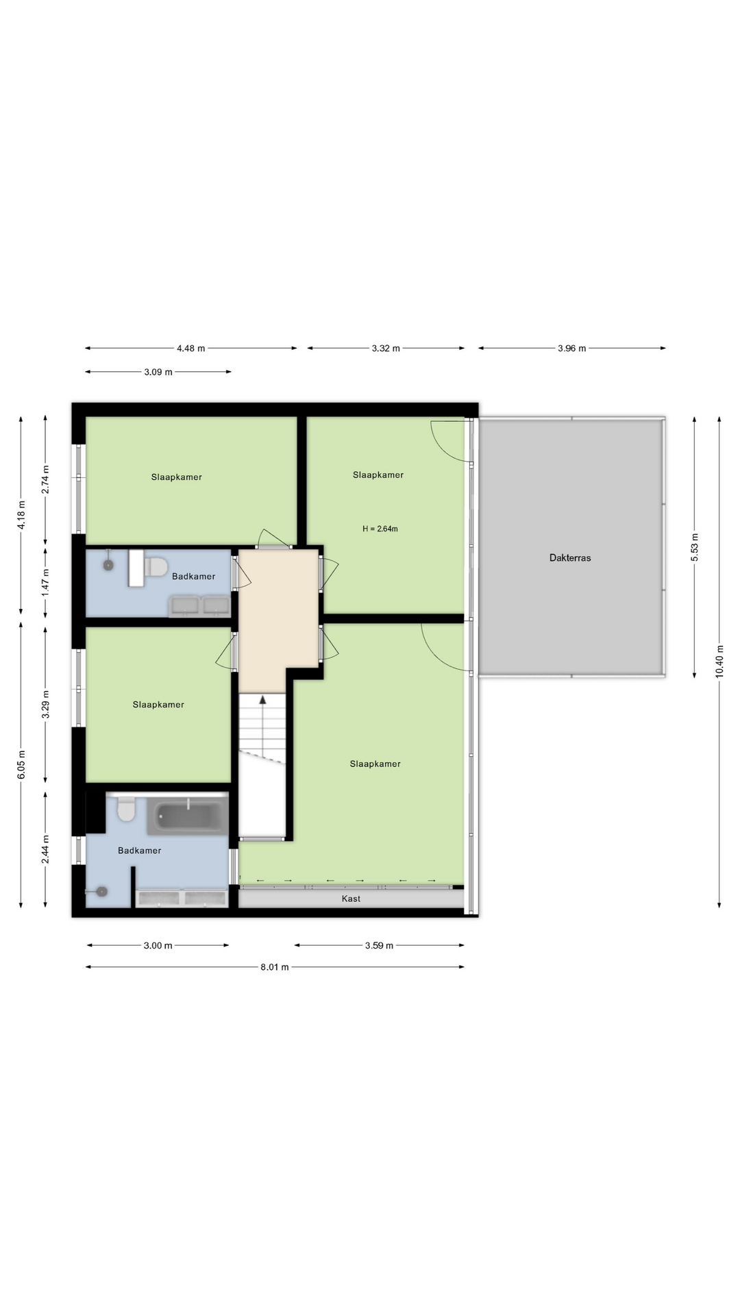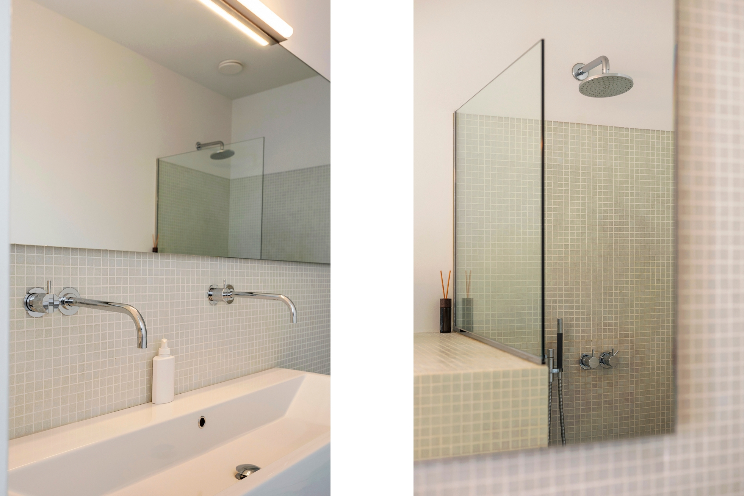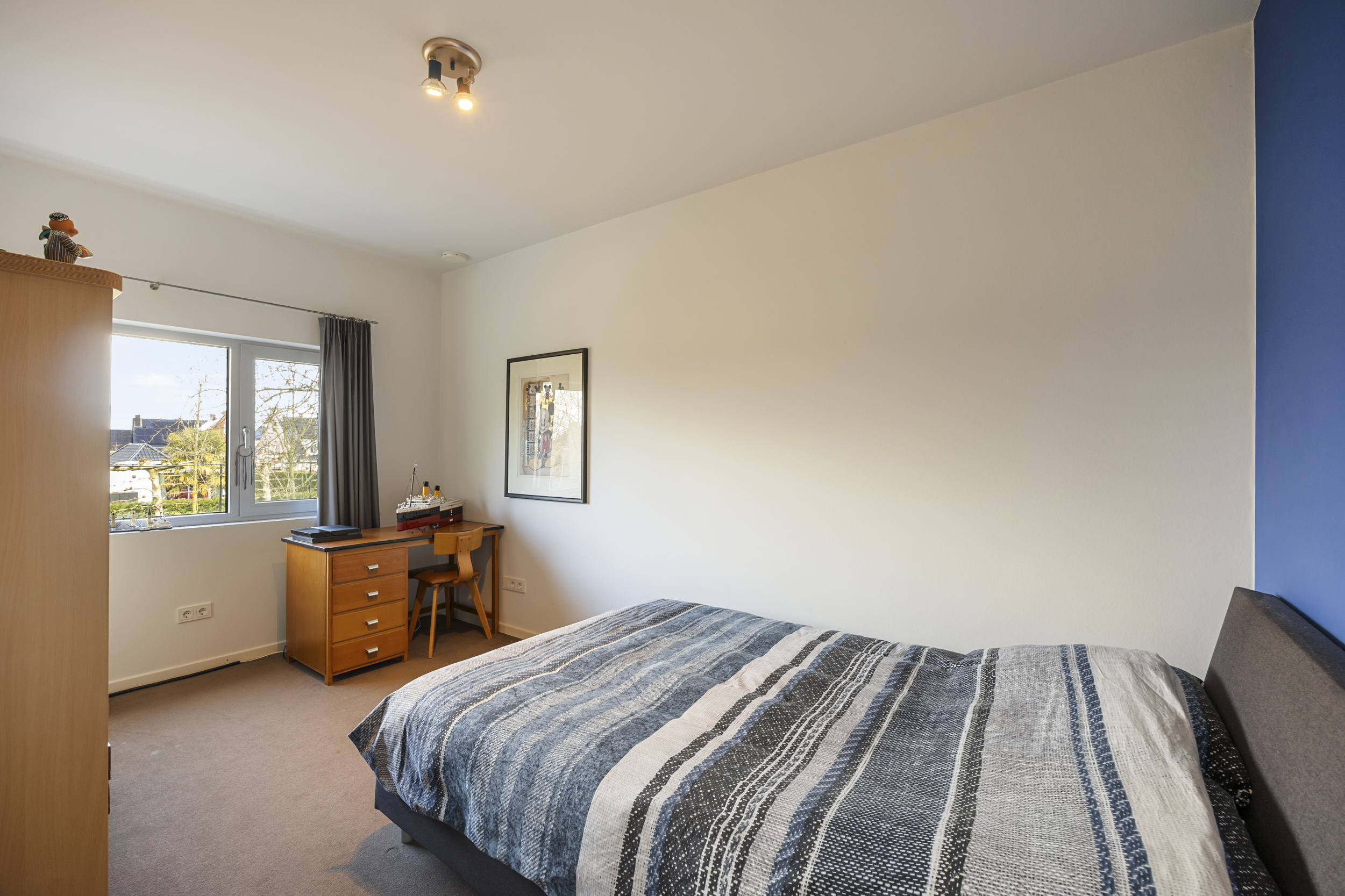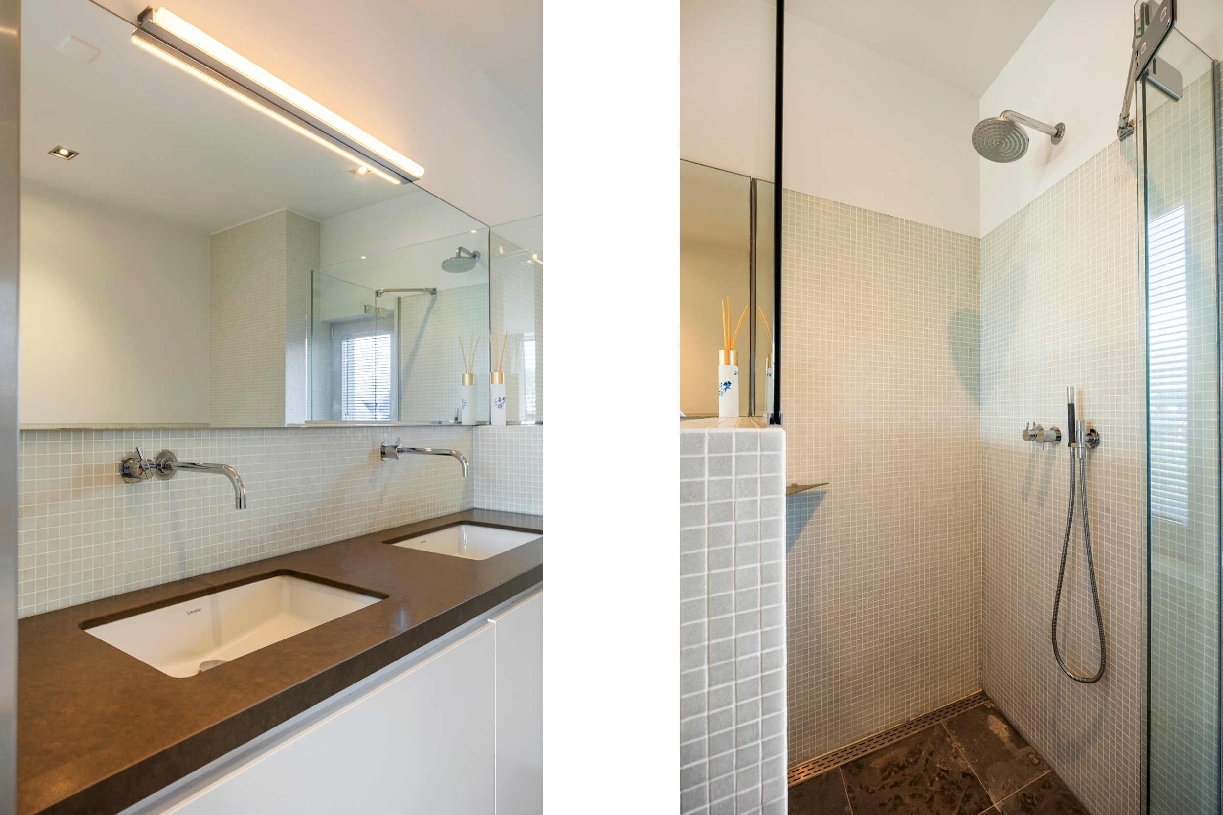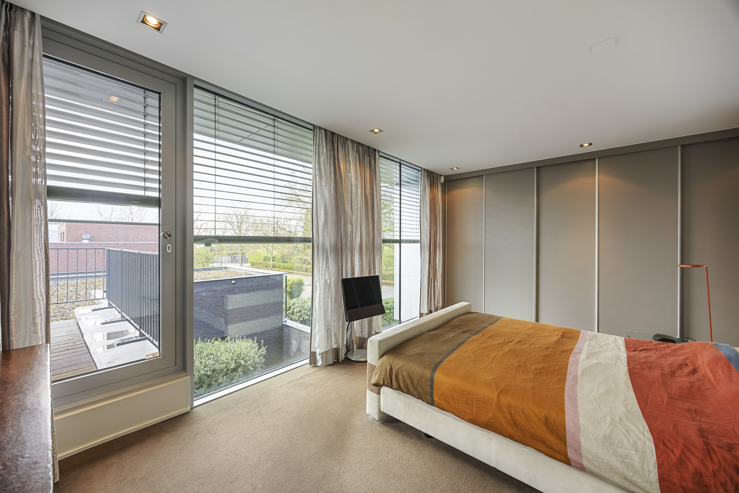 De masterbedroom vormt een luxe privésuite met grote raampartijen, directe toegang tot het dakterras, een ruime kastenwand en een luxe ensuite badkamer met ligbad, regendouche, dubbele wastafel en toilet. Twee aanvullende slaapkamers delen een tweede badkamer met inloopdouche, dubbele wastafel en toilet, wat een hoog niveau van comfort en privacy biedt.