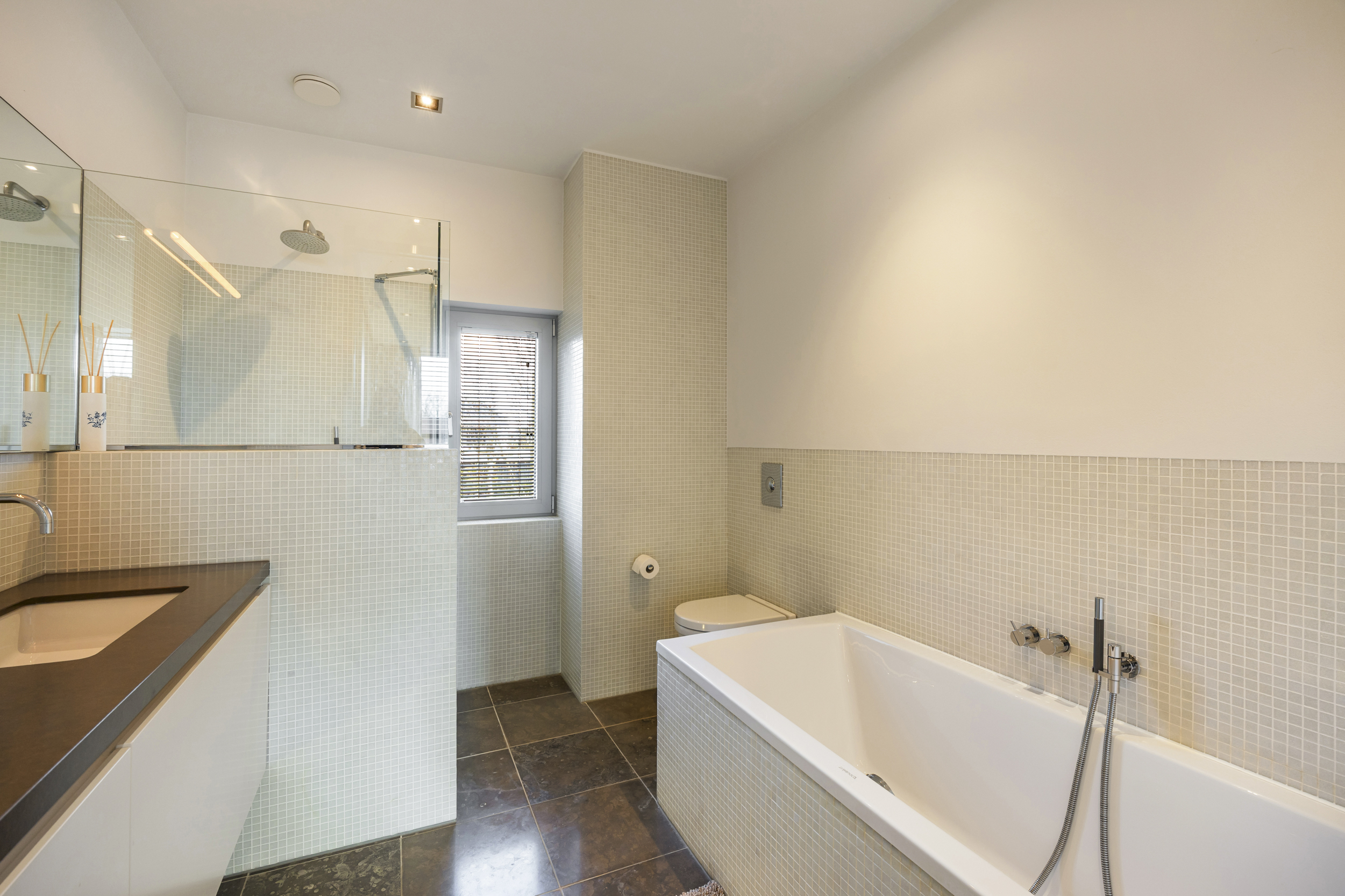 Op de eerste verdieping bevinden zich een open functionele ruimte (eventueel 4e slaapkamer), drie ruime slaapkamers en twee badkamers. De masterbedroom met eigen ensuite badkamer en royale kastenwand. Het dakterras maakt het plaatje compleet. Ook hier vloeit binnen en buiten prachtig in elkaar over, met een weids uitzicht over de omgeving en natuurgebied De Doort.