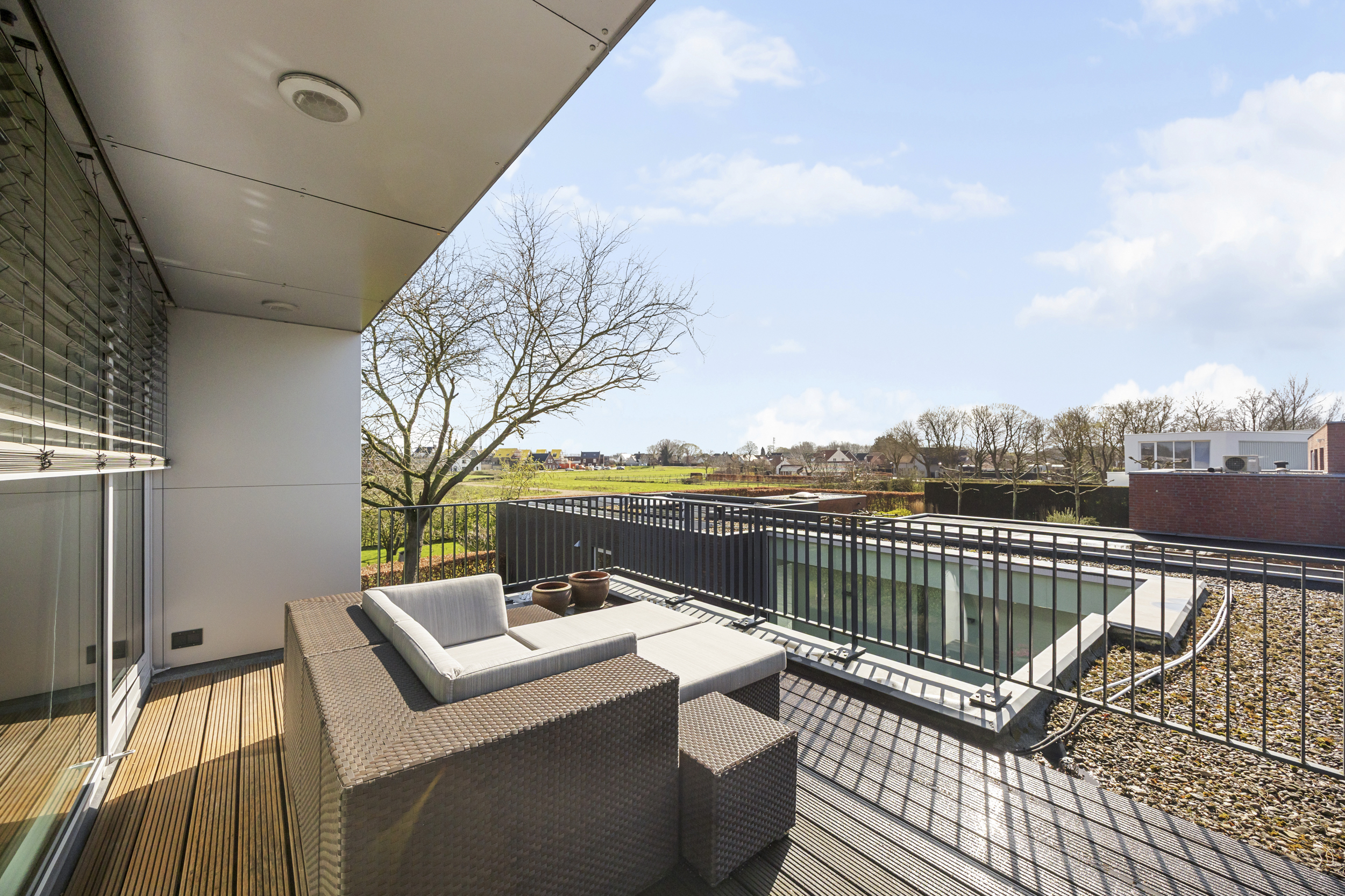 Het royale dakterras biedt volop ruimte voor loungen of dineren en is voorzien van elektra en geluidsinstallatie, waardoor het een perfecte plek is om te ontspannen, te genieten van de zon of van het uitzicht over de omgeving en natuurgebied De Doort.