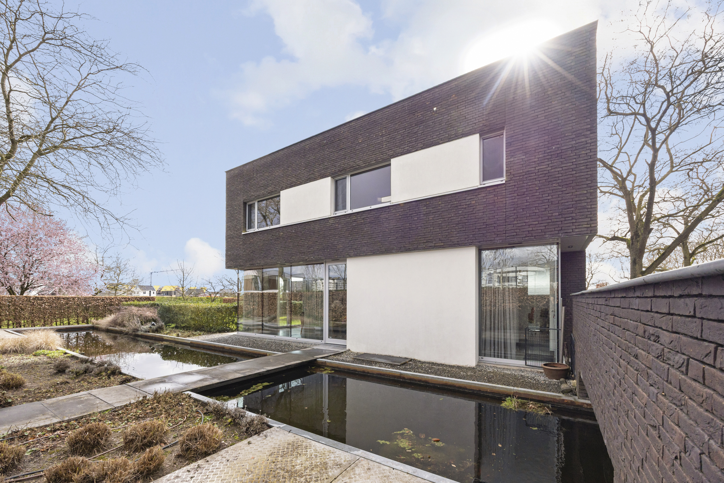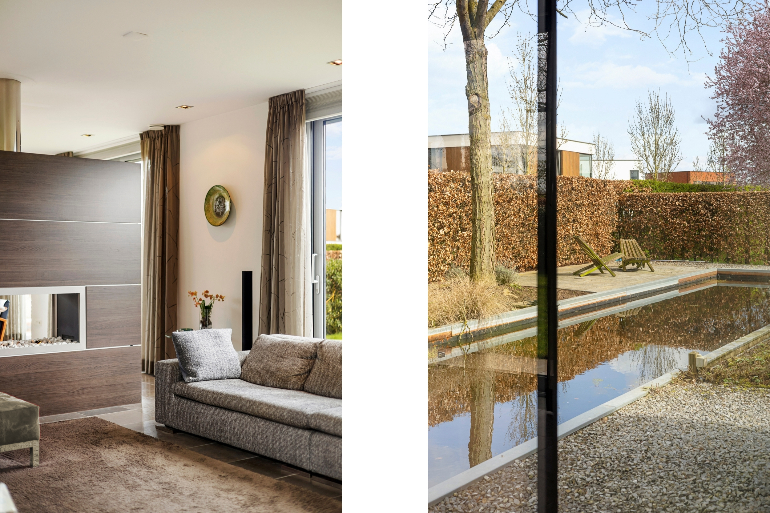 Een bijzonder element is de vijver, die op subtiele wijze de voor- en achtertuin met elkaar verbindt. Deze waterpartij versterkt de lange zichtlijnen van de woning en geeft de tuin een serene, bijna meditatieve sfeer. Het kabbelende water en de weerspiegeling van het groen maken dit tot een plek waar u vanzelf even stil wordt.
