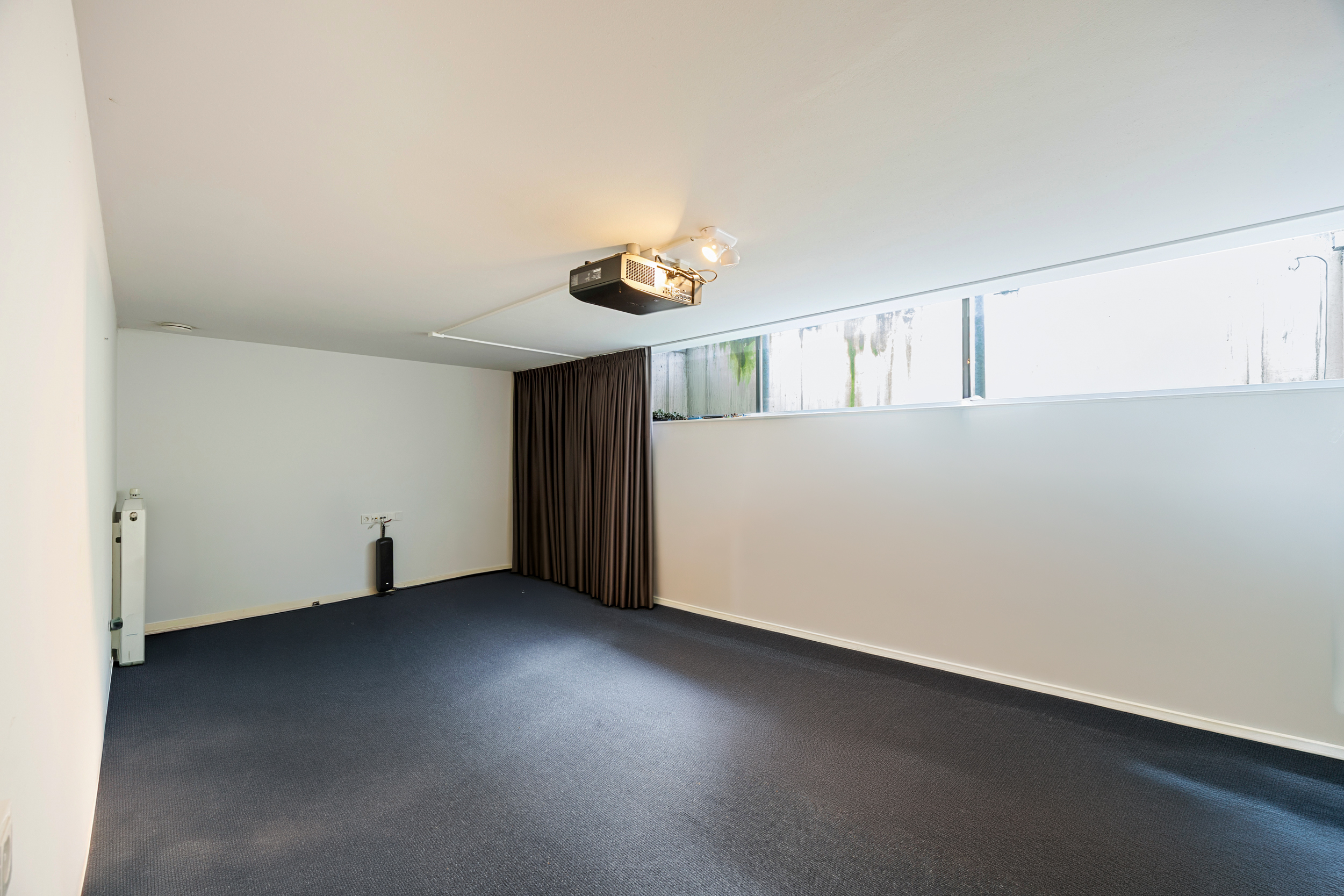 Aan de voorzijde bevindt zich een kantoor, ideaal voor thuiswerken, met uitzicht op de patio en veel daglicht. Het souterrain biedt verrassend veelzijdige mogelijkheden: extra slaap- of werkruimte, hobbyruimte of zelfs een thuisbioscoop, plus royale bergruimte.