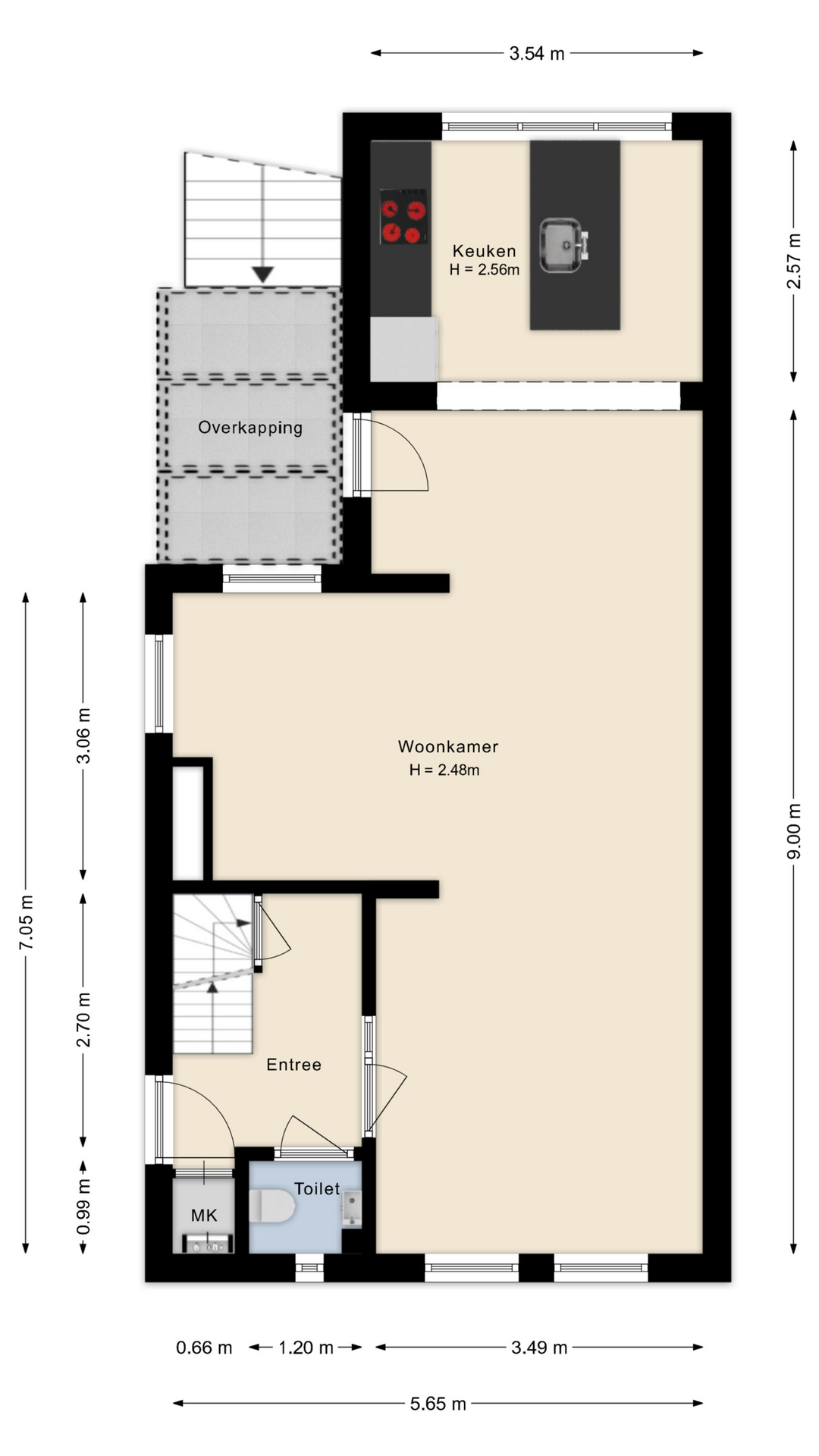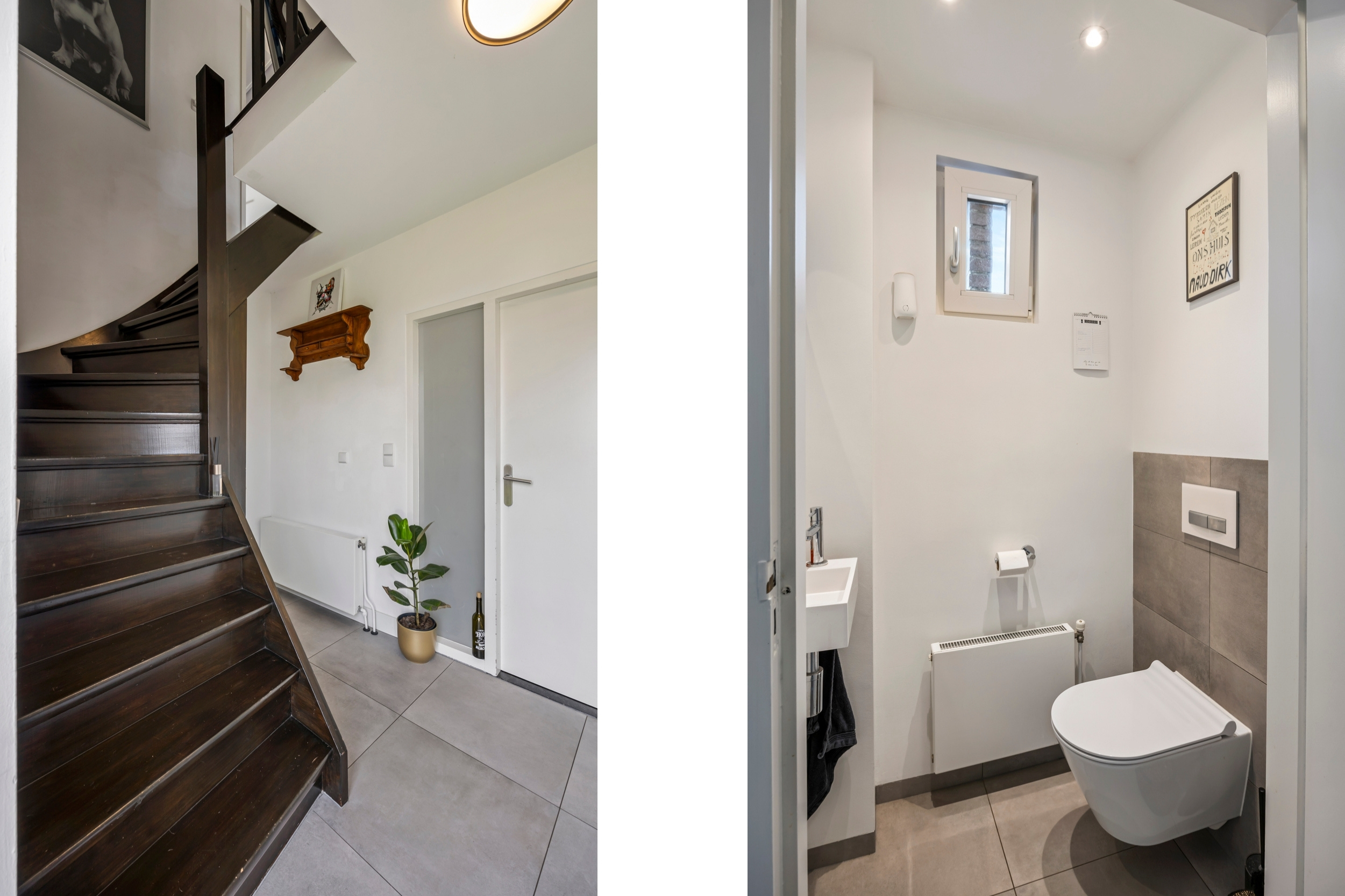 Via de entree komt u binnen in een verzorgde hal met meterkast, trapopgang naar de eerste verdieping en het souterrain en een moderne, luxe gastentoilet.