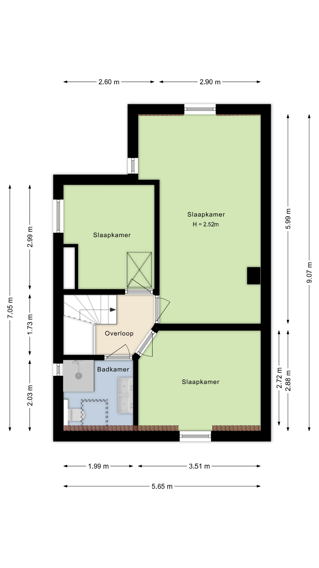 • Derde slaapkamer van ca. 2,99 x 2,60 meter