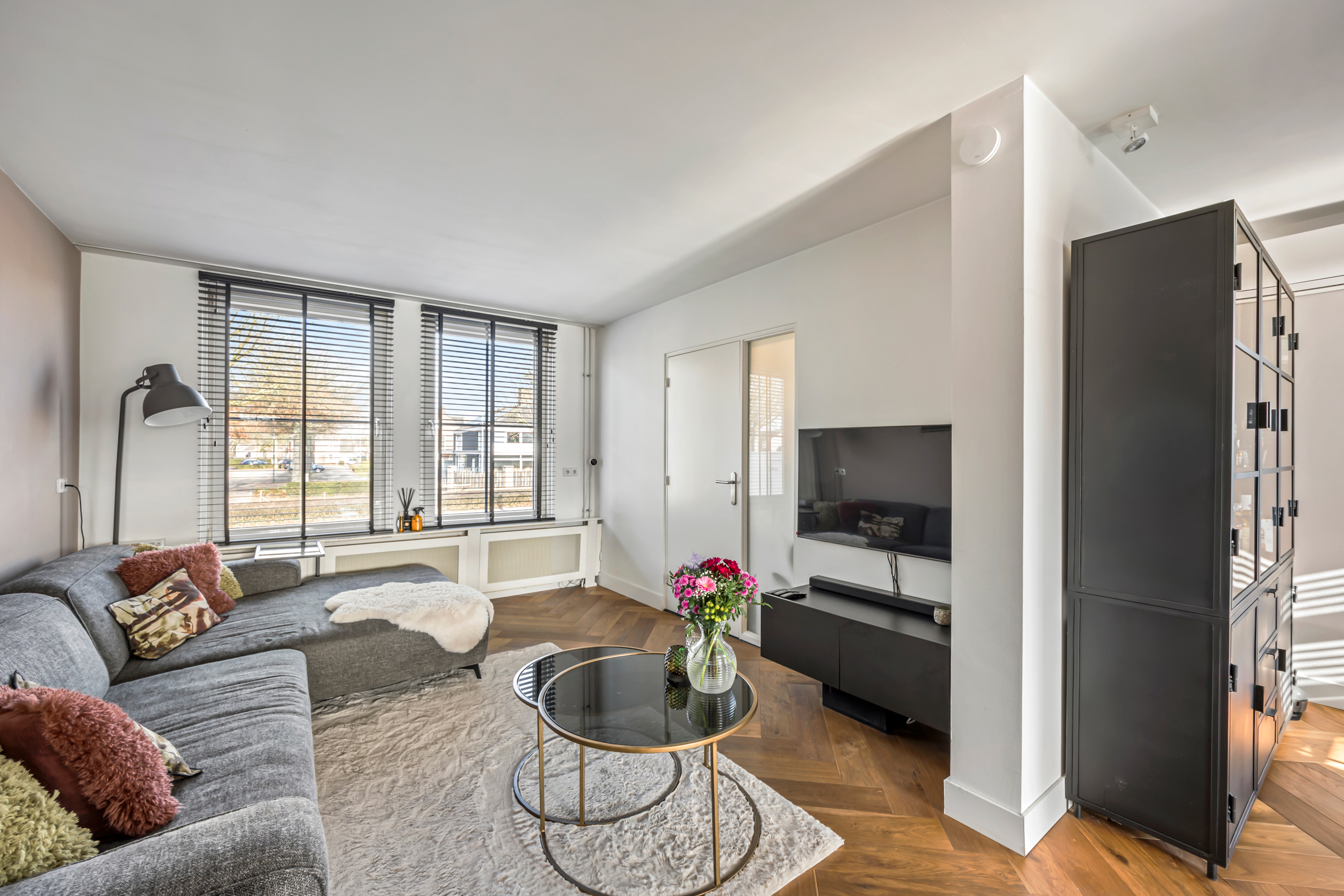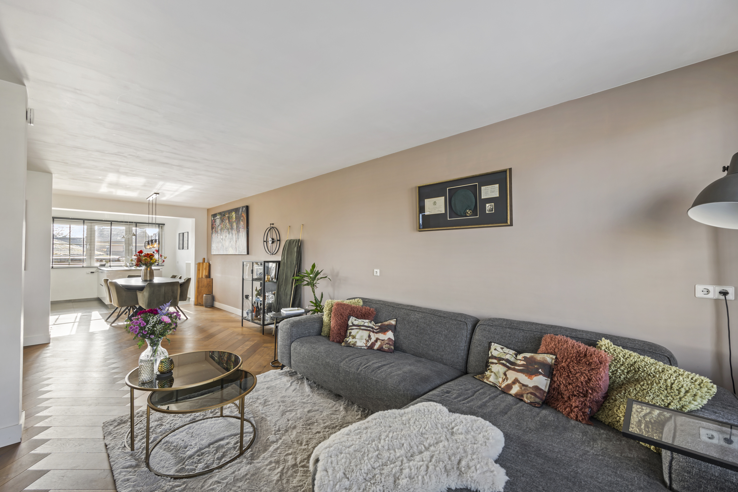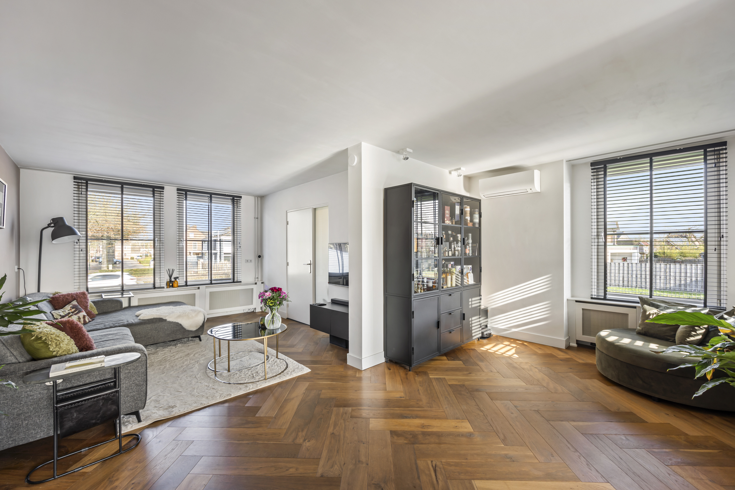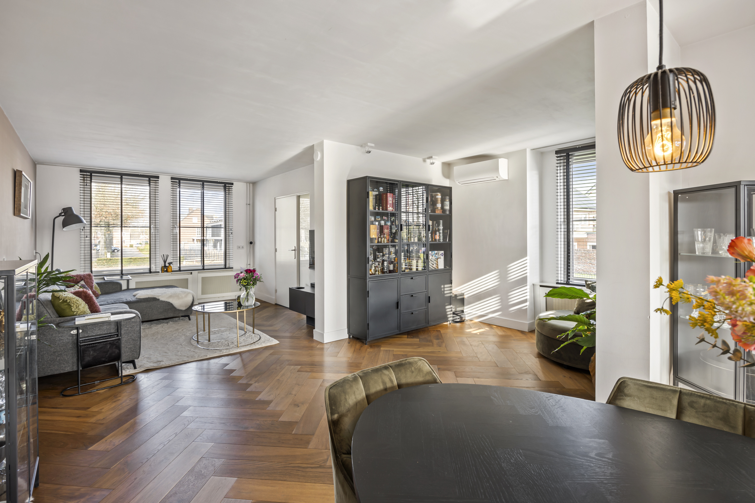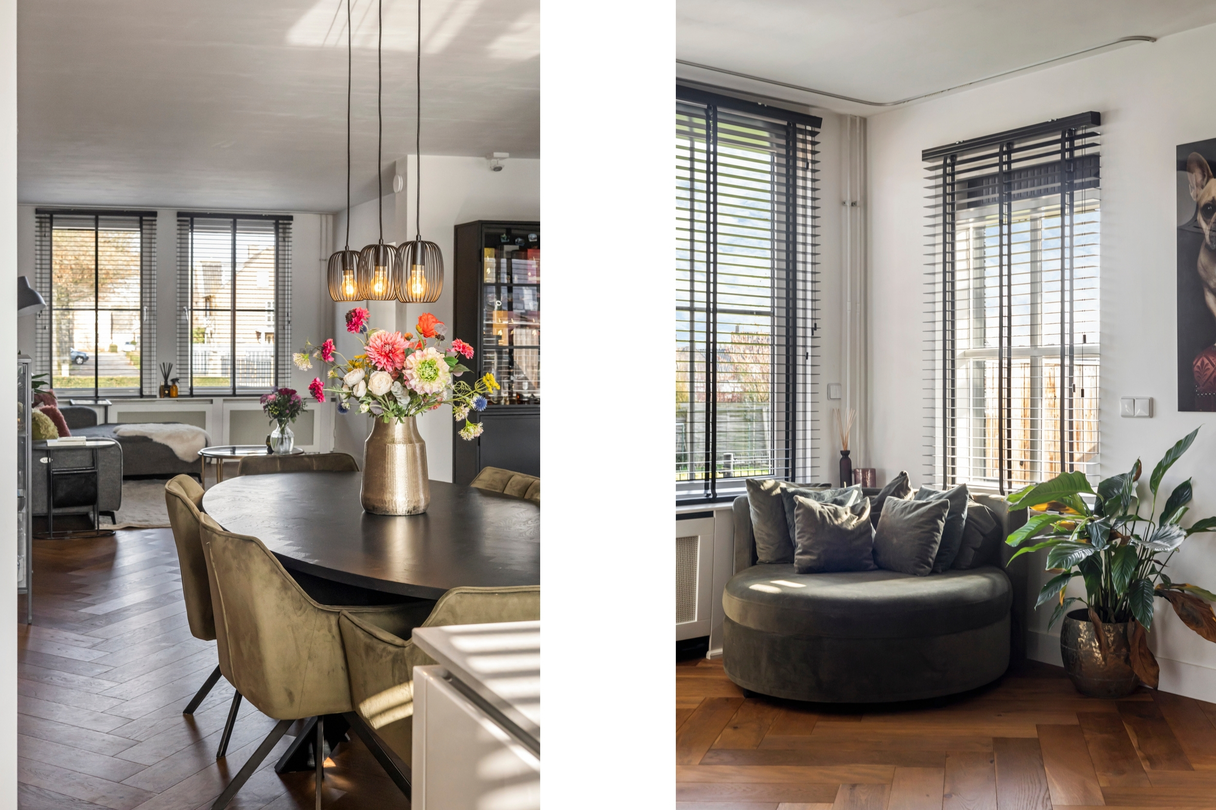 De T-vormige woonkamer is ruim en licht, met massief eikenhouten plankenvloer die direct voor sfeer zorgt. Aan de voorzijde creëert u eenvoudig een gezellige zithoek. Aan de voorzijde heeft u een mooi zicht op het Raadhuisplein.