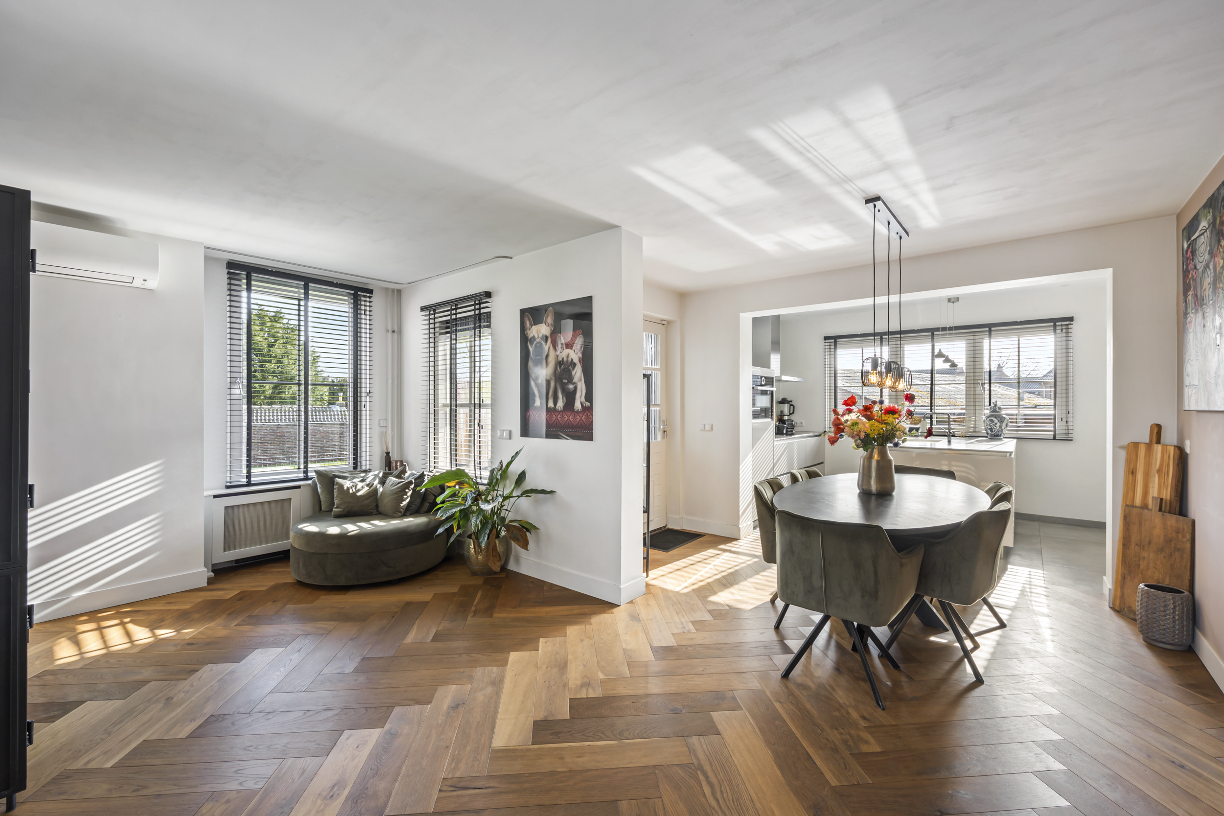 Op de begane grond ervaart u direct de prettige lichtinval in de T-vormige woonkamer. De massief eikenhouten vloer geeft de ruimte warmte en karakter, terwijl de indeling zorgt voor een natuurlijke scheiding tussen zit- en eetgedeelte. Aansluitend bevindt zich de moderne open keuken uit 2019 met spoeleiland – een centrale plek in huis waar koken en samenzijn moeiteloos samenkomen.