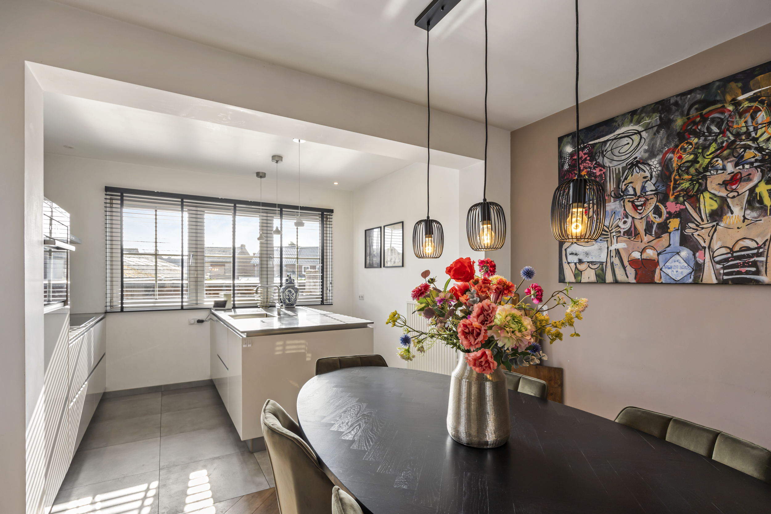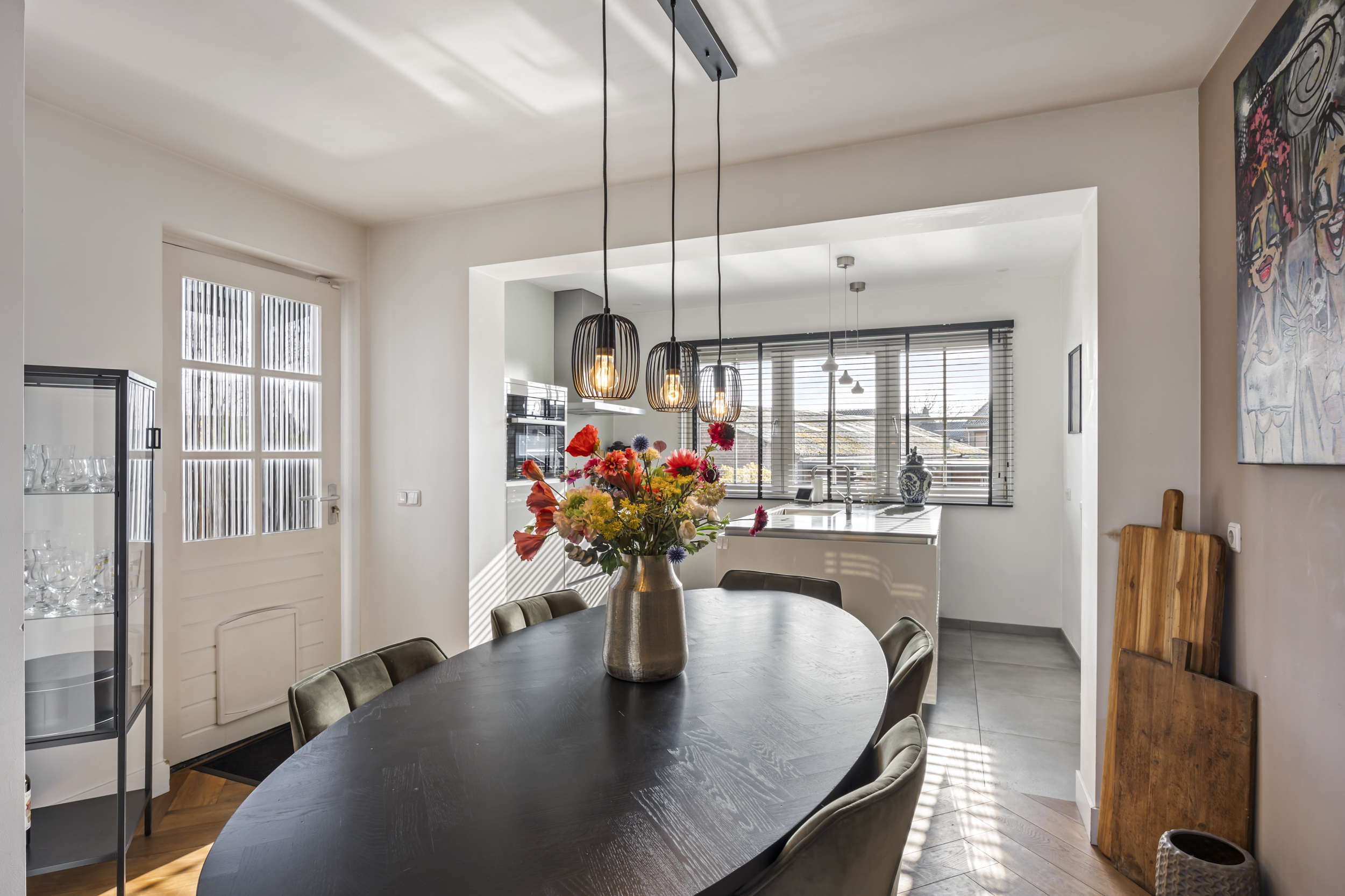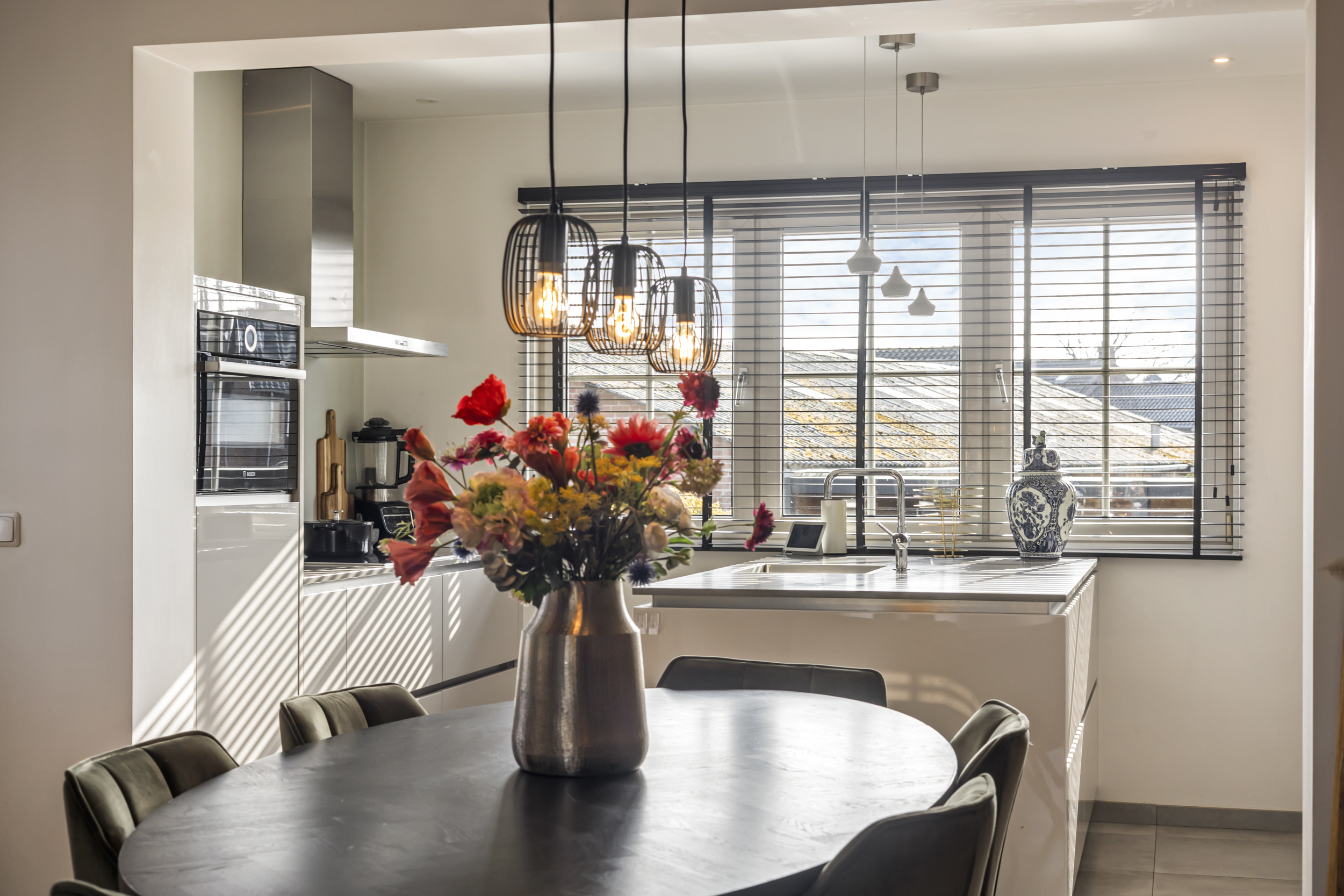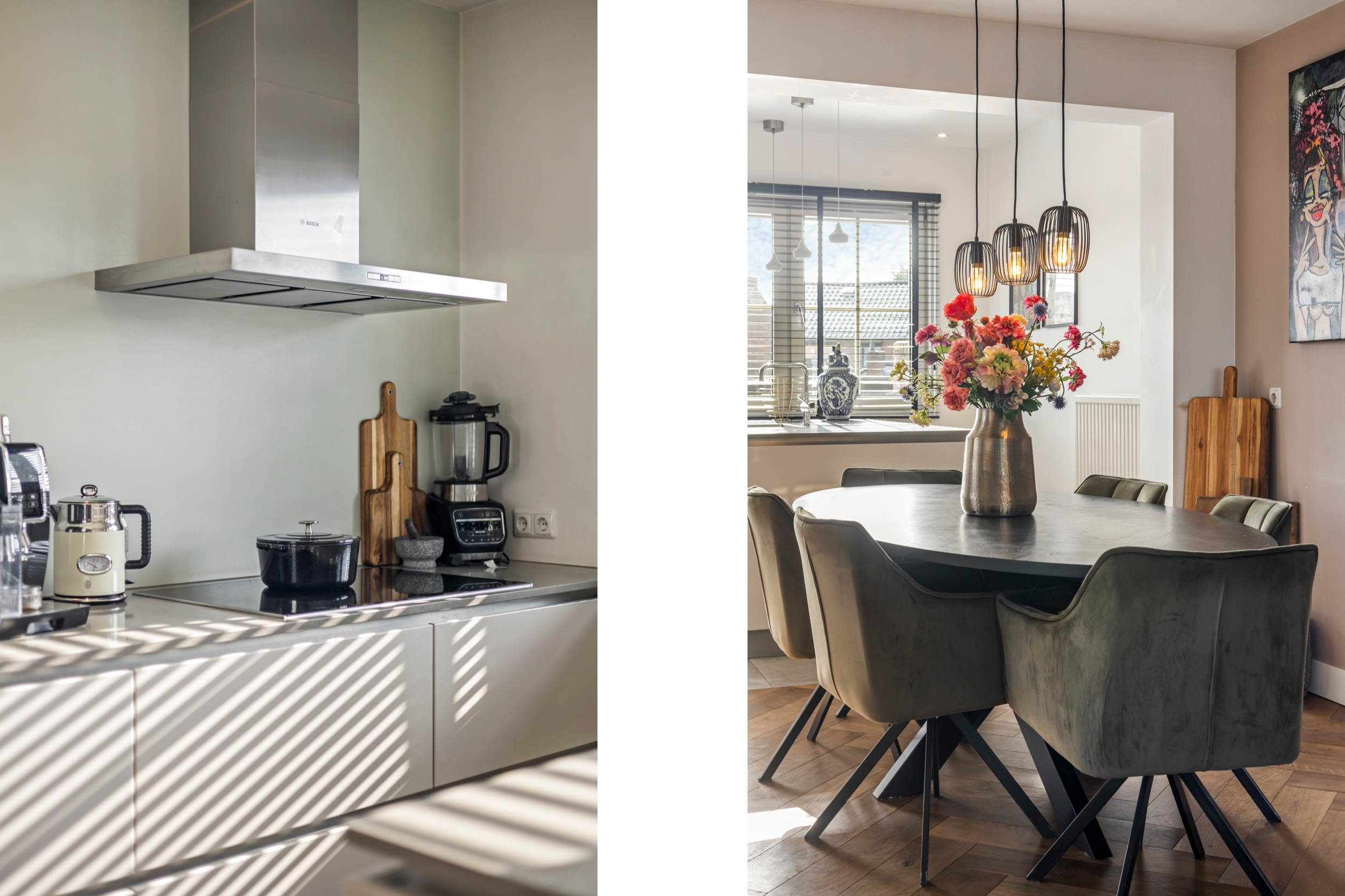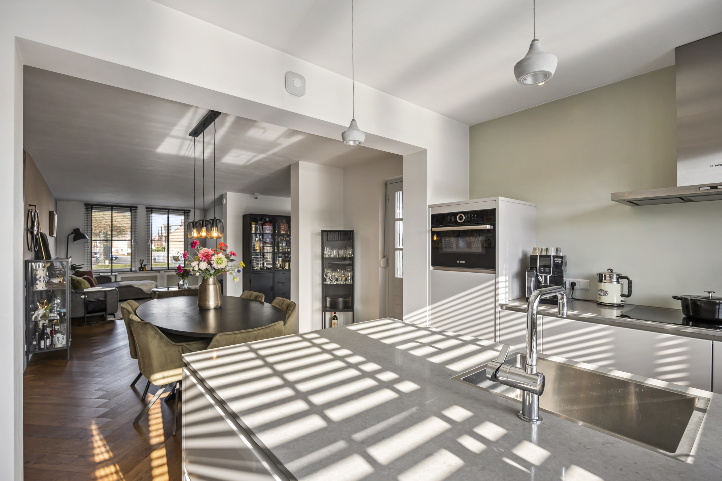 Aan de achterzijde loopt de woonkamer over in de eetkamer, die in open verbinding staat met de keuken. De keuken (2019) is modern en praktisch ingericht met veel werk- en bergruimte. Het spoeleiland vormt het hart van de ruimte – een fijne plek om samen te komen tijdens het koken.
