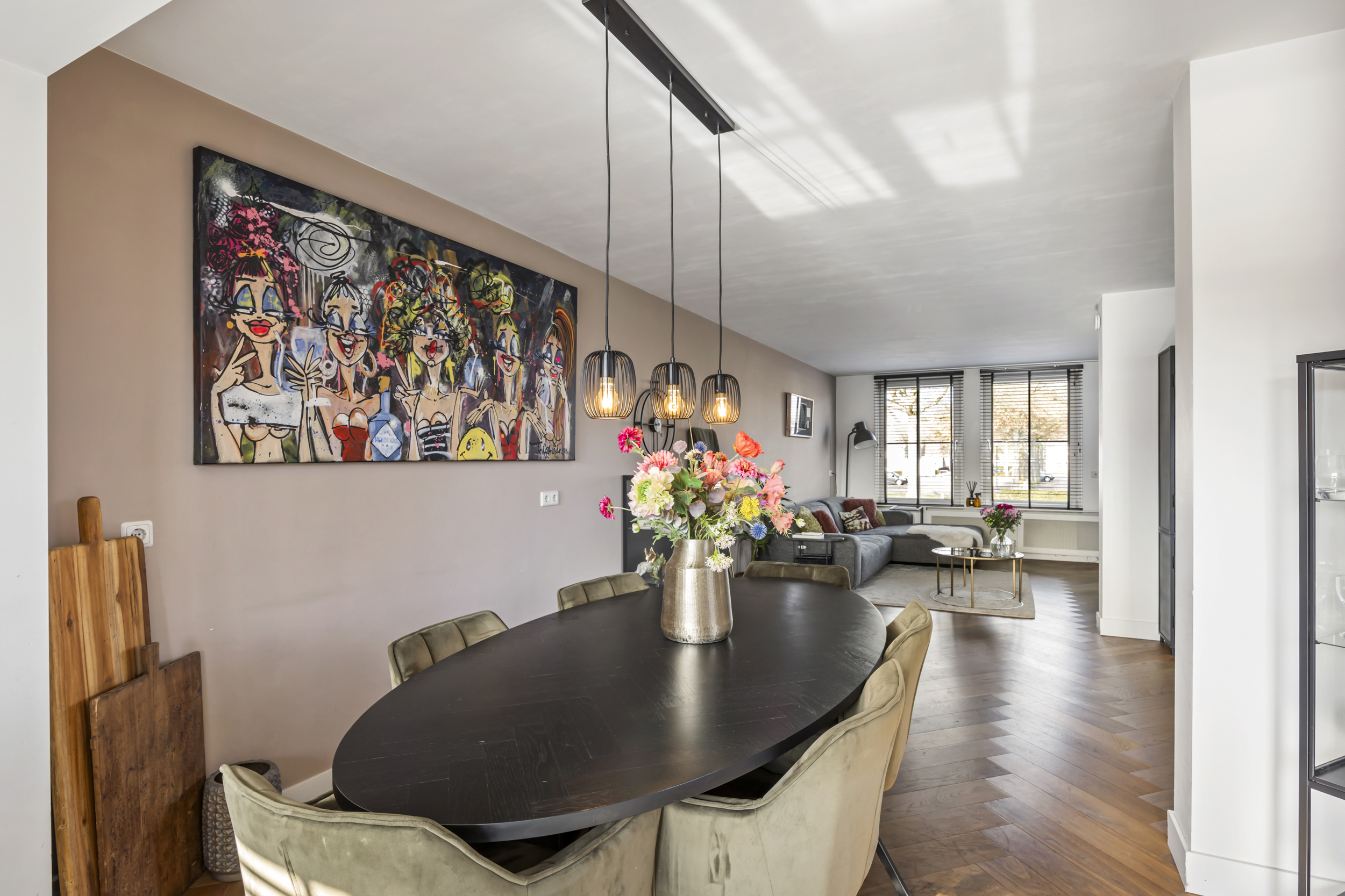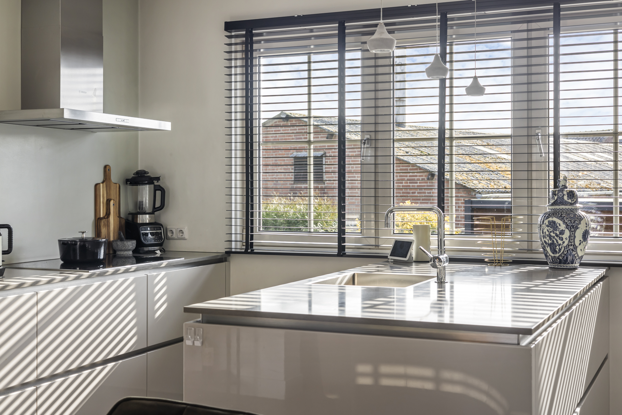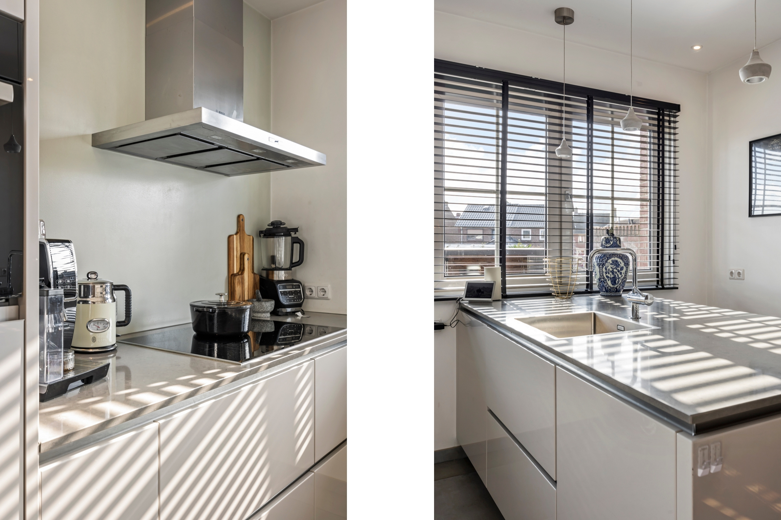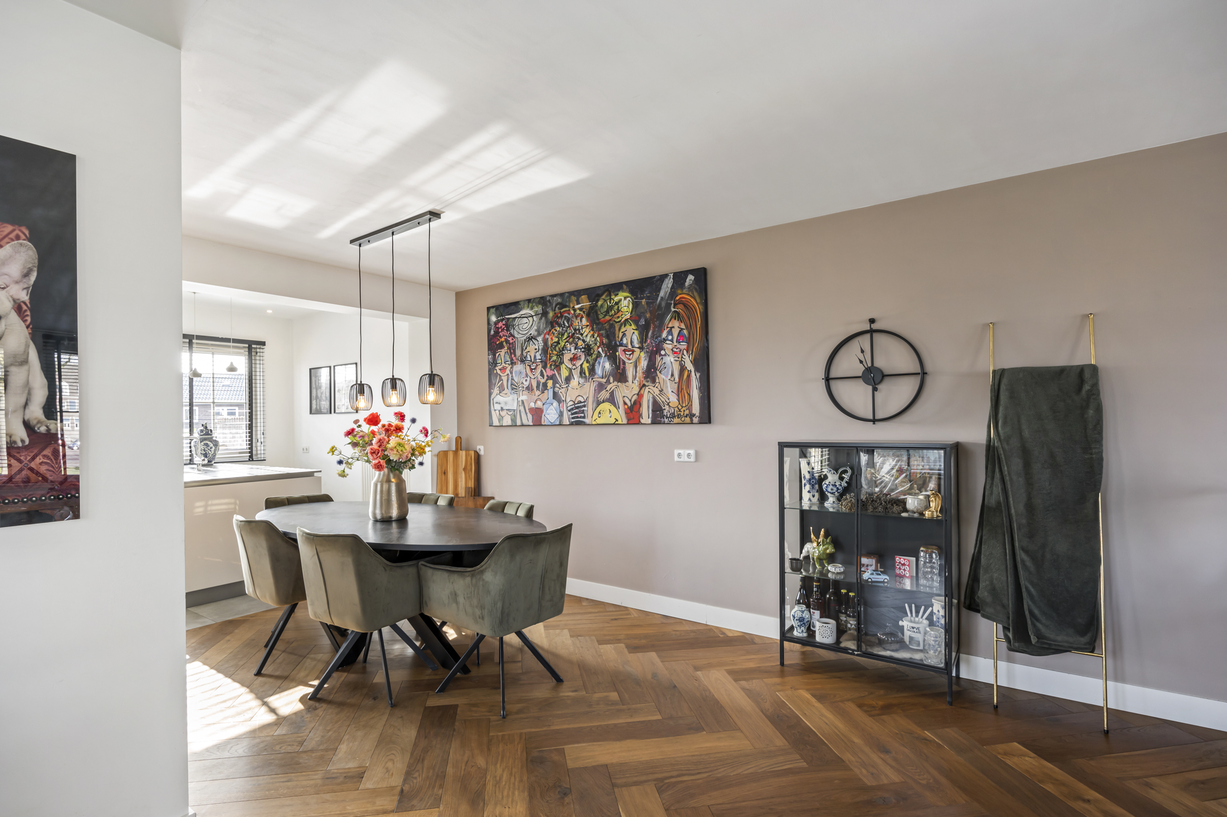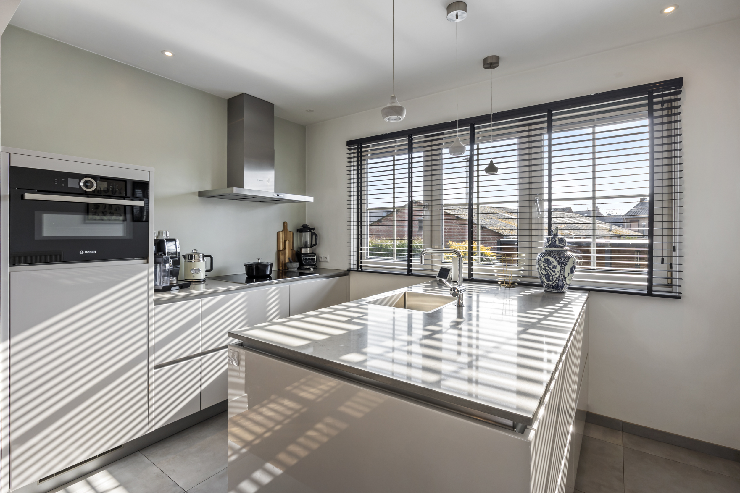 Aan de achterzijde loopt de woonkamer over in de eetkamer, die in open verbinding staat met de keuken. De keuken (2019) is modern en praktisch ingericht met veel werk- en bergruimte. Het spoeleiland vormt het hart van de ruimte – een fijne plek om samen te komen tijdens het koken.