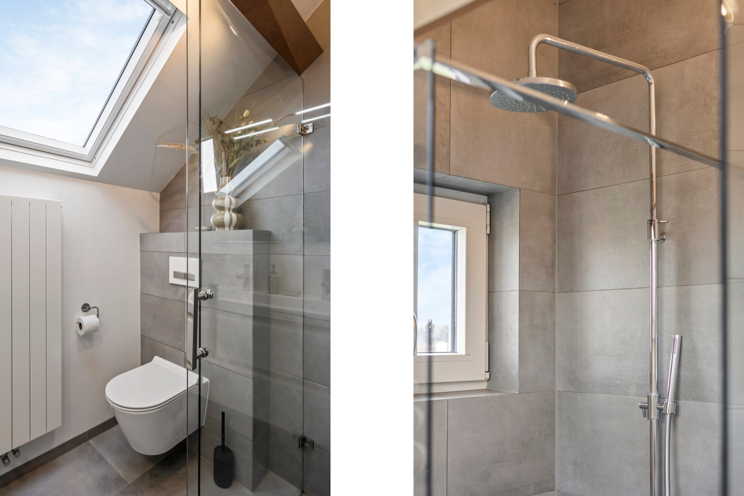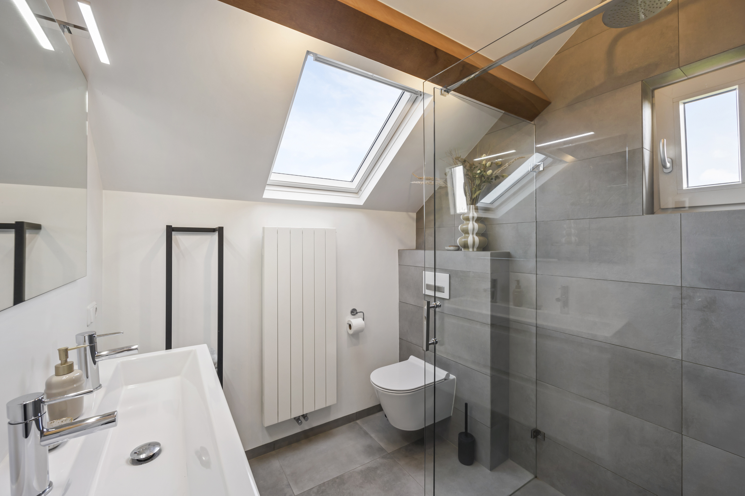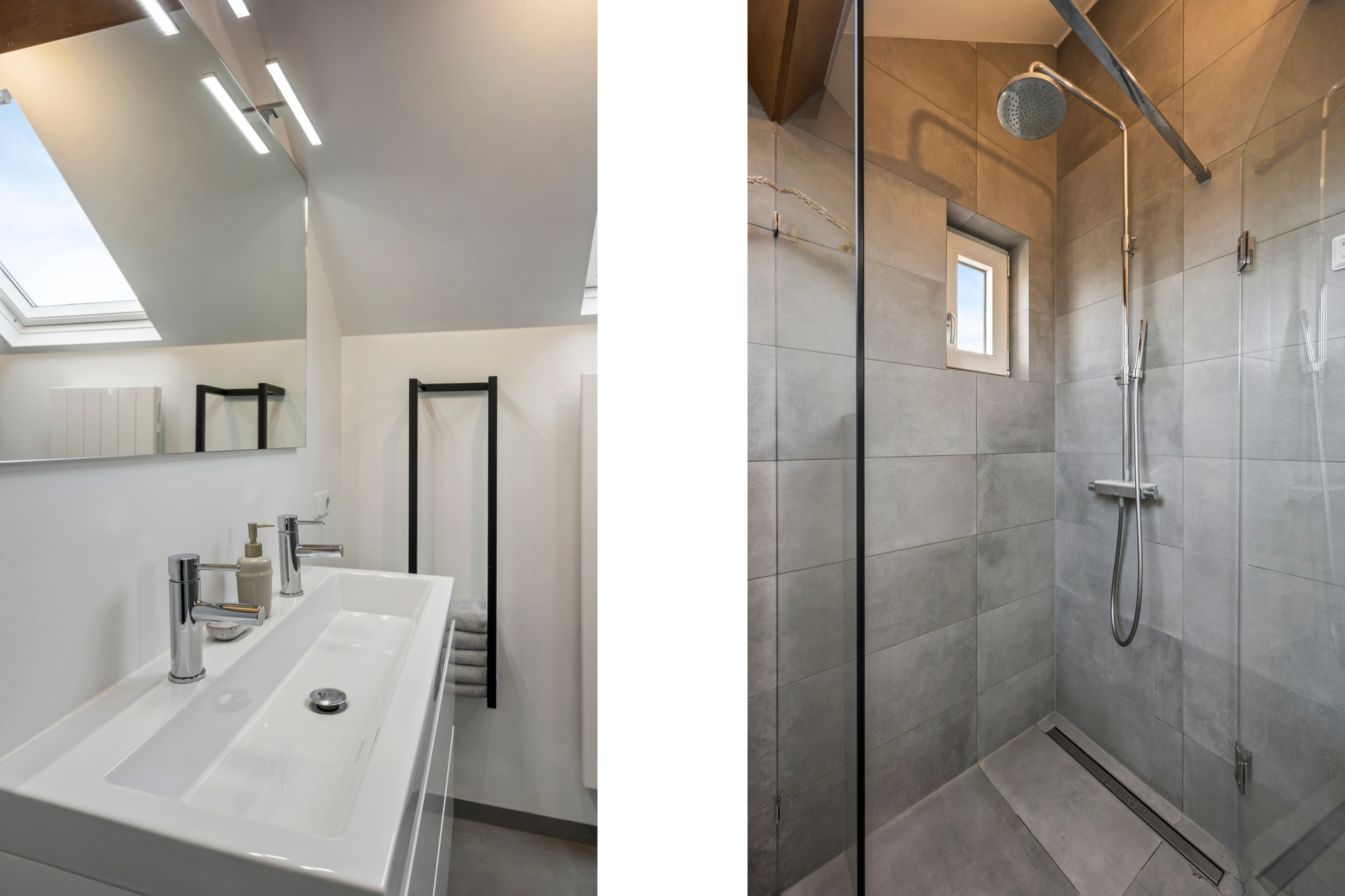 De badkamer is compact maar compleet en voorzien van een inloopdouche, dubbele wastafel met meubel, toilet en elektrische vloerverwarming – comfortabel en praktisch ingericht.