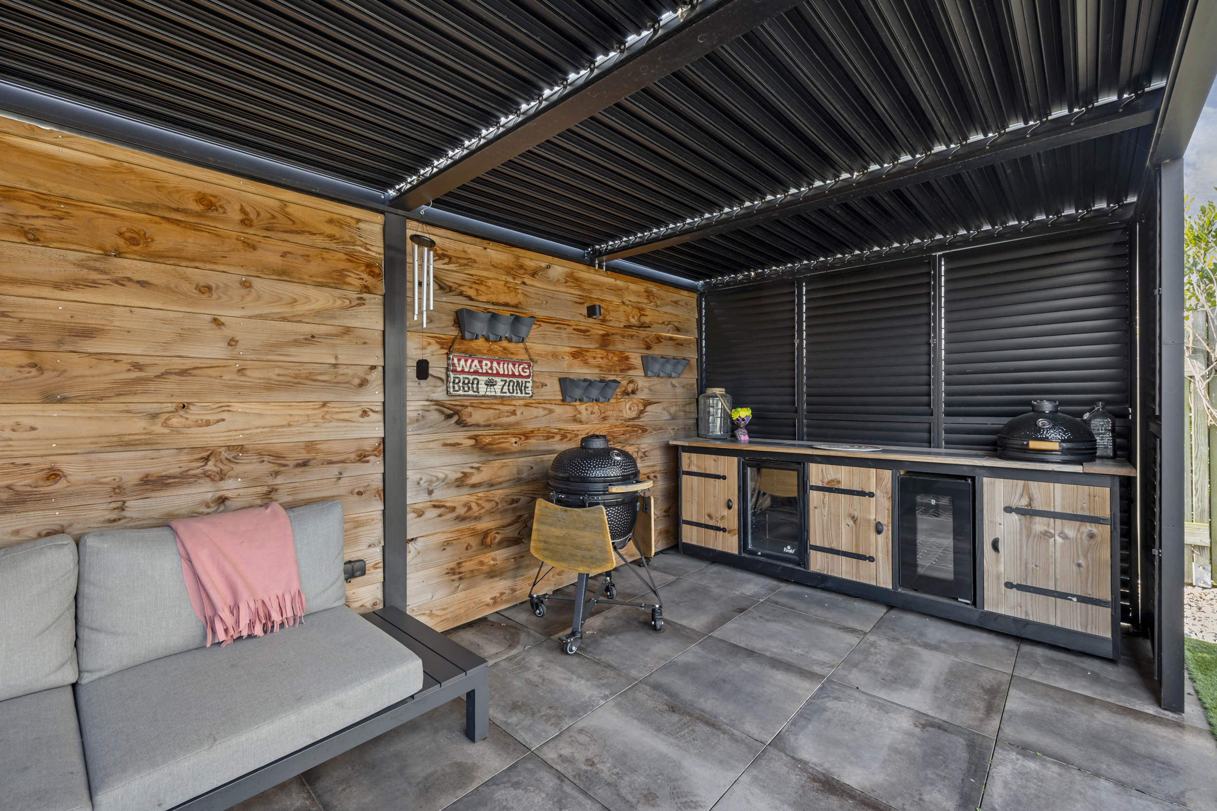In 2024 is een hoogwaardige aluminium overkapping geplaatst, voorzien van stijlvolle shutters en een prachtige buitenkeuken (ter overname). Een plek waar binnen en buiten moeiteloos in elkaar overlopen en waar u het buitenseizoen aanzienlijk verlengt.