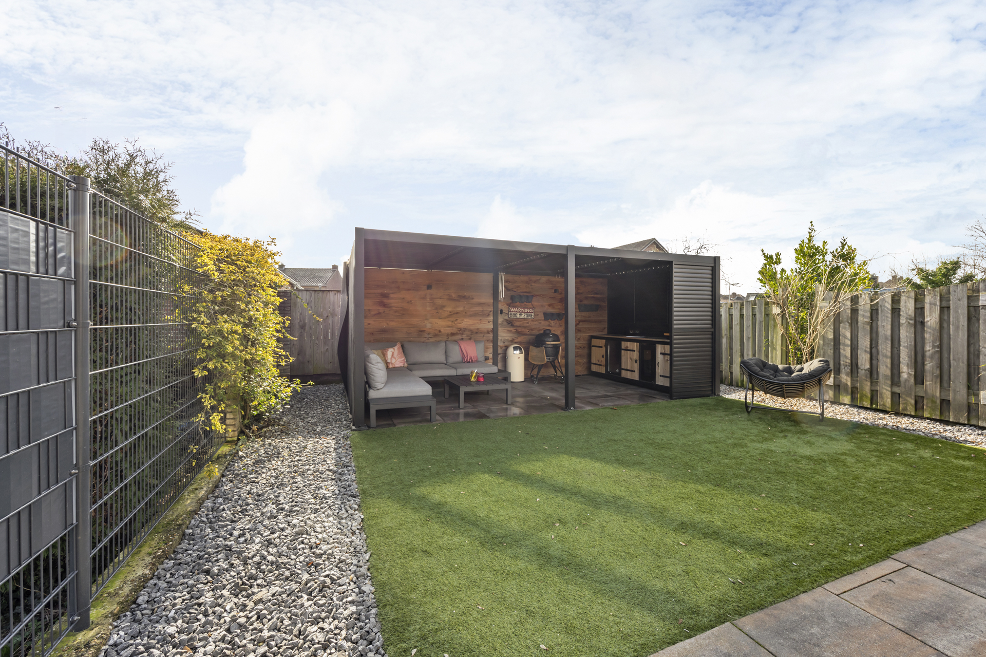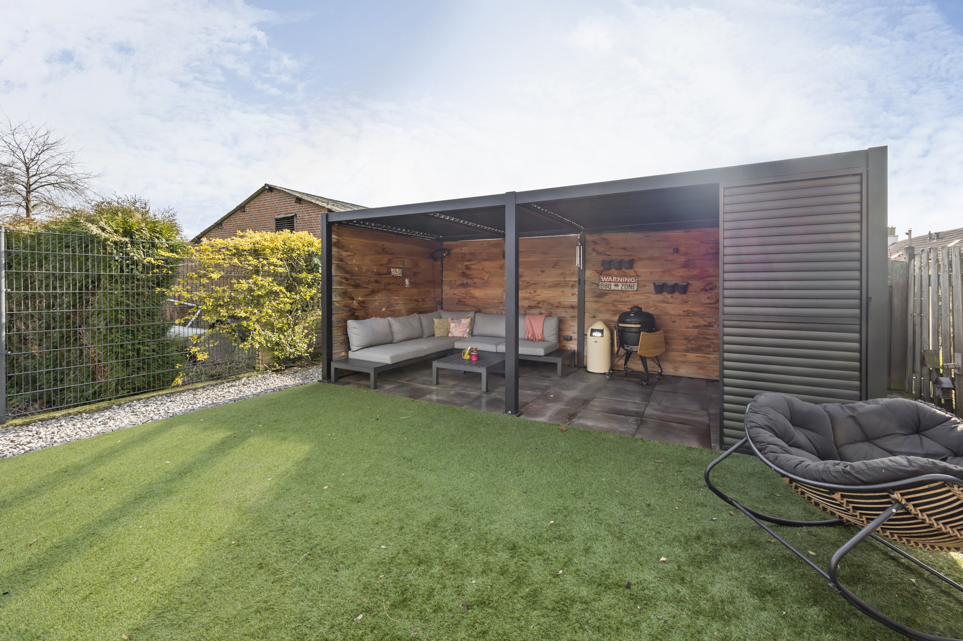 En dan de buitenruimte: als kers op de taart beschikt de woning over een zonnige, op het zuiden gelegen achtertuin met een luxe aluminium overkapping. Een heerlijke plek om te ontspannen en te genieten van het buitenleven, met extra comfort dankzij de shutters en de aanwezige buitenkeuken (ter overname).