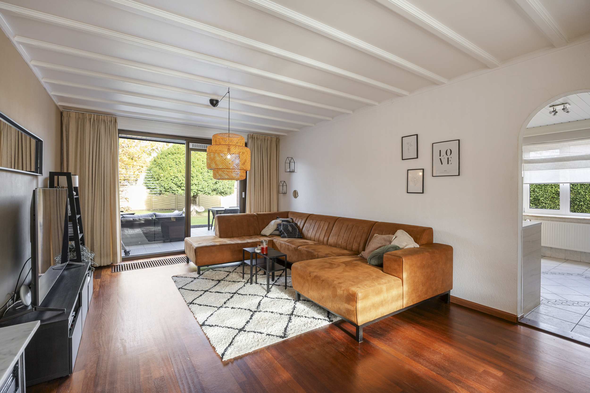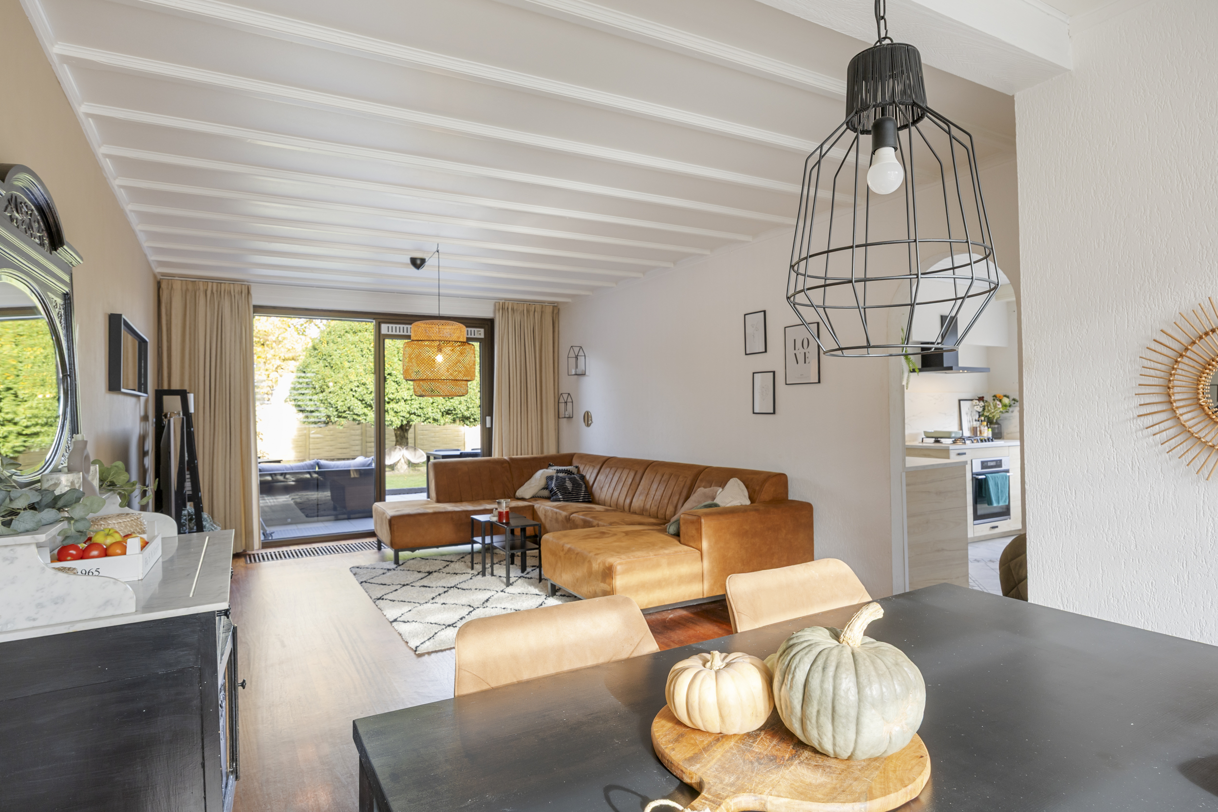 Vanuit de hal betreed je de sfeervolle en lichte doorzonwoonkamer met royale aanbouw (32m²), voorzien van een fraaie parketvloer. De grote schuifpui aan de achterzijde zorgt niet alleen voor veel lichtinval, maar geeft ook direct toegang tot het overdekt terras en de tuin – ideaal voor wie binnen en buiten graag met elkaar verbindt.